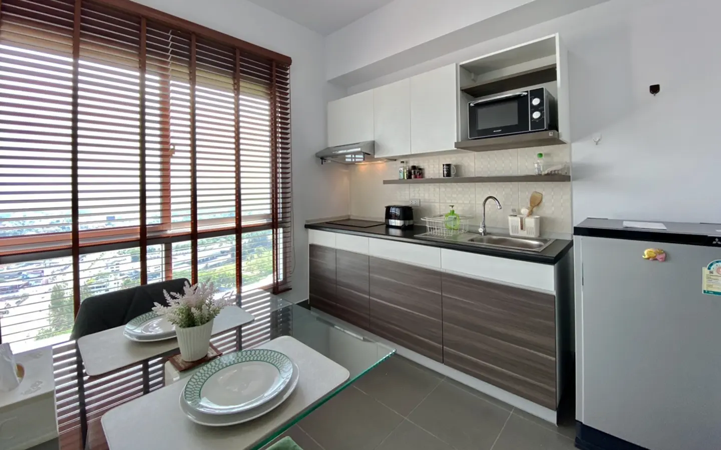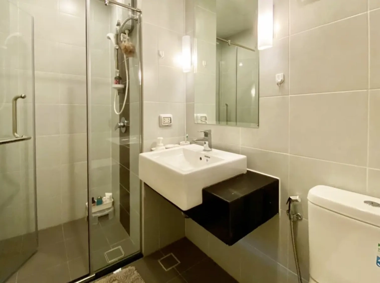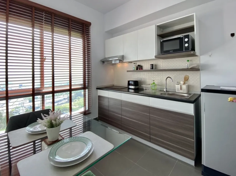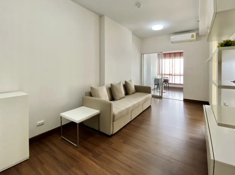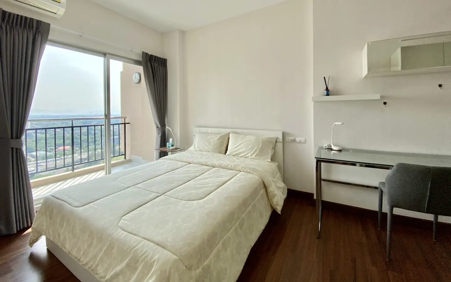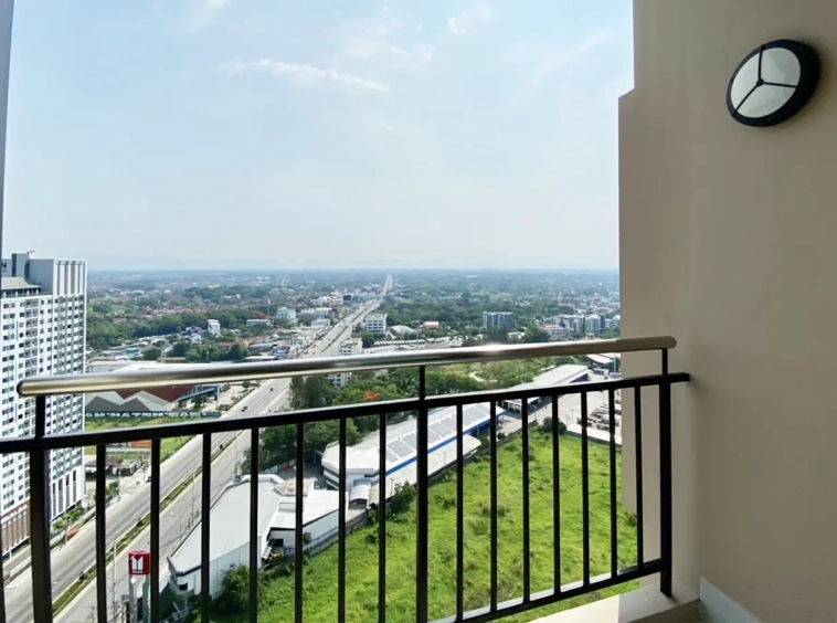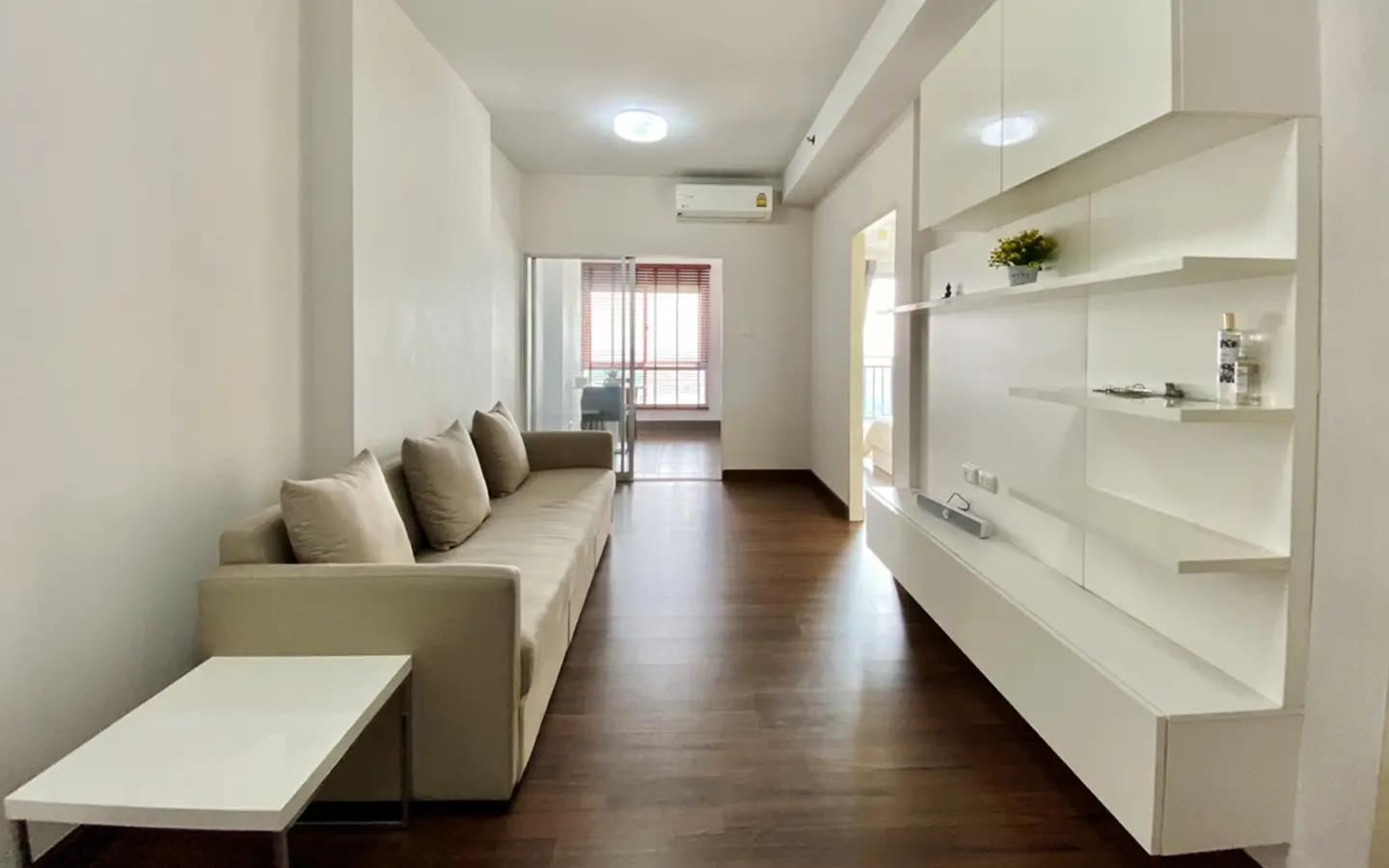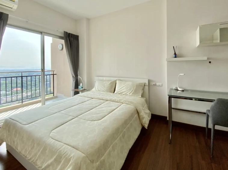 Situated on the 28th floor, the unit comprises of proper and decent size Western kitchenette that can be closed off from a living room by sliding doors, it comes with breakfast table and window with a view of Doi Saket. The living room is furnished with sofa, built-in wall unit and a/c. The bedroom has a small balcony and comes with a closet, working desk and a/c. The bathroom has a walk-in shower. The apartment is simple but nicely decorated.