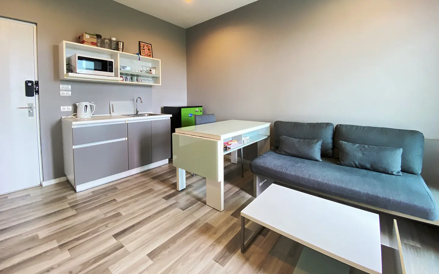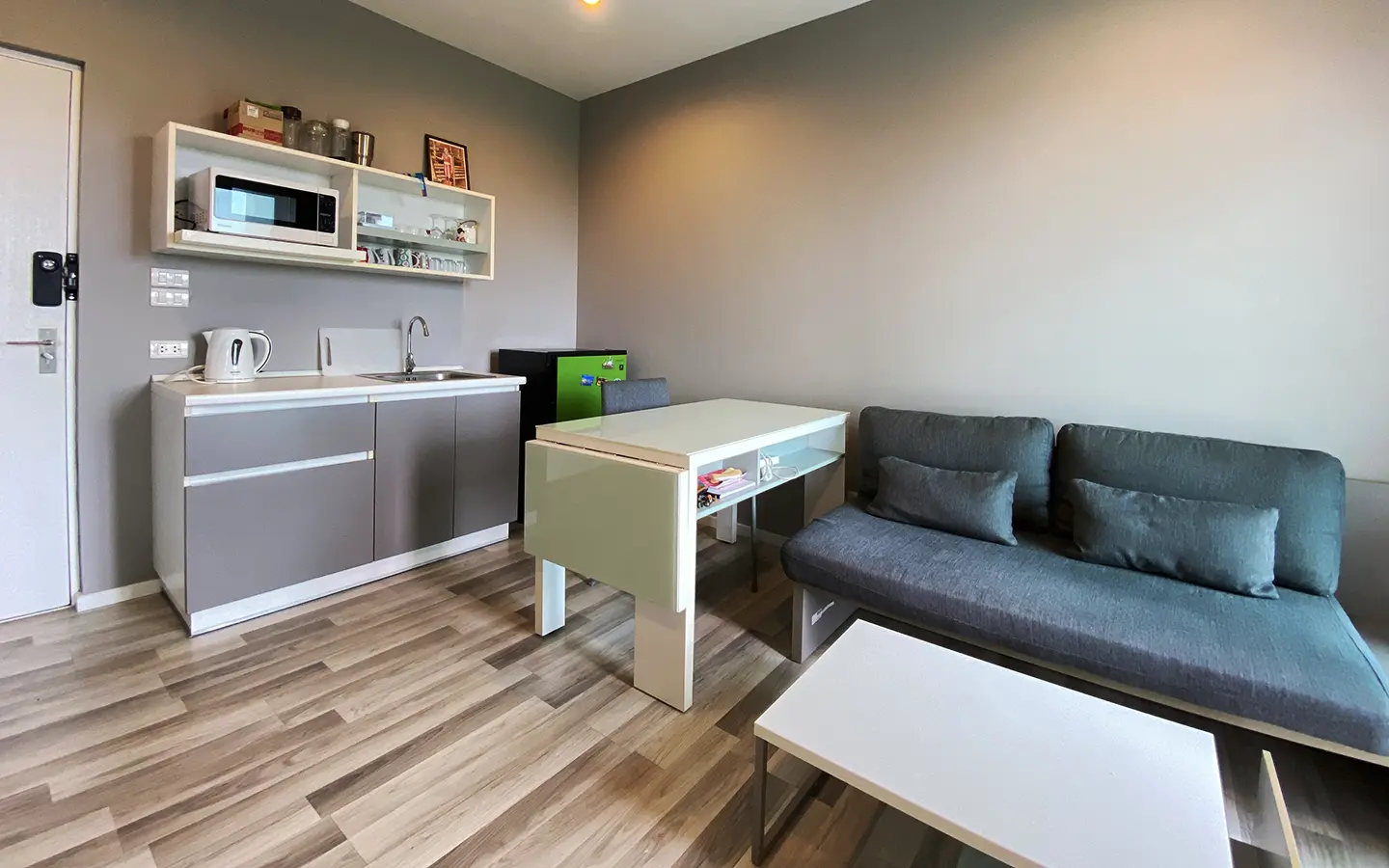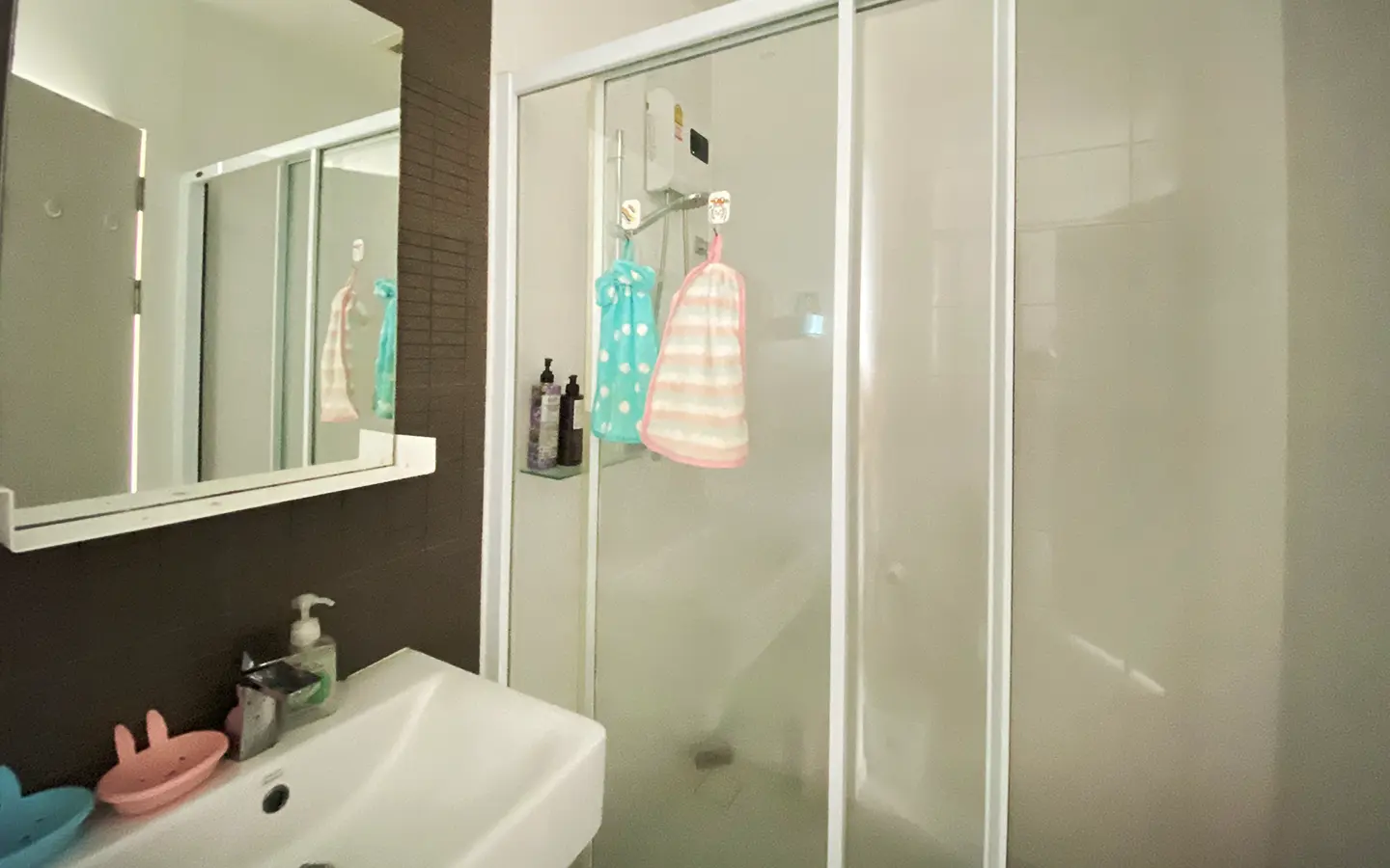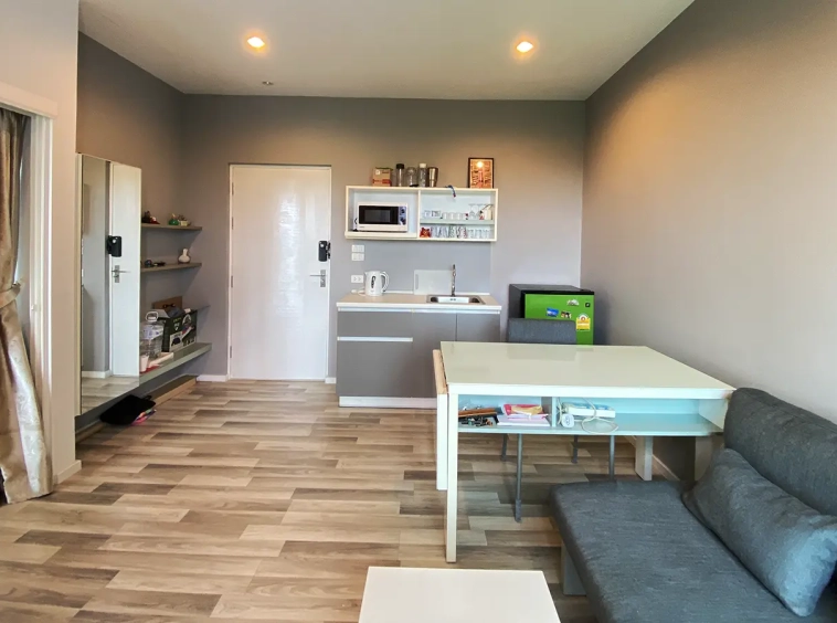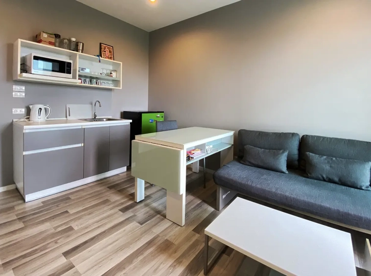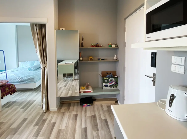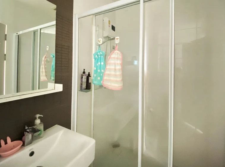 The unit has been used sparingly, as the owner resides overseas, and remains in good condition. Upon entering, you’ll find a functional kitchen, a cosy living area, and access to a private balcony equipped with a washing machine. The unit also features a bedroom with an en-suite bathroom.
