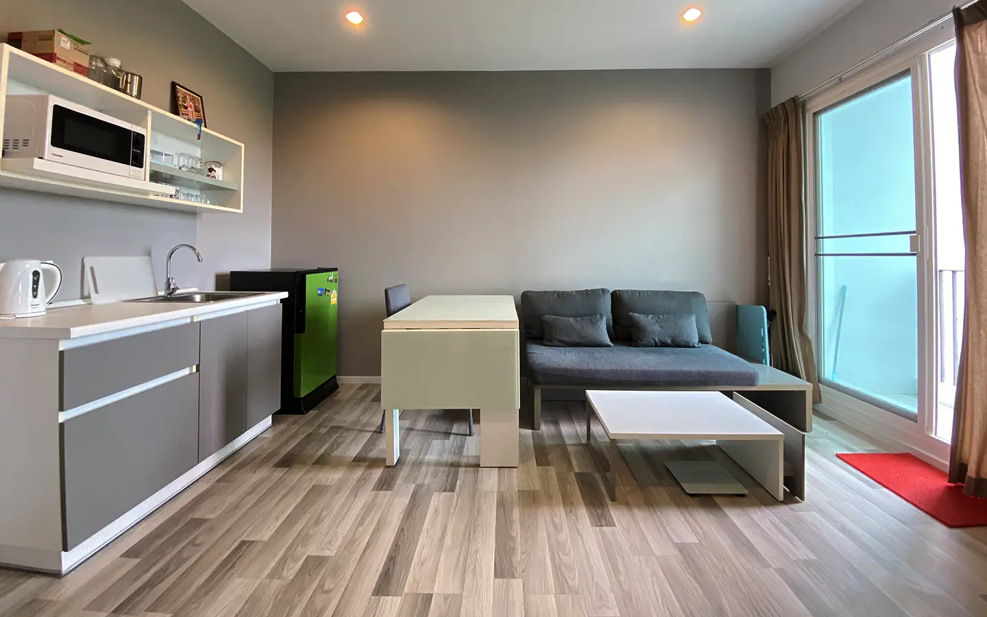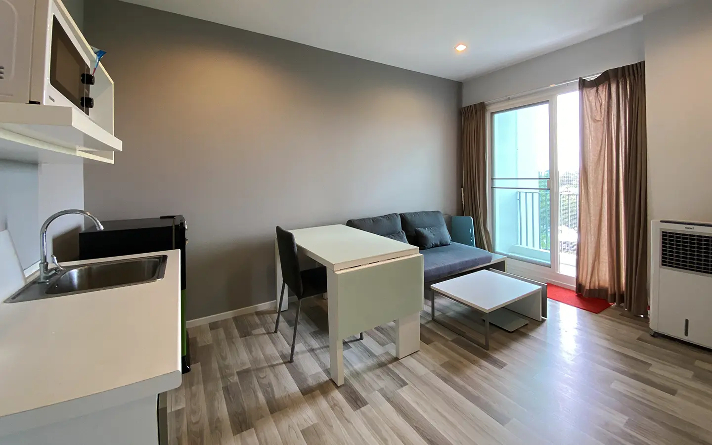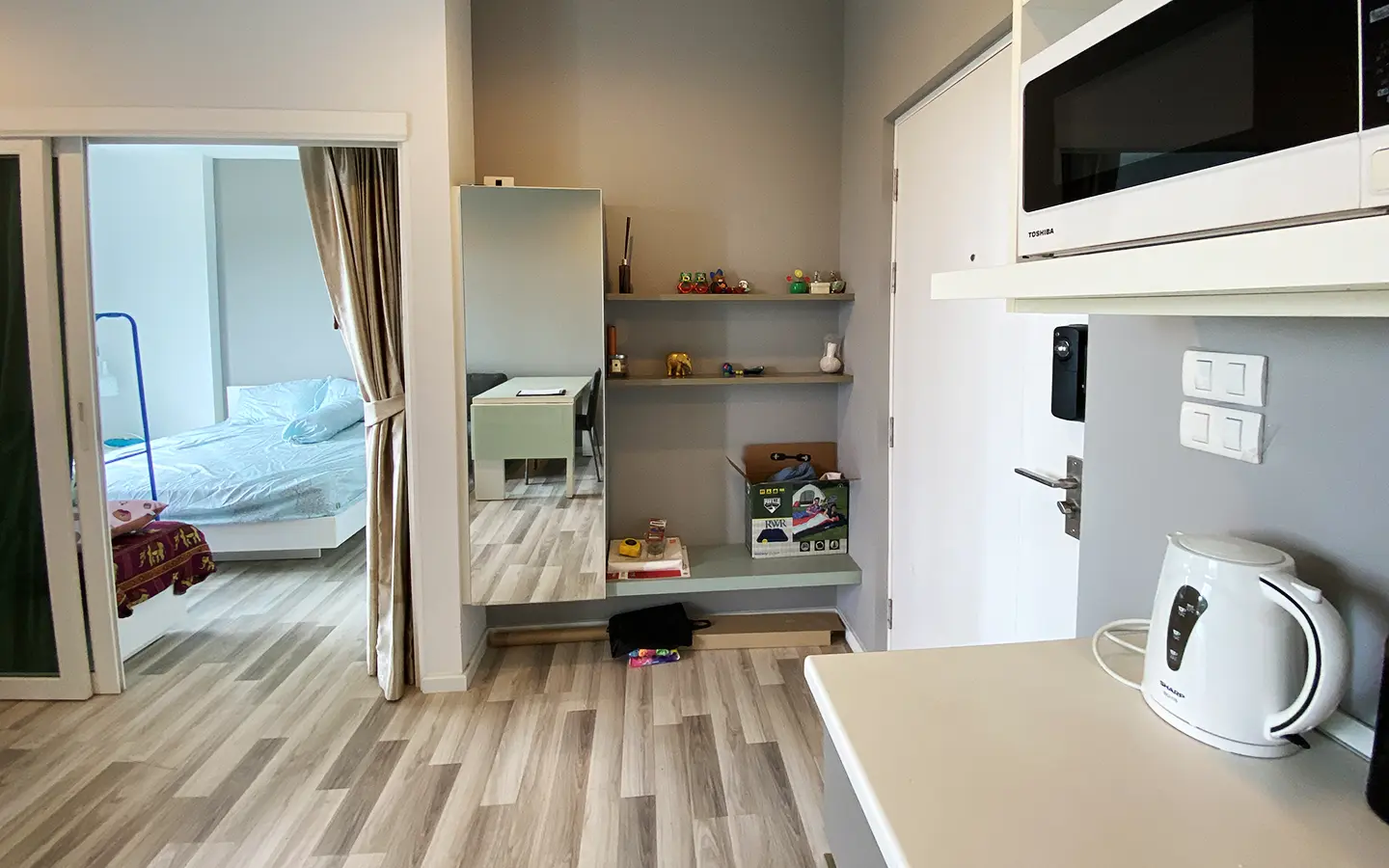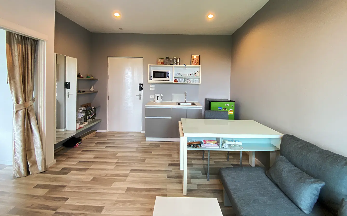 The unit has been used sparingly, as the owner resides overseas, and remains in good condition. Upon entering, you’ll find a functional kitchen, a cosy living area, and access to a private balcony equipped with a washing machine. The unit also features a bedroom with an en-suite bathroom.