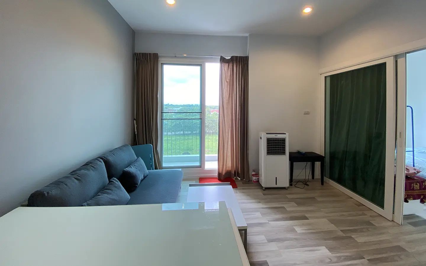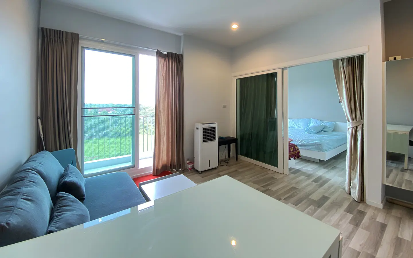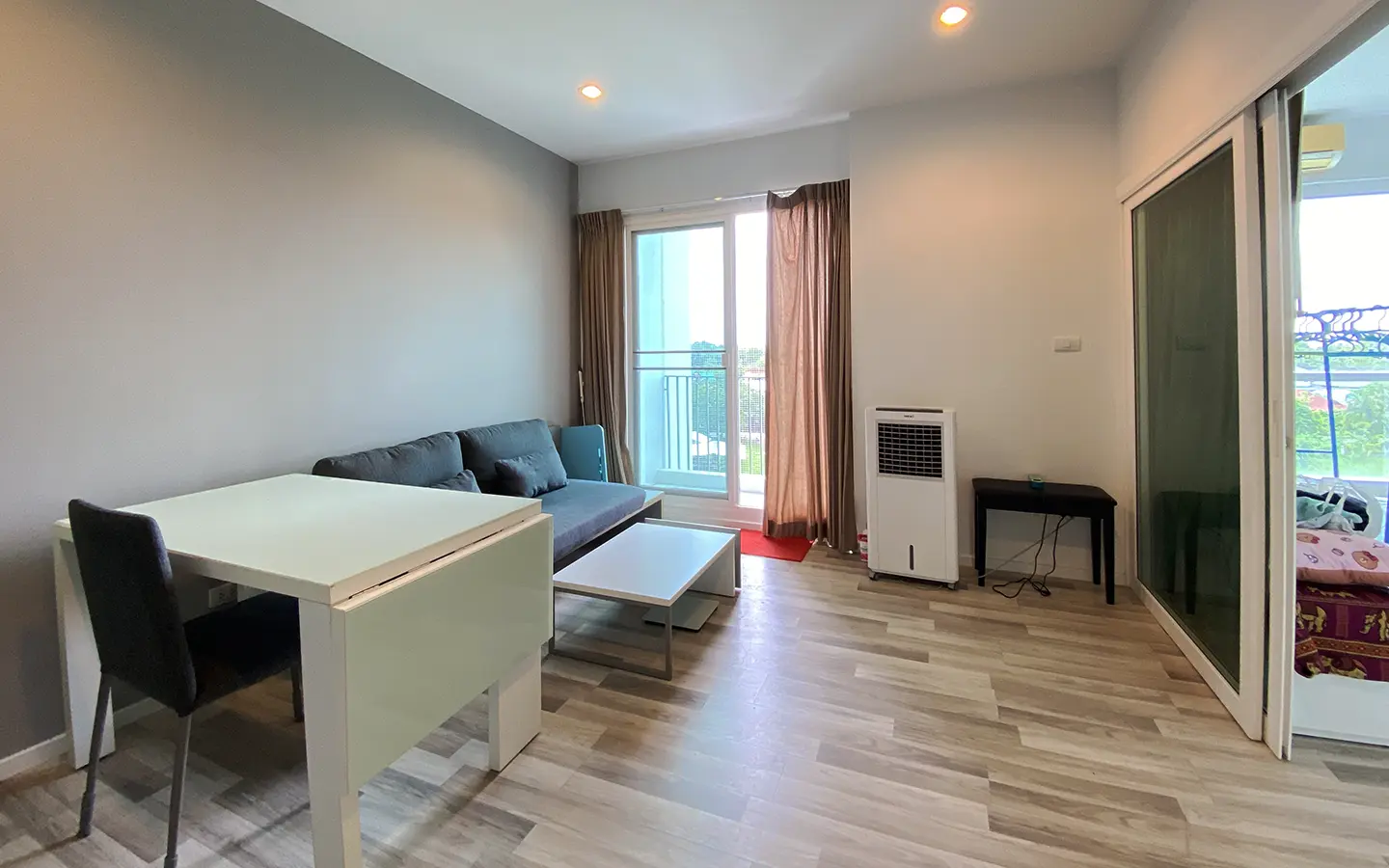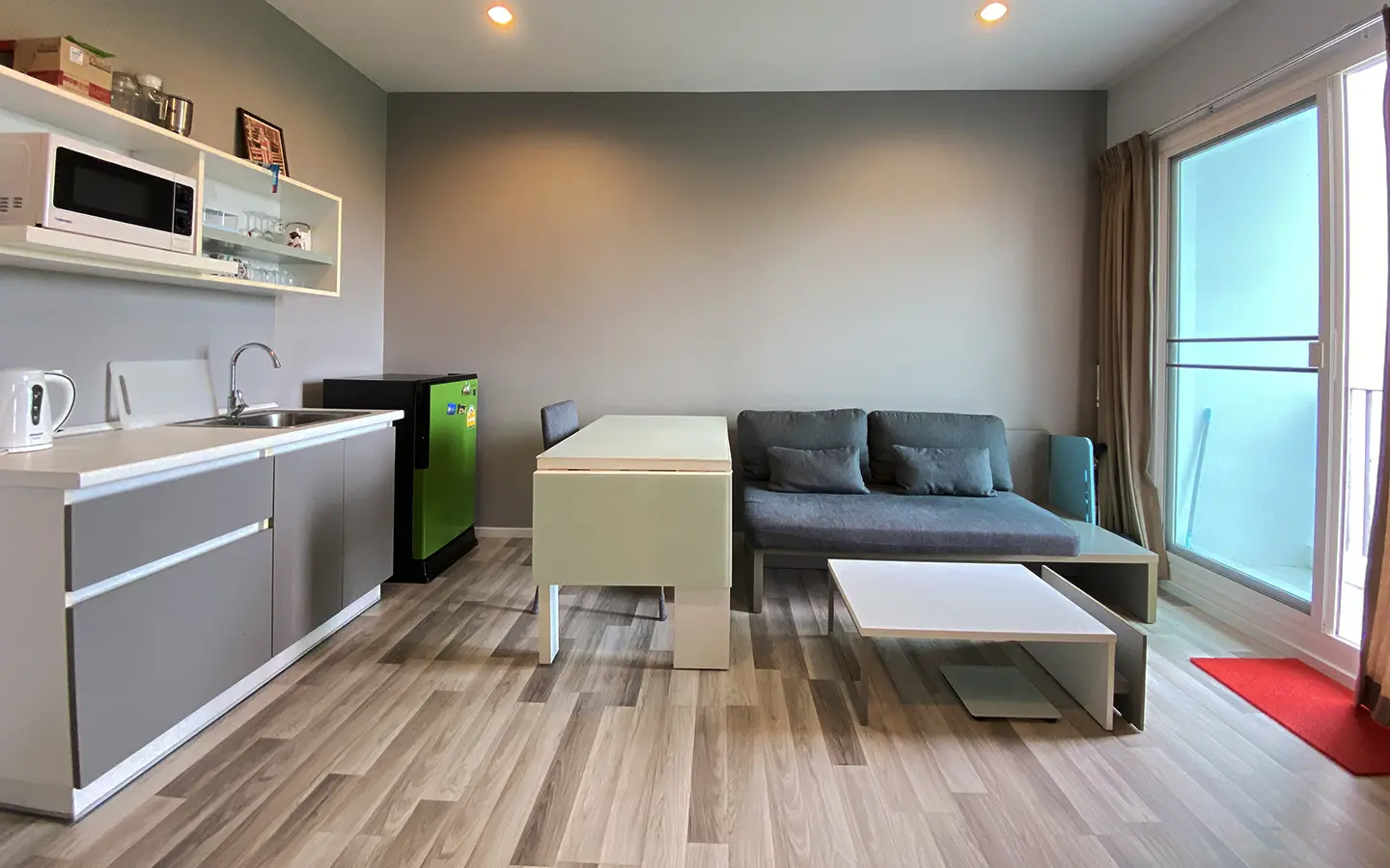 The unit has been used sparingly, as the owner resides overseas, and remains in good condition. Upon entering, you’ll find a functional kitchen, a cosy living area, and access to a private balcony equipped with a washing machine. The unit also features a bedroom with an en-suite bathroom.