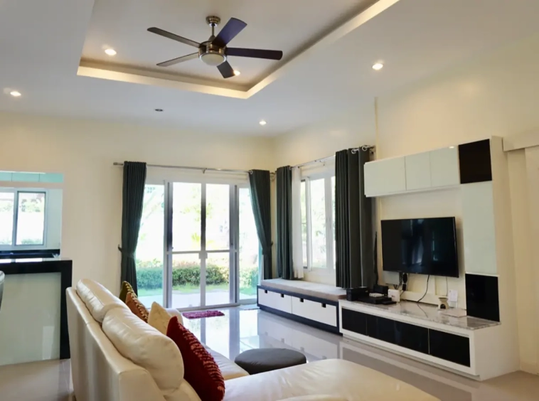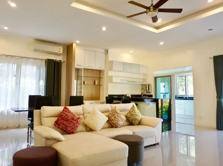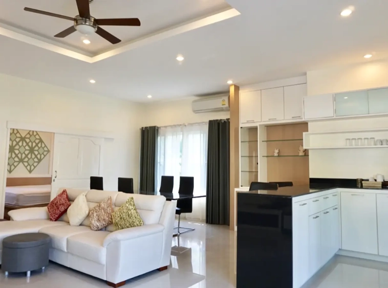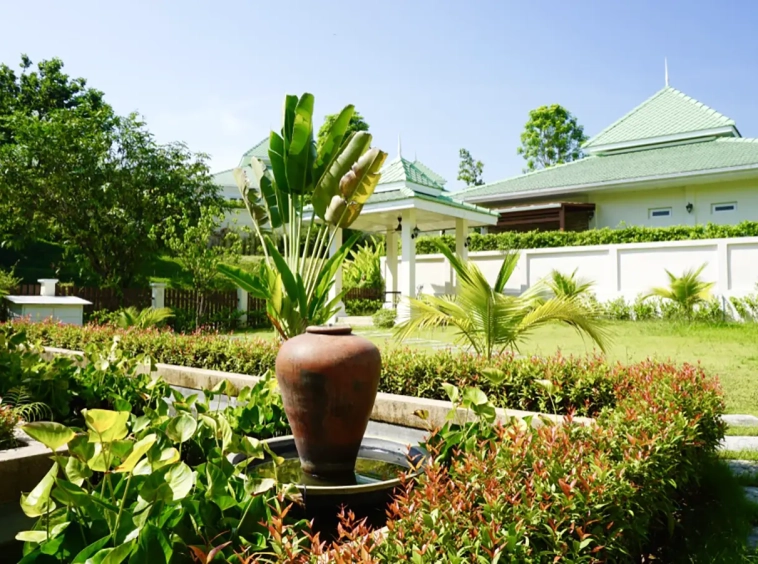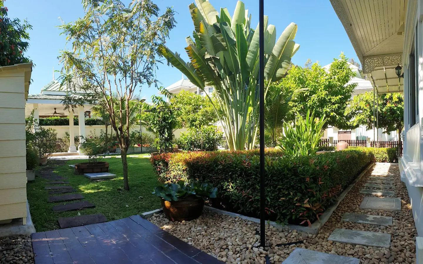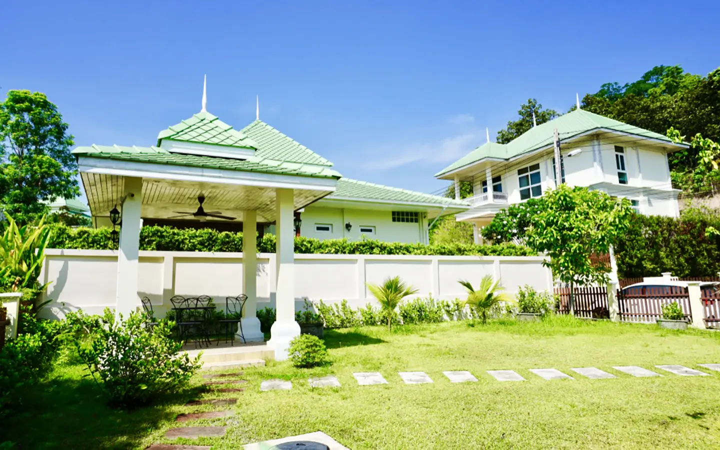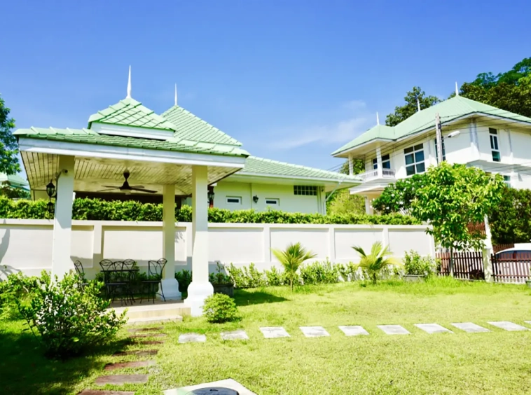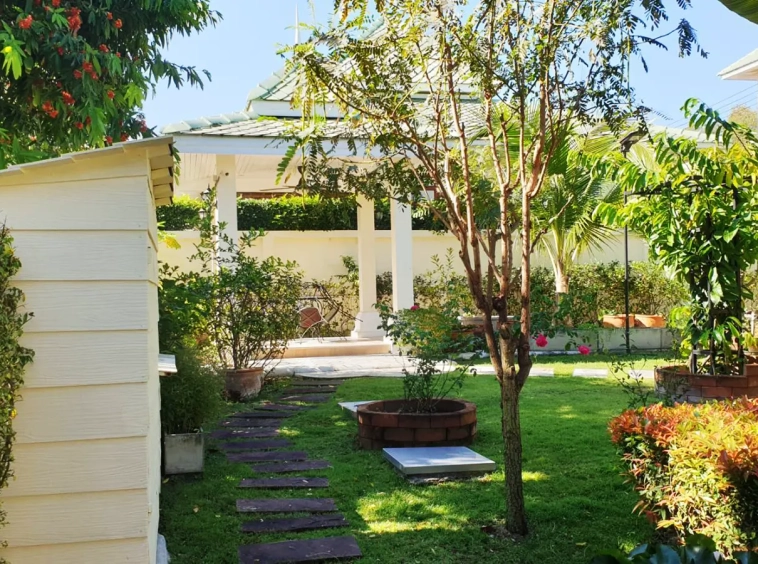 The property has a large beautifully kept landscaped garden featuring a pond and gazebo and pathway around the house. Inside, the open plan living is bright with good lighting and high-quality built-ins and furniture, dining area, living area and modern Western kitchen with built-in hob and oven. Separate pantry with washing machine and refrigerator. The first bedroom has a walk-through closet and ensuite with a shower. Beautiful wood parquet flooring. The second bedroom also is ensuite. There are a/c and ceiling fans in every room and very tastefully decorated throughout.