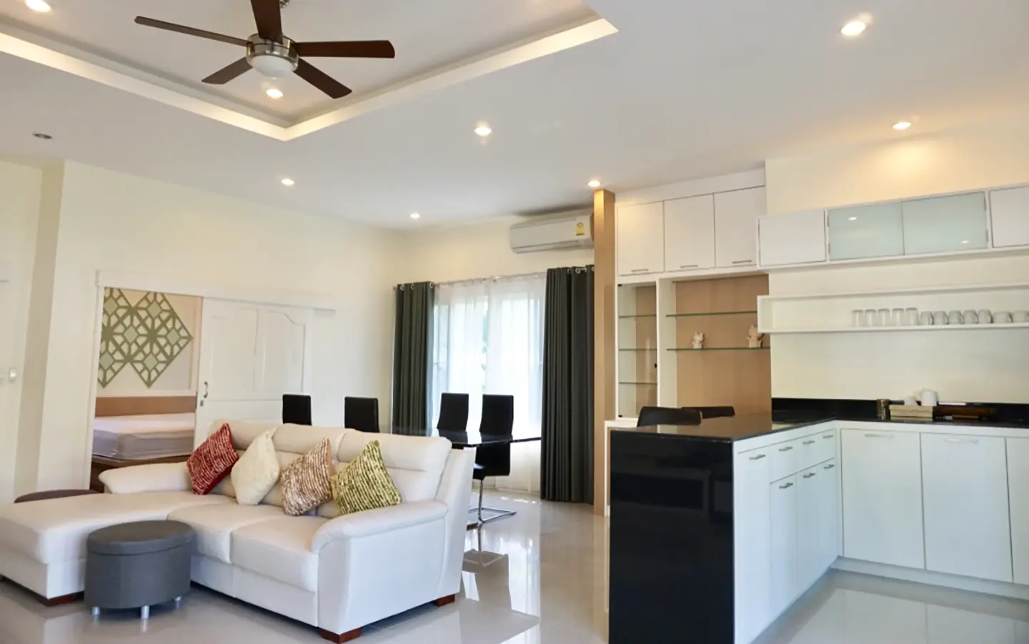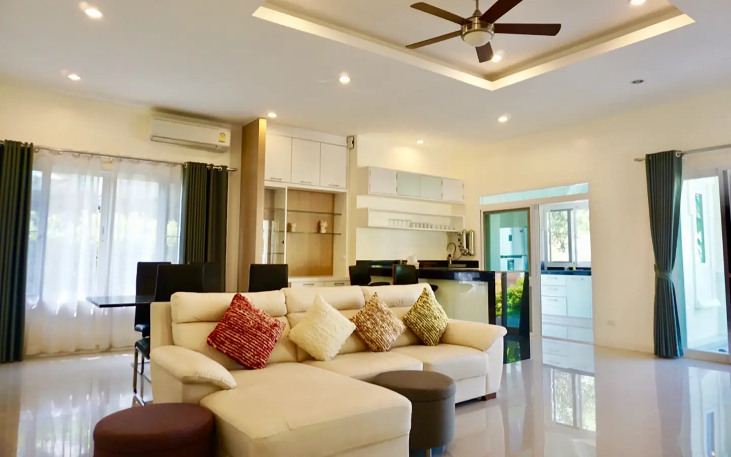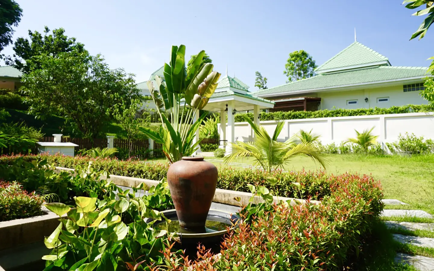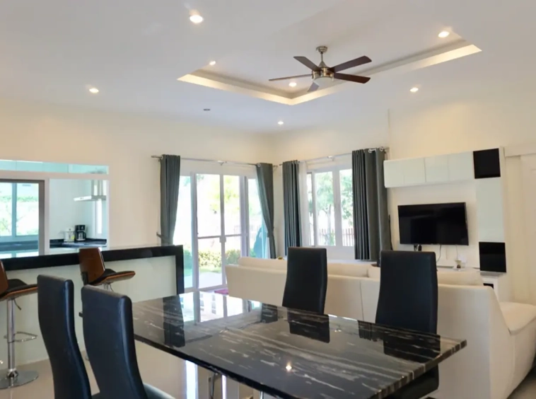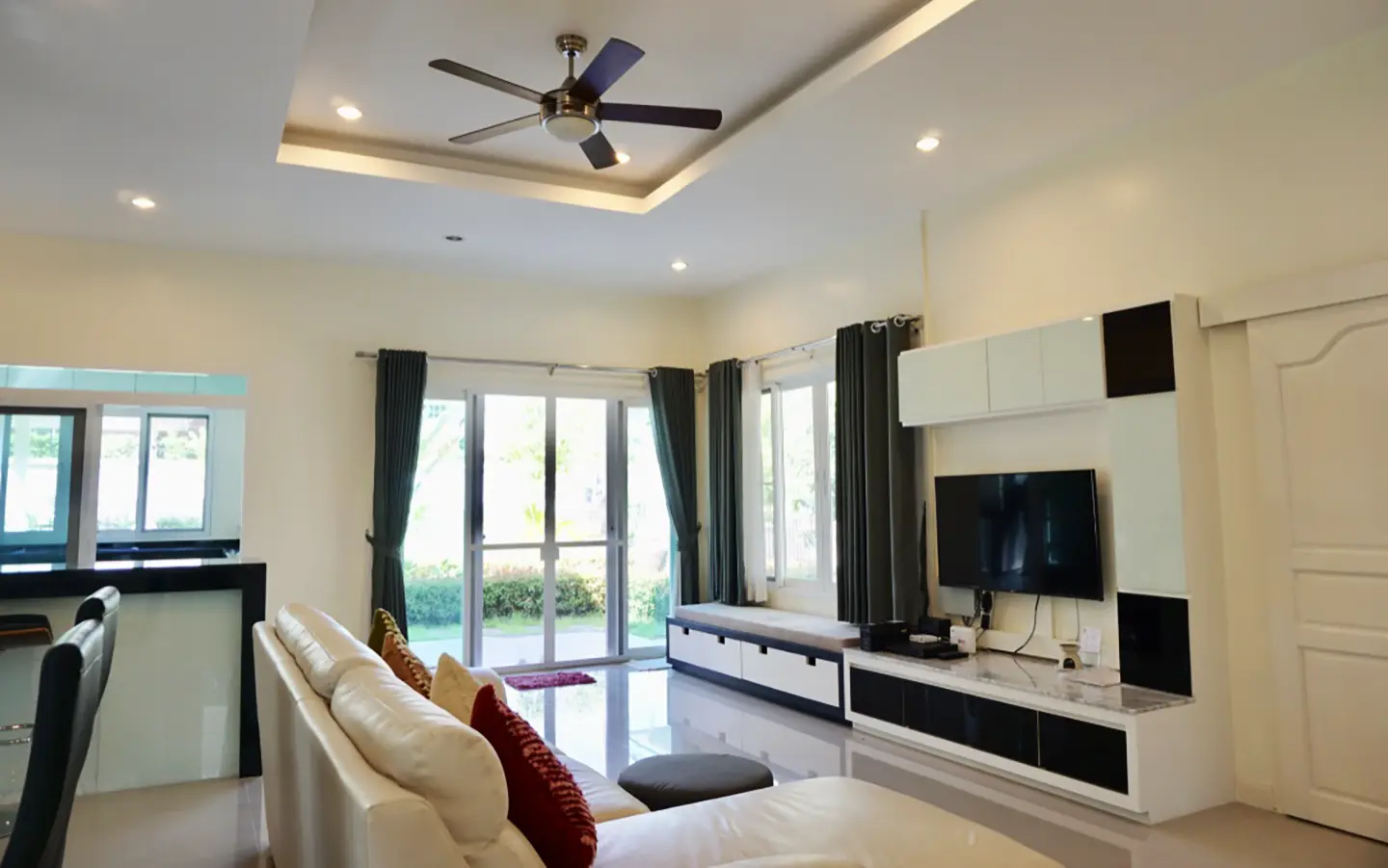 The property has a large beautifully kept landscaped garden featuring a pond and gazebo and pathway around the house. Inside, the open plan living is bright with good lighting and high-quality built-ins and furniture, dining area, living area and modern Western kitchen with built-in hob and oven. Separate pantry with washing machine and refrigerator. The first bedroom has a walk-through closet and ensuite with a shower. Beautiful wood parquet flooring. The second bedroom also is ensuite. There are a/c and ceiling fans in every room and very tastefully decorated throughout.