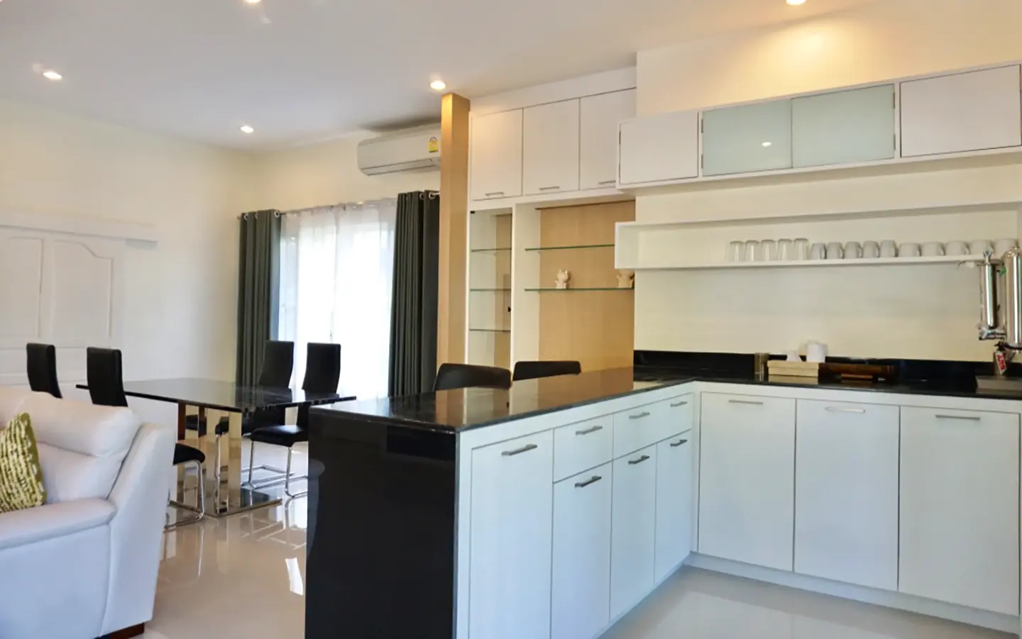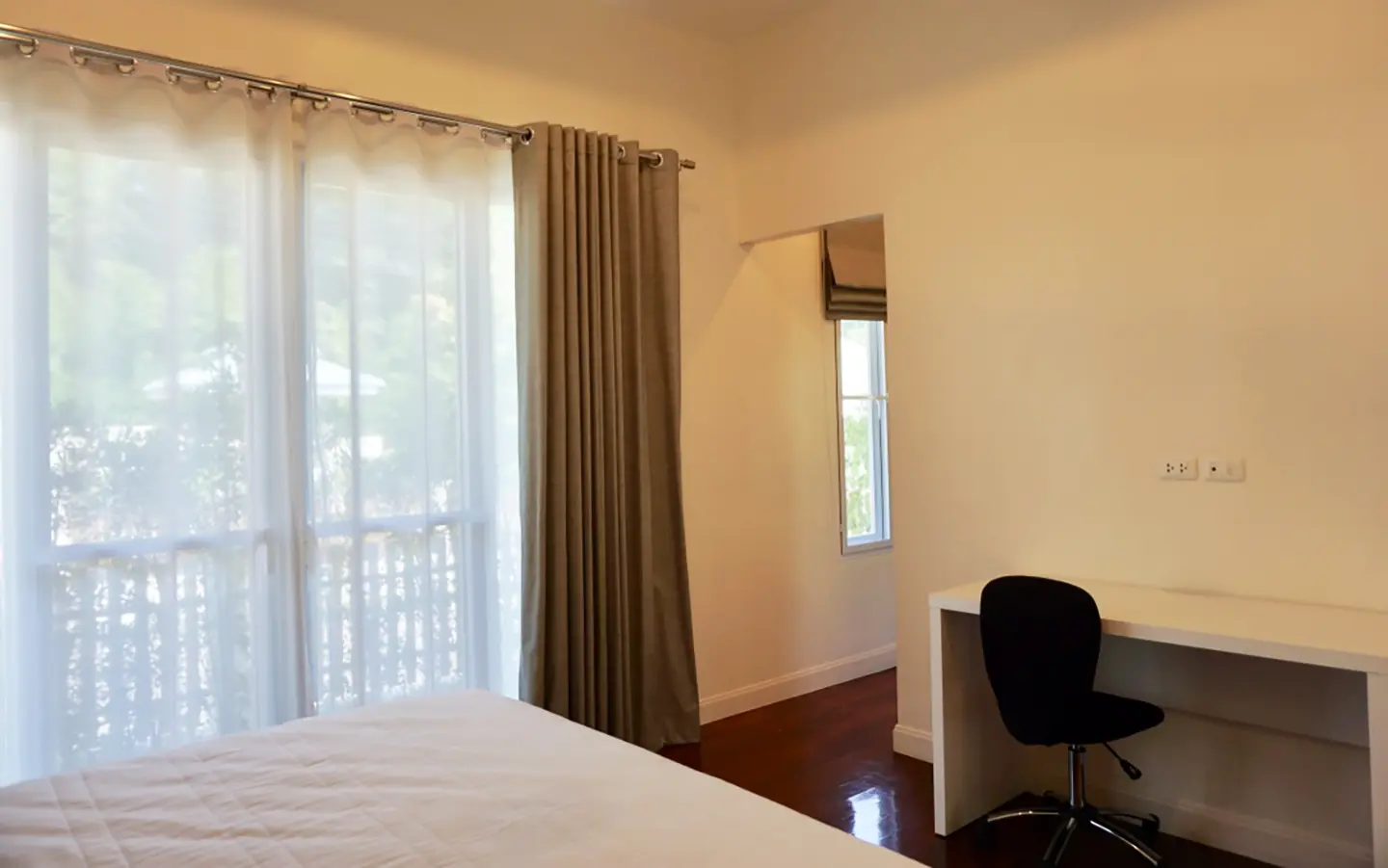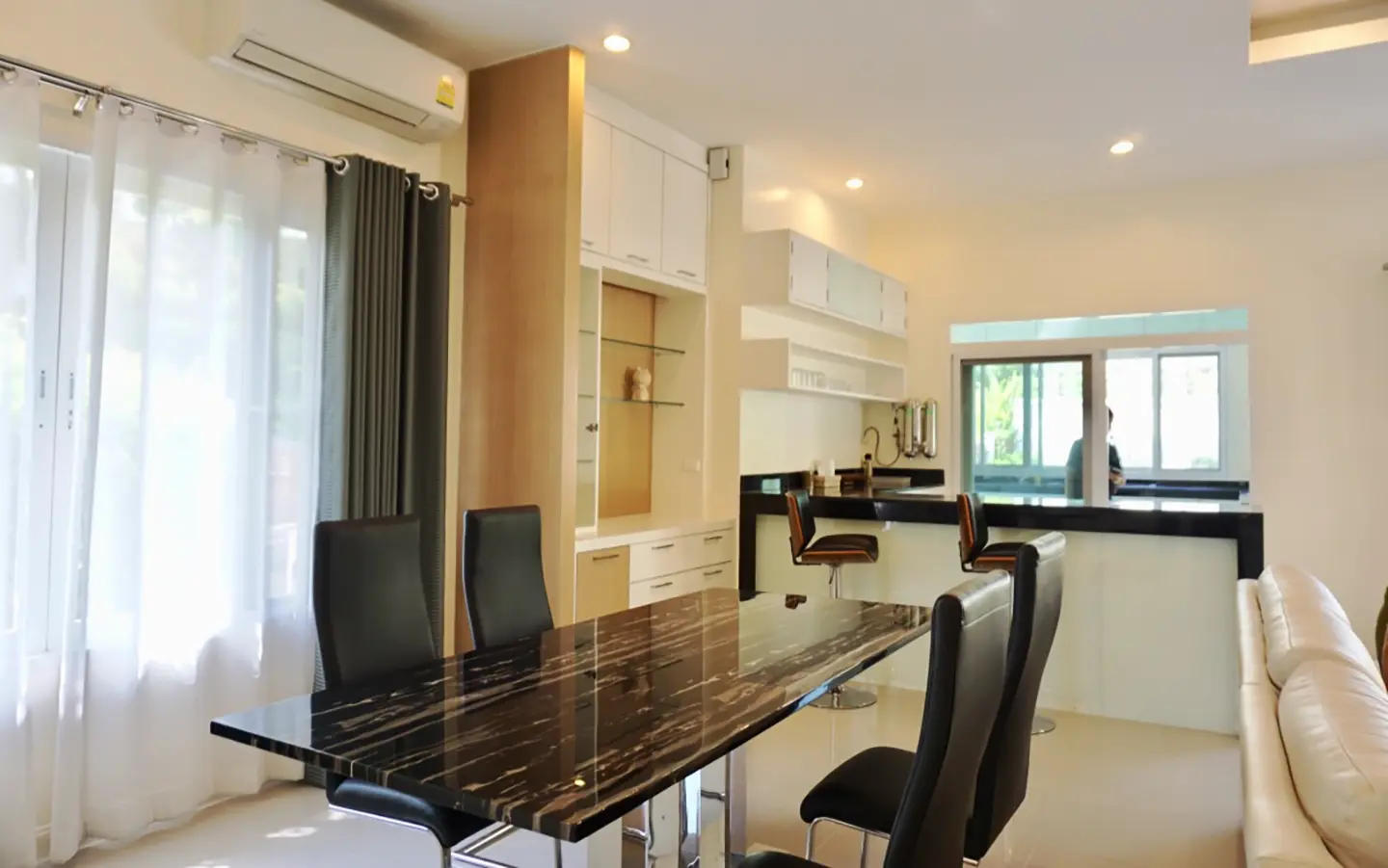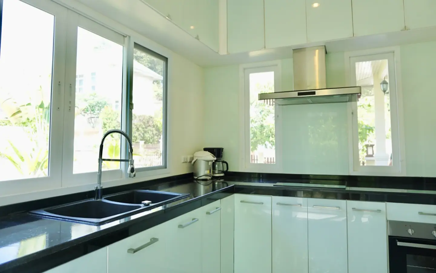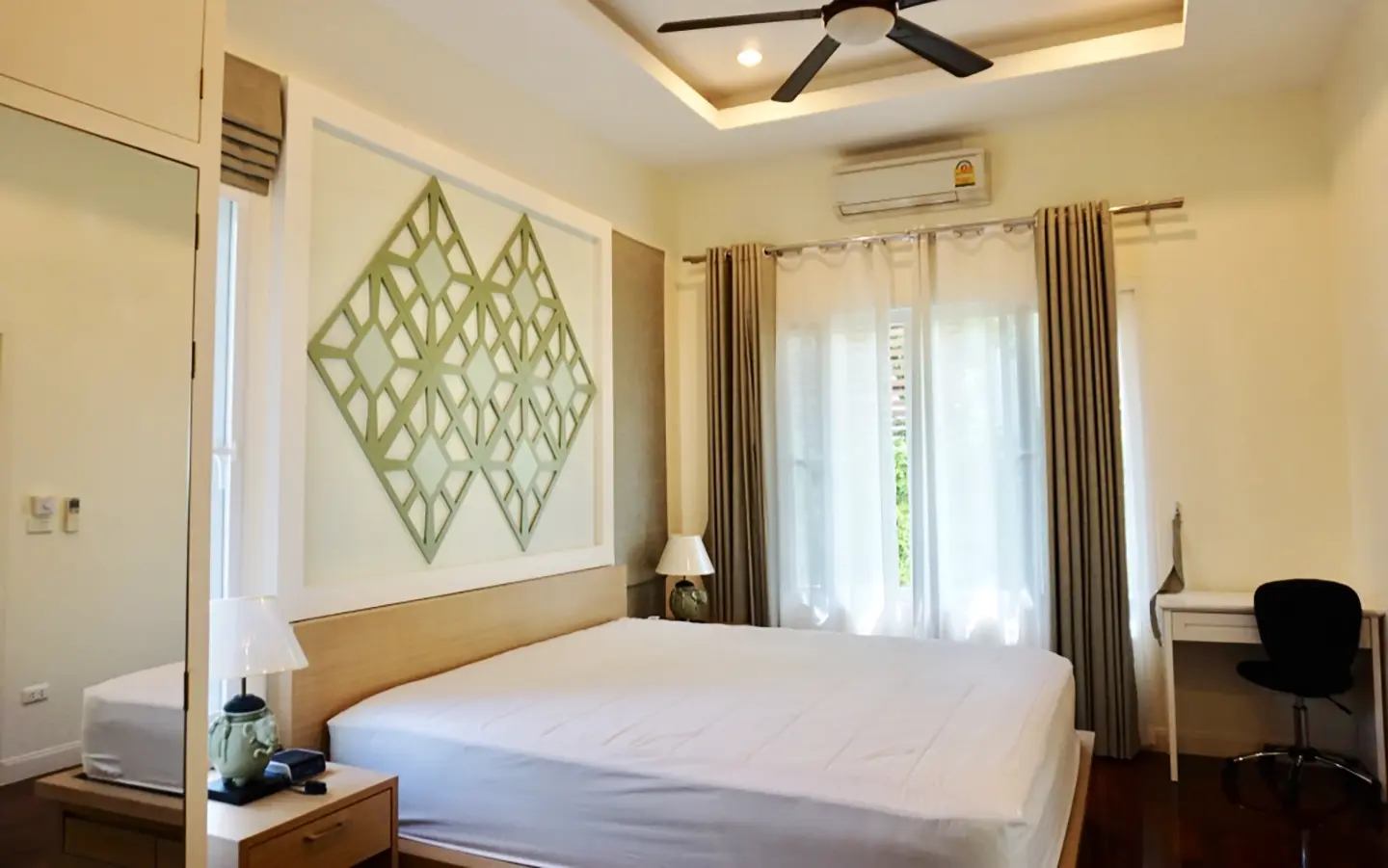 The property has a large beautifully kept landscaped garden featuring a pond and gazebo and pathway around the house. Inside, the open plan living is bright with good lighting and high-quality built-ins and furniture, dining area, living area and modern Western kitchen with built-in hob and oven. Separate pantry with washing machine and refrigerator. The first bedroom has a walk-through closet and ensuite with a shower. Beautiful wood parquet flooring. The second bedroom also is ensuite. There are a/c and ceiling fans in every room and very tastefully decorated throughout.