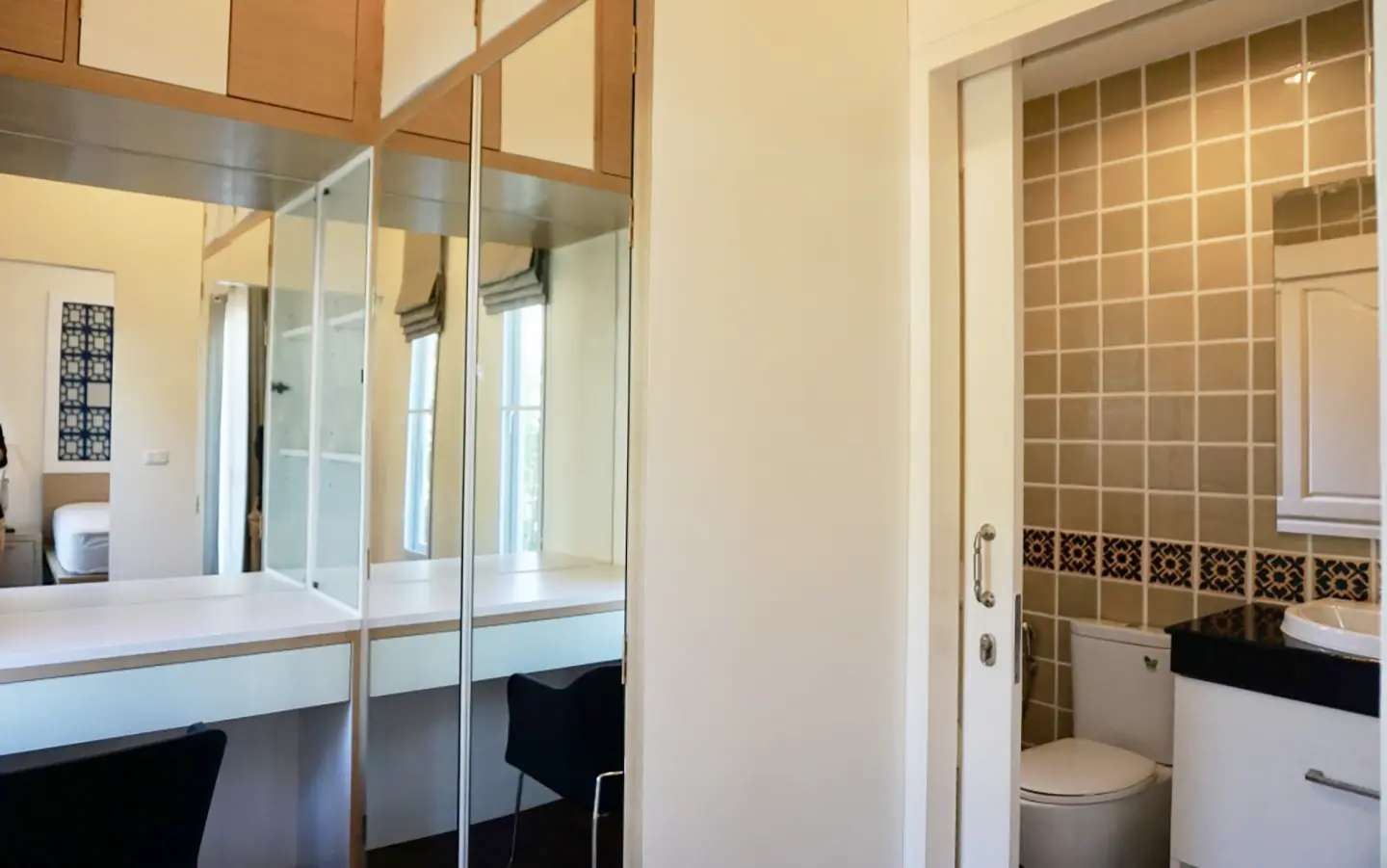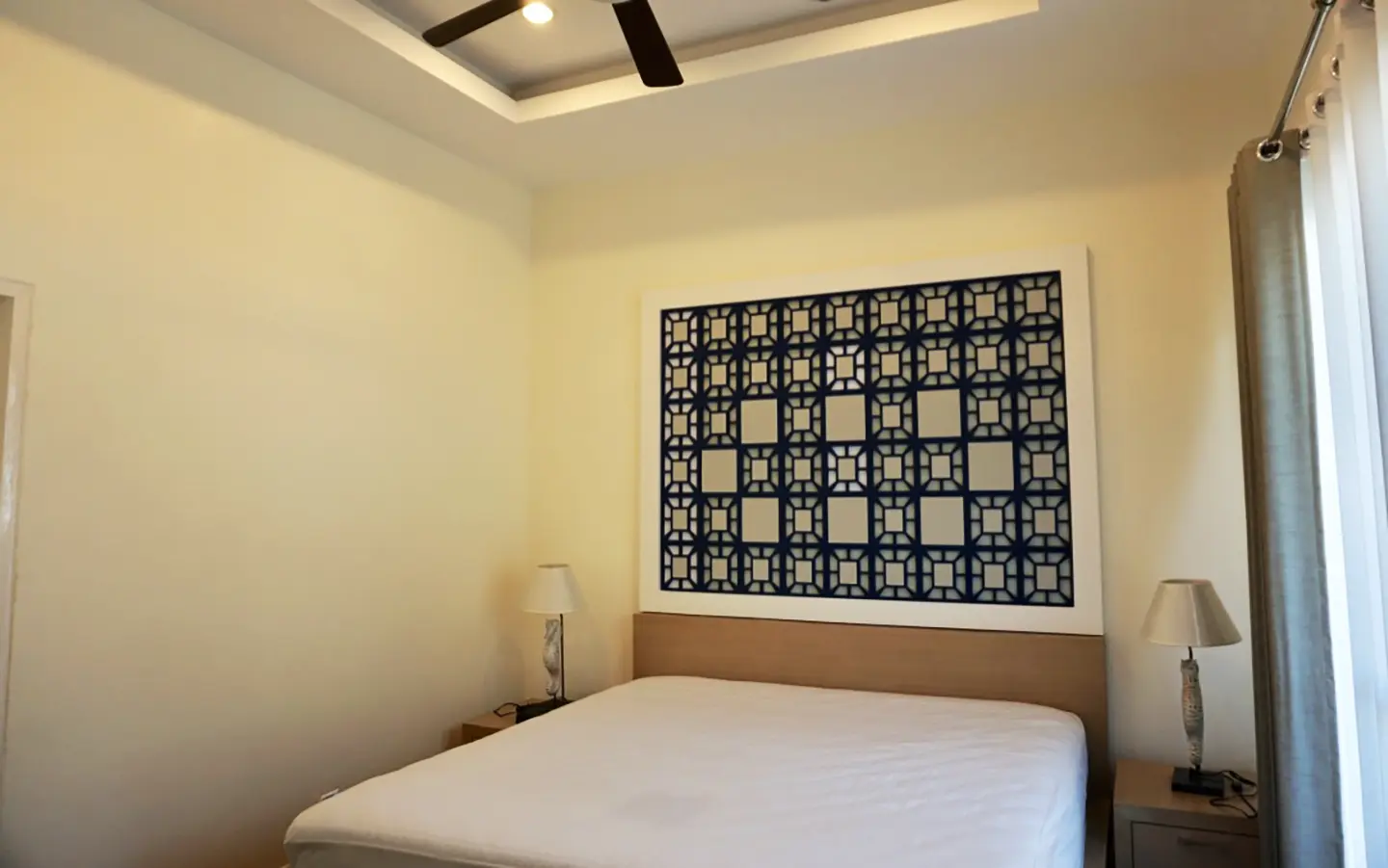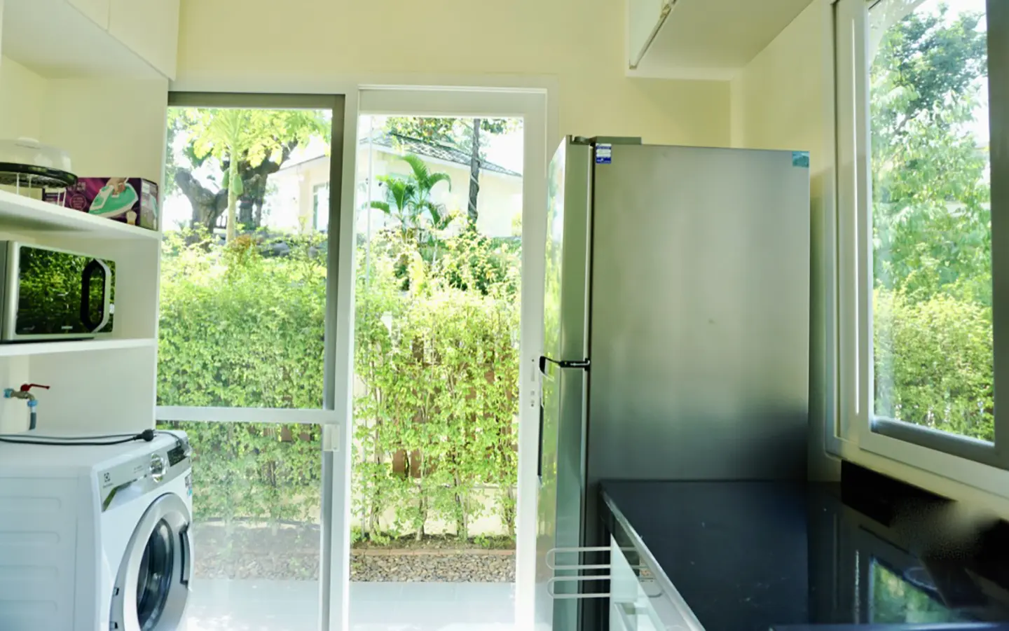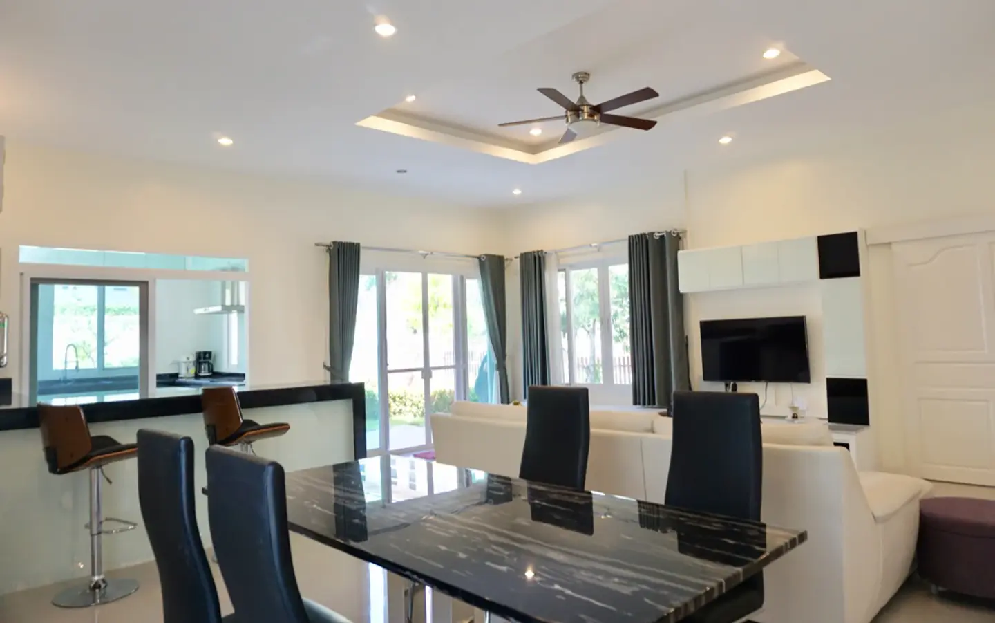 The property has a large beautifully kept landscaped garden featuring a pond and gazebo and pathway around the house. Inside, the open plan living is bright with good lighting and high-quality built-ins and furniture, dining area, living area and modern Western kitchen with built-in hob and oven. Separate pantry with washing machine and refrigerator. The first bedroom has a walk-through closet and ensuite with a shower. Beautiful wood parquet flooring. The second bedroom also is ensuite. There are a/c and ceiling fans in every room and very tastefully decorated throughout.