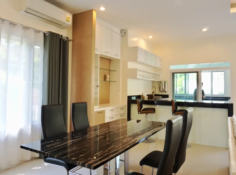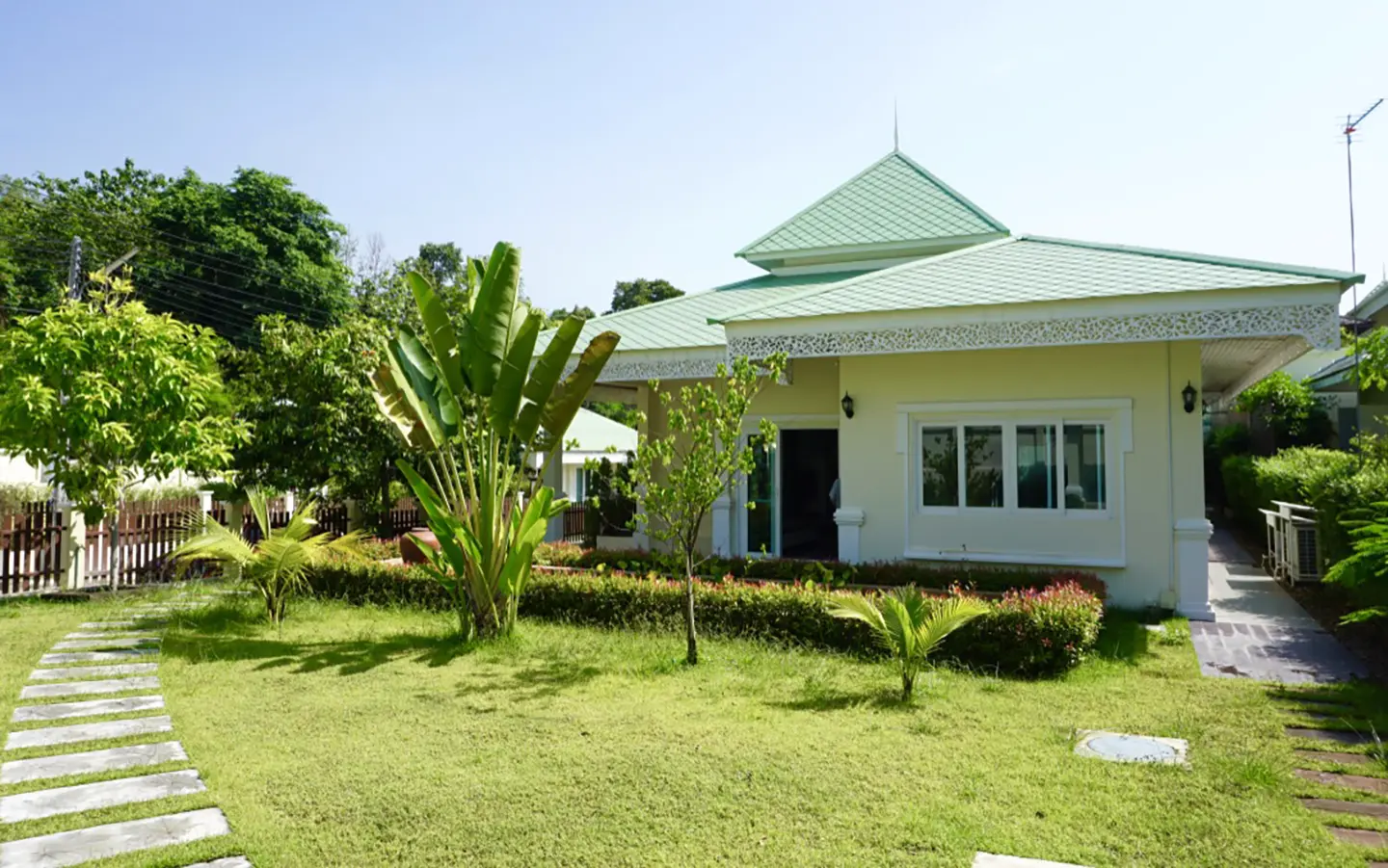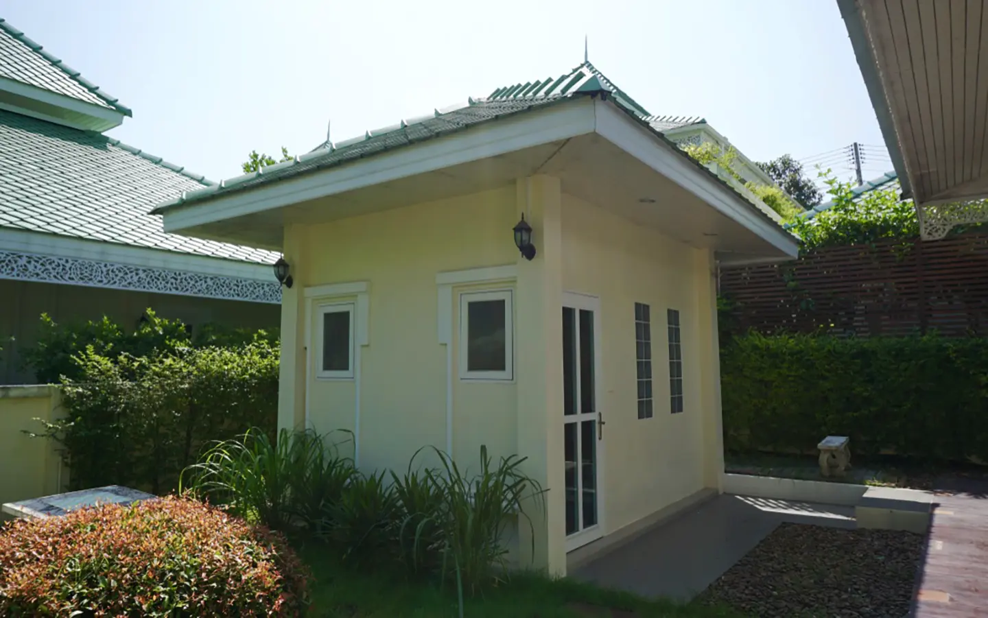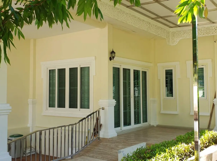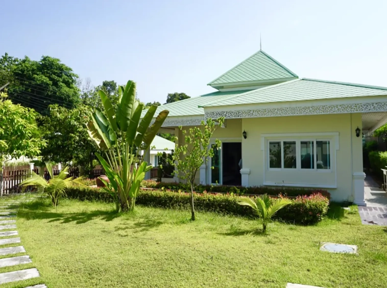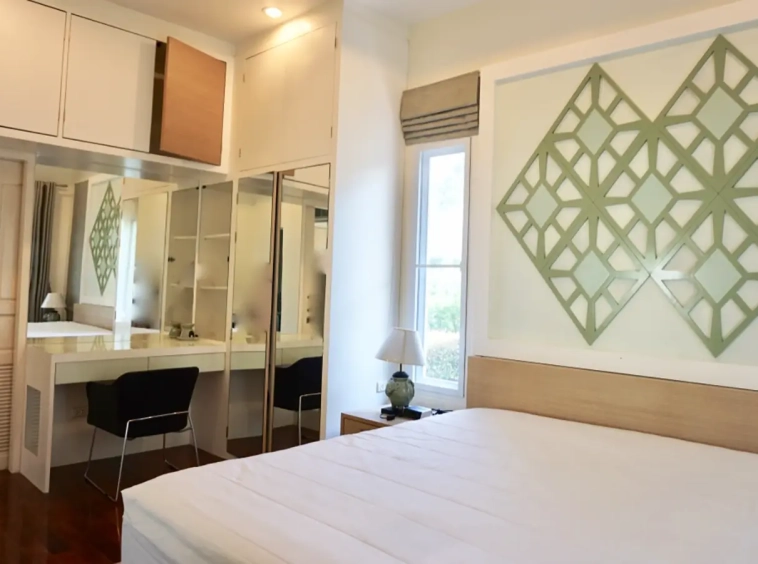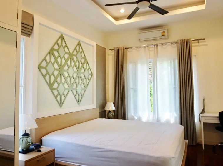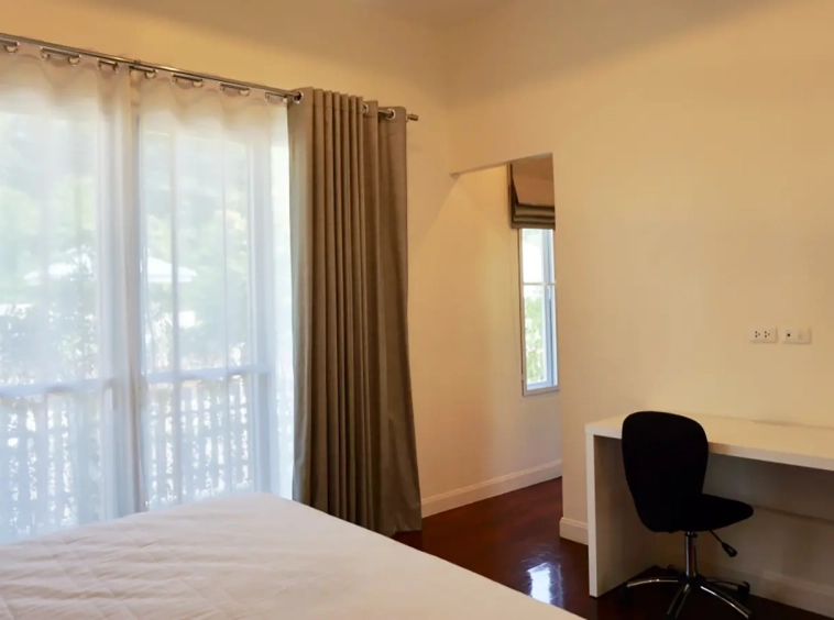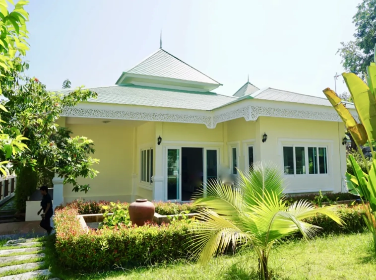 Cosy Colonial style one story 2 bedroom house for rent or sale fully furnished property in the high-end and sought-after Jirung Residences gated community, adjacent to the Jirung Health Village Resort. The city of Maerim is 5 minutes away, 10 minutes to Prem International School and a 20-minute drive to the city of Chiang Mai.