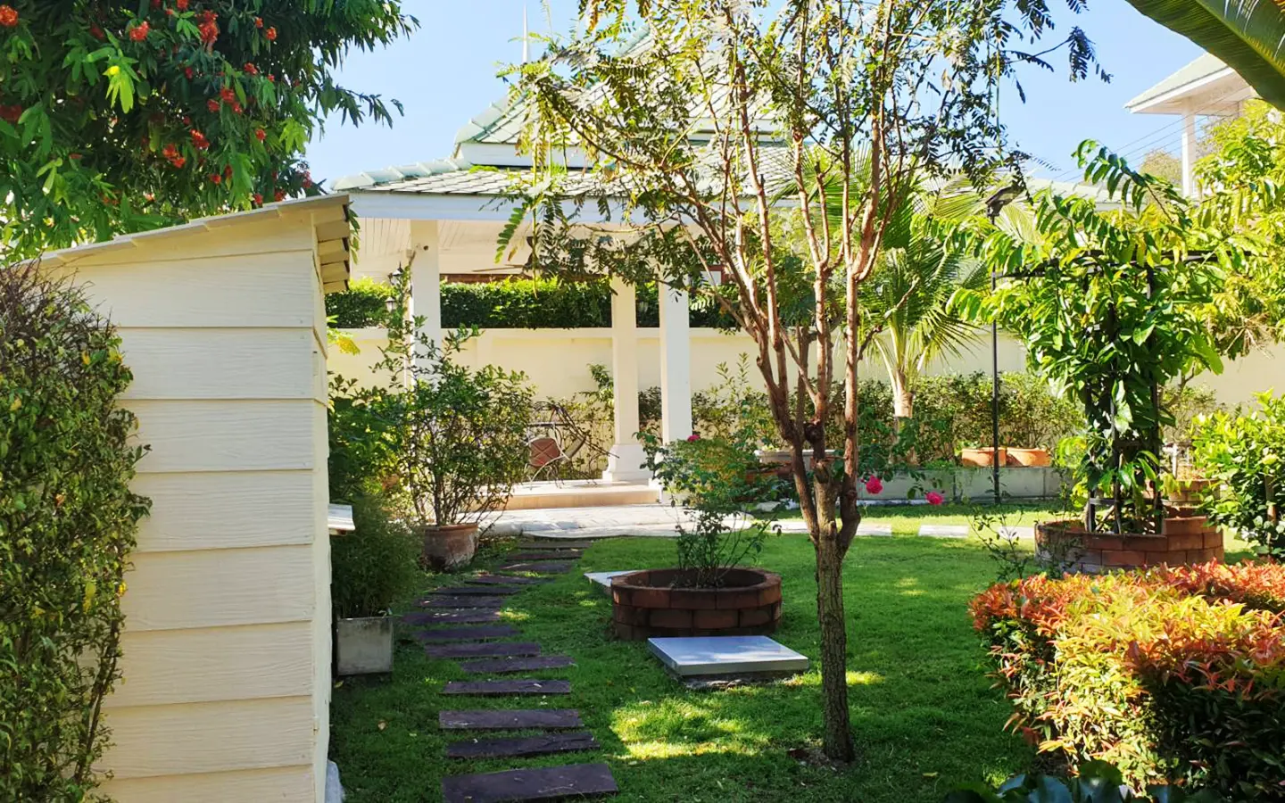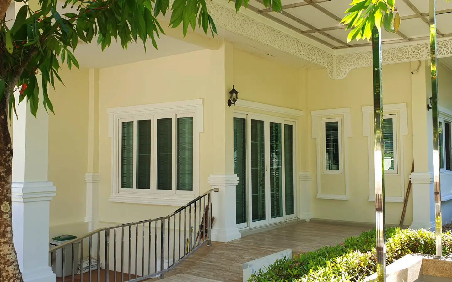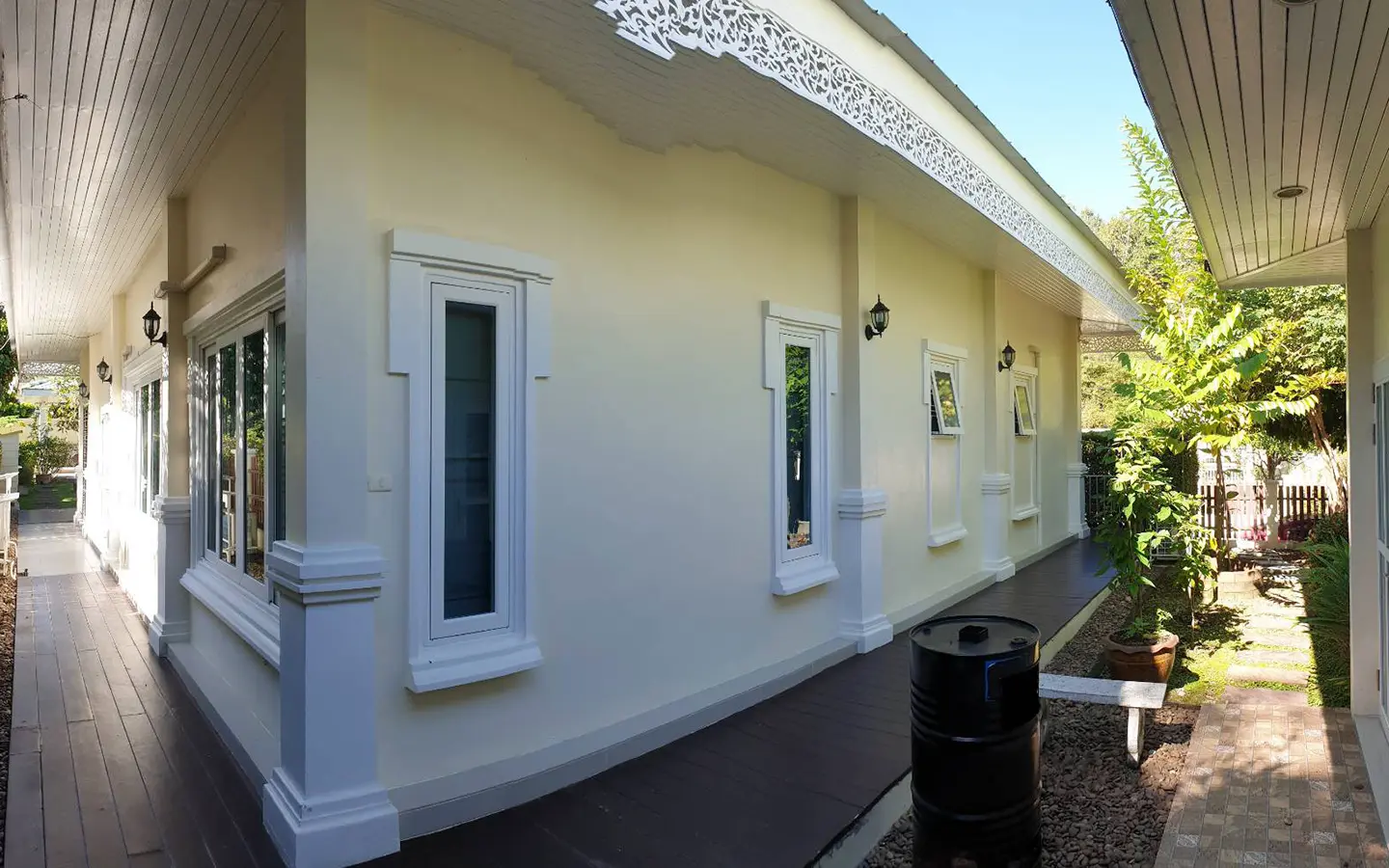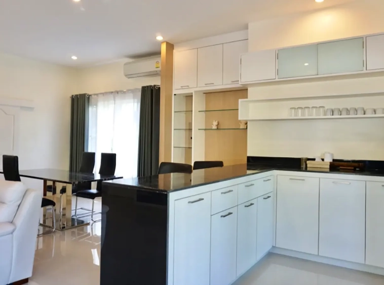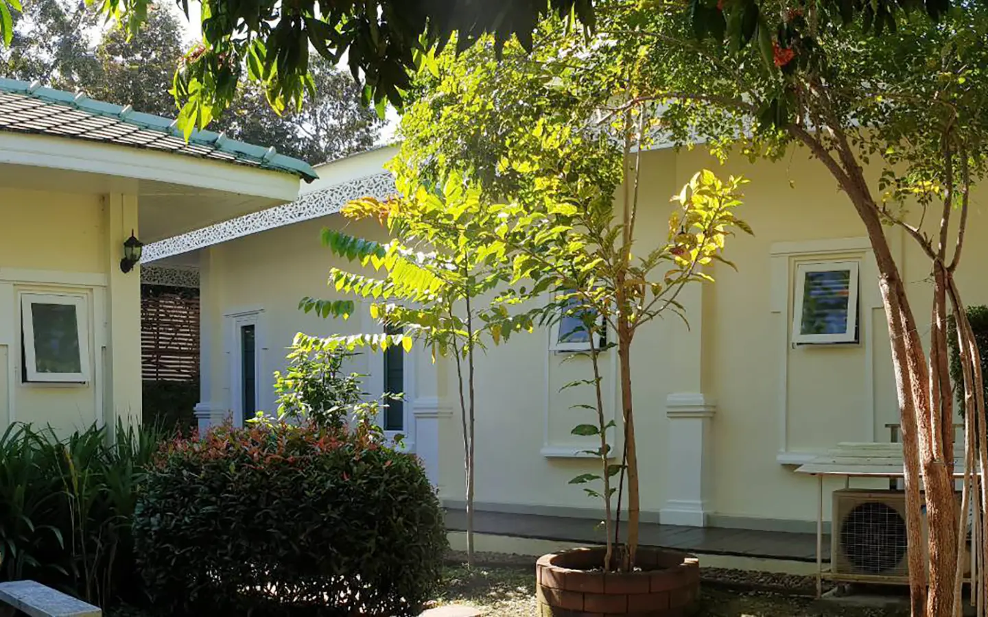 Cosy Colonial style one story 2 bedroom house for rent or sale fully furnished property in the high-end and sought-after Jirung Residences gated community, adjacent to the Jirung Health Village Resort. The city of Maerim is 5 minutes away, 10 minutes to Prem International School and a 20-minute drive to the city of Chiang Mai.