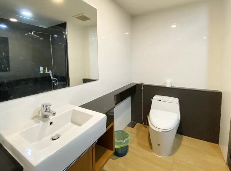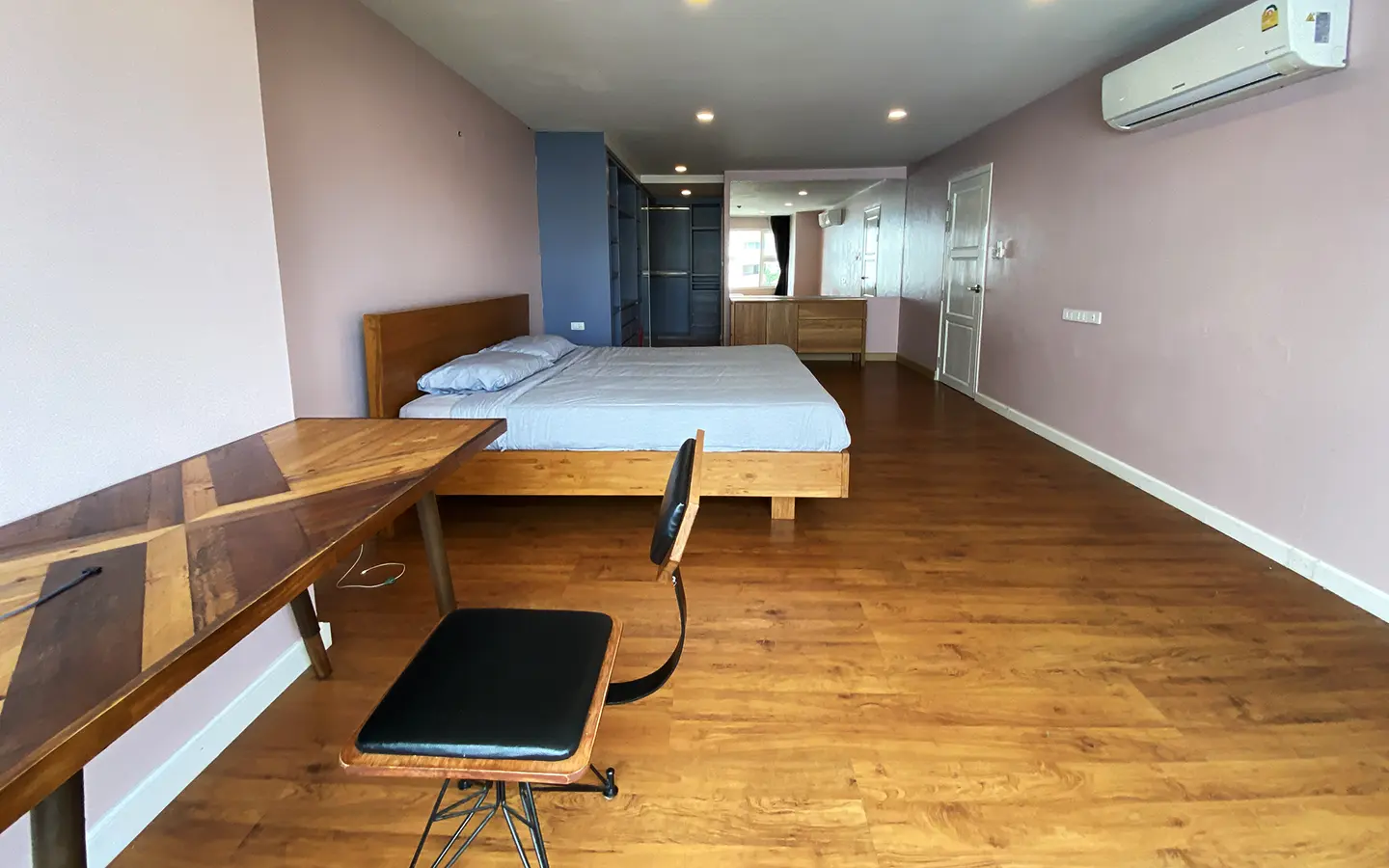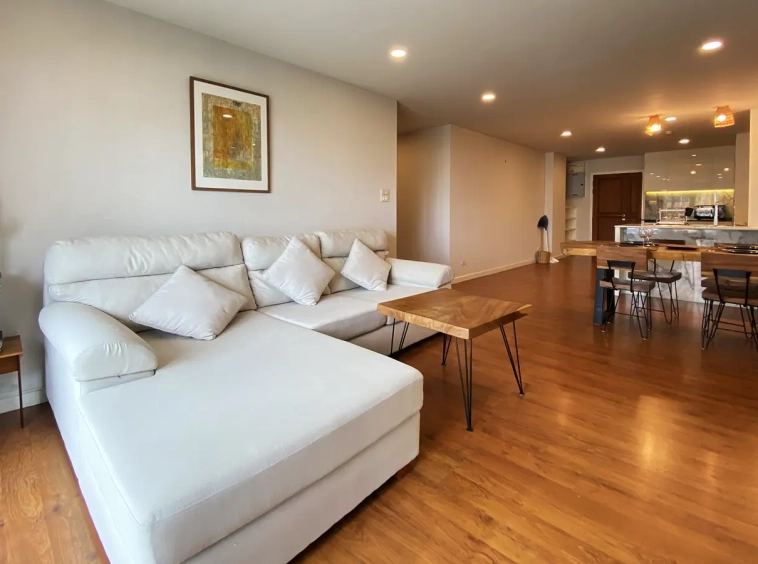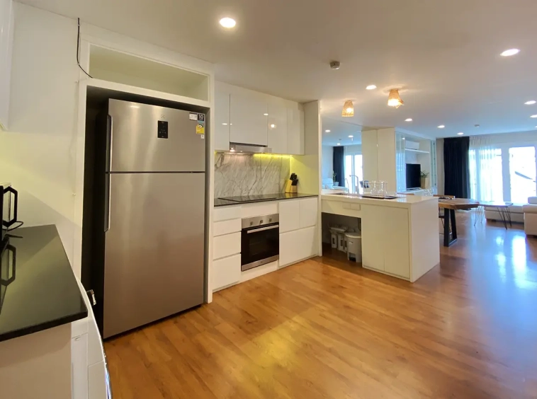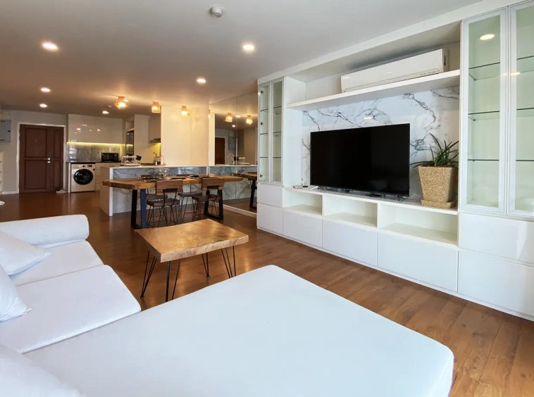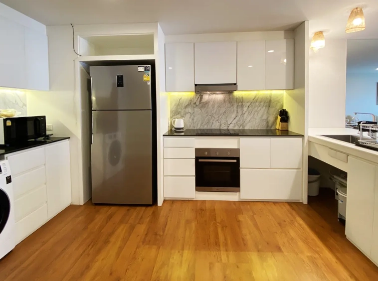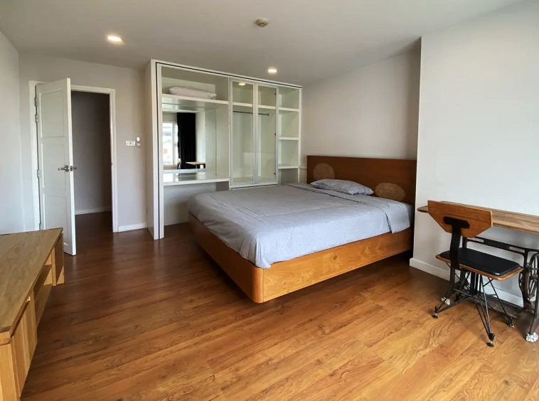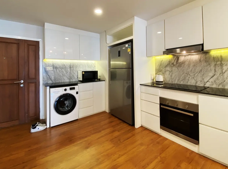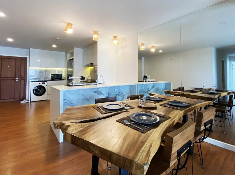 Walking through the unit, there is an excellent Western kitchen style with good space it has a counter bar for sitting and enjoying breakfast, a wooden dining table, a living area in which the owner uses a mirror to put on the wall to help and make the room look bigger, a balcony.