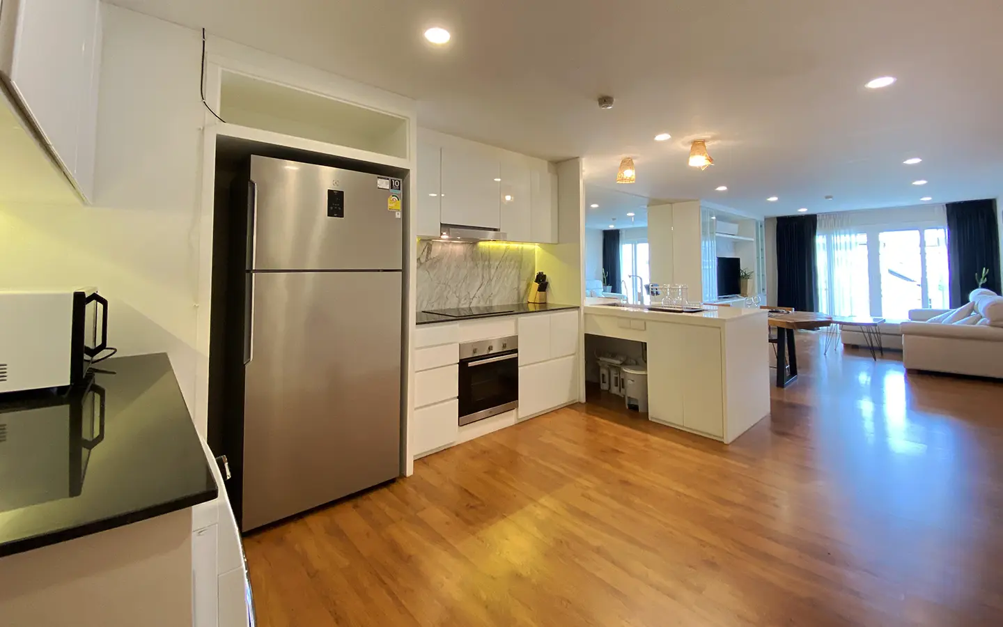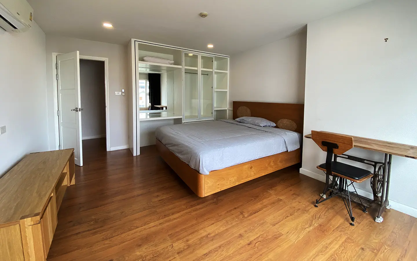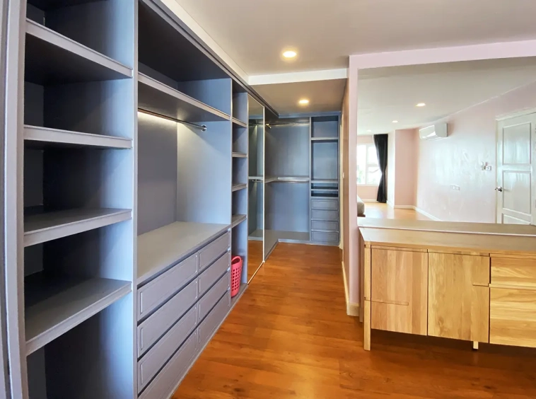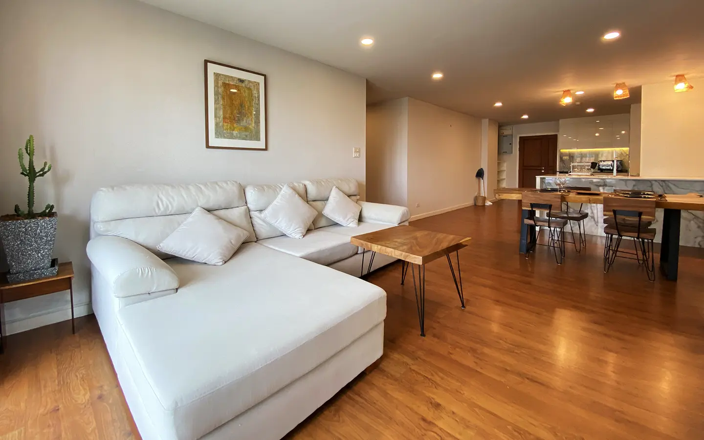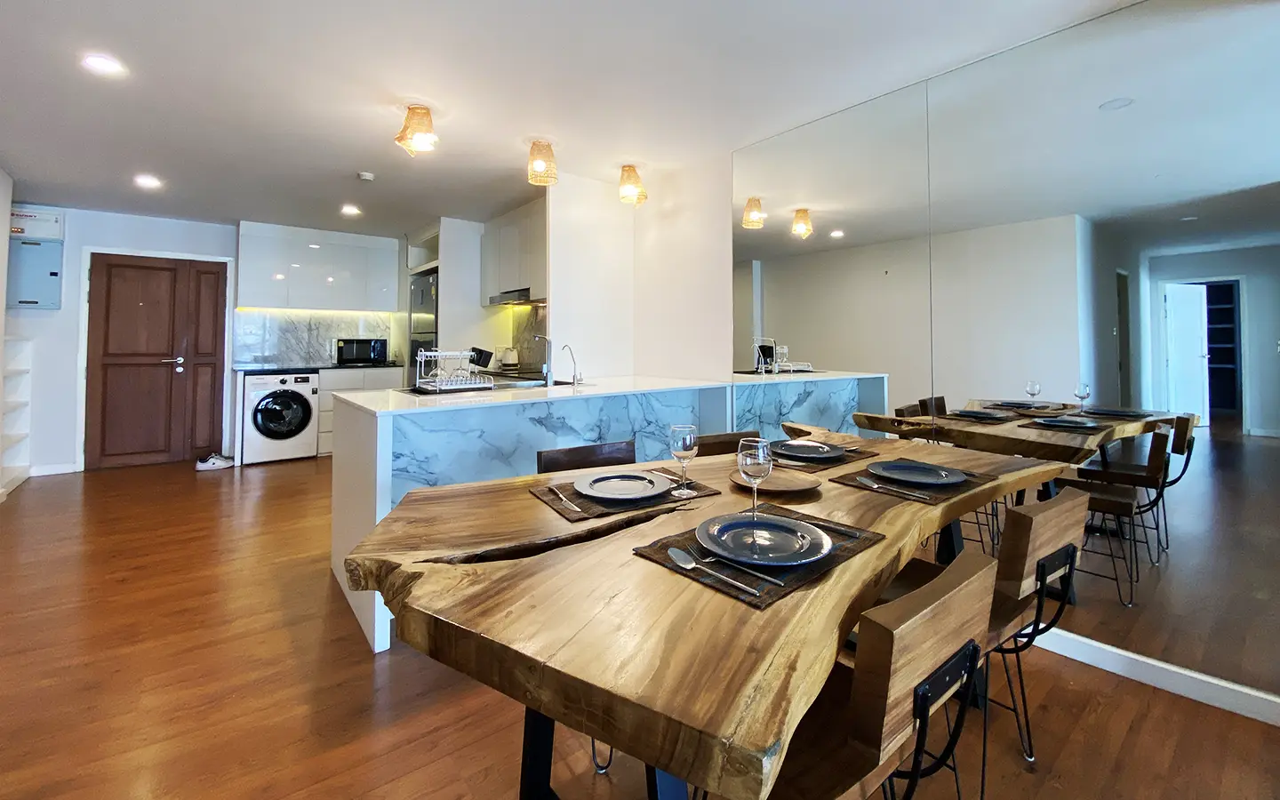 Walking through the unit, there is an excellent Western kitchen style with good space it has a counter bar for sitting and enjoying breakfast, a wooden dining table, a living area in which the owner uses a mirror to put on the wall to help and make the room look bigger, a balcony.