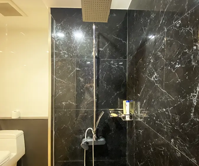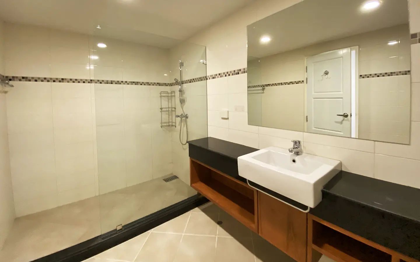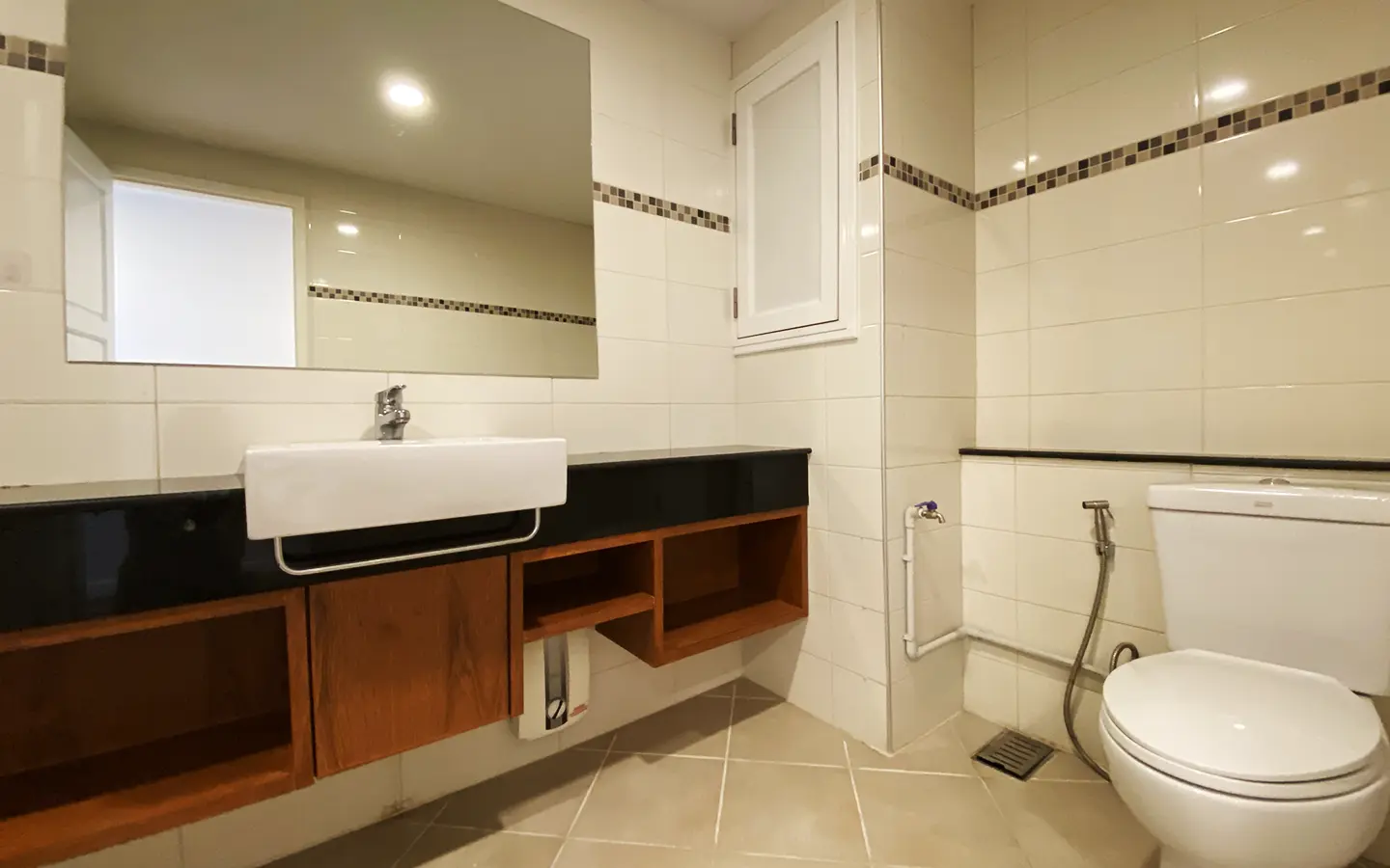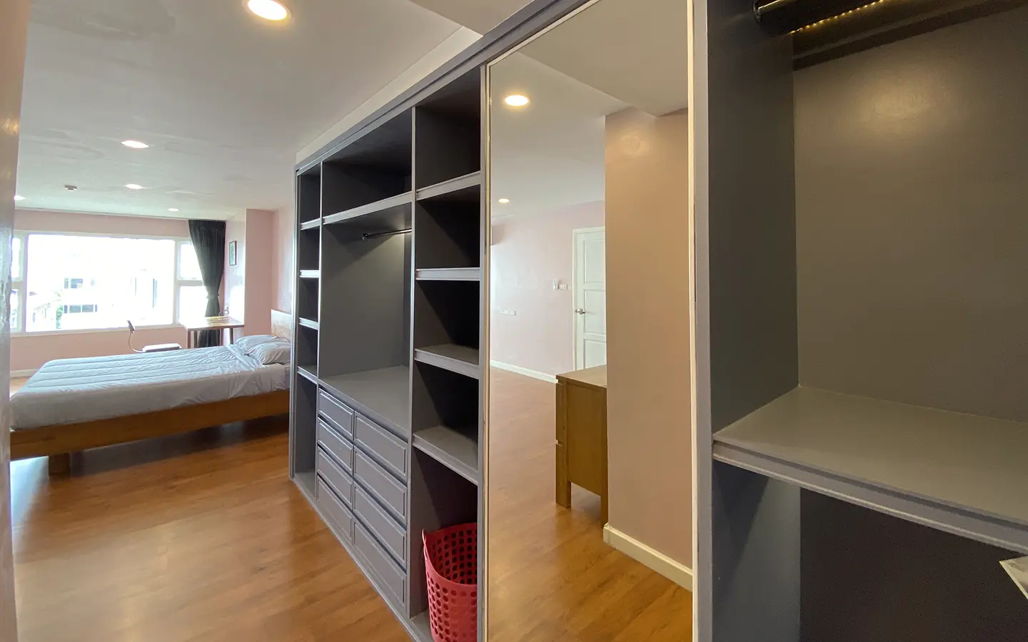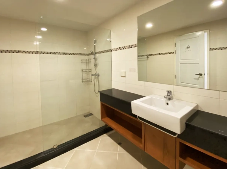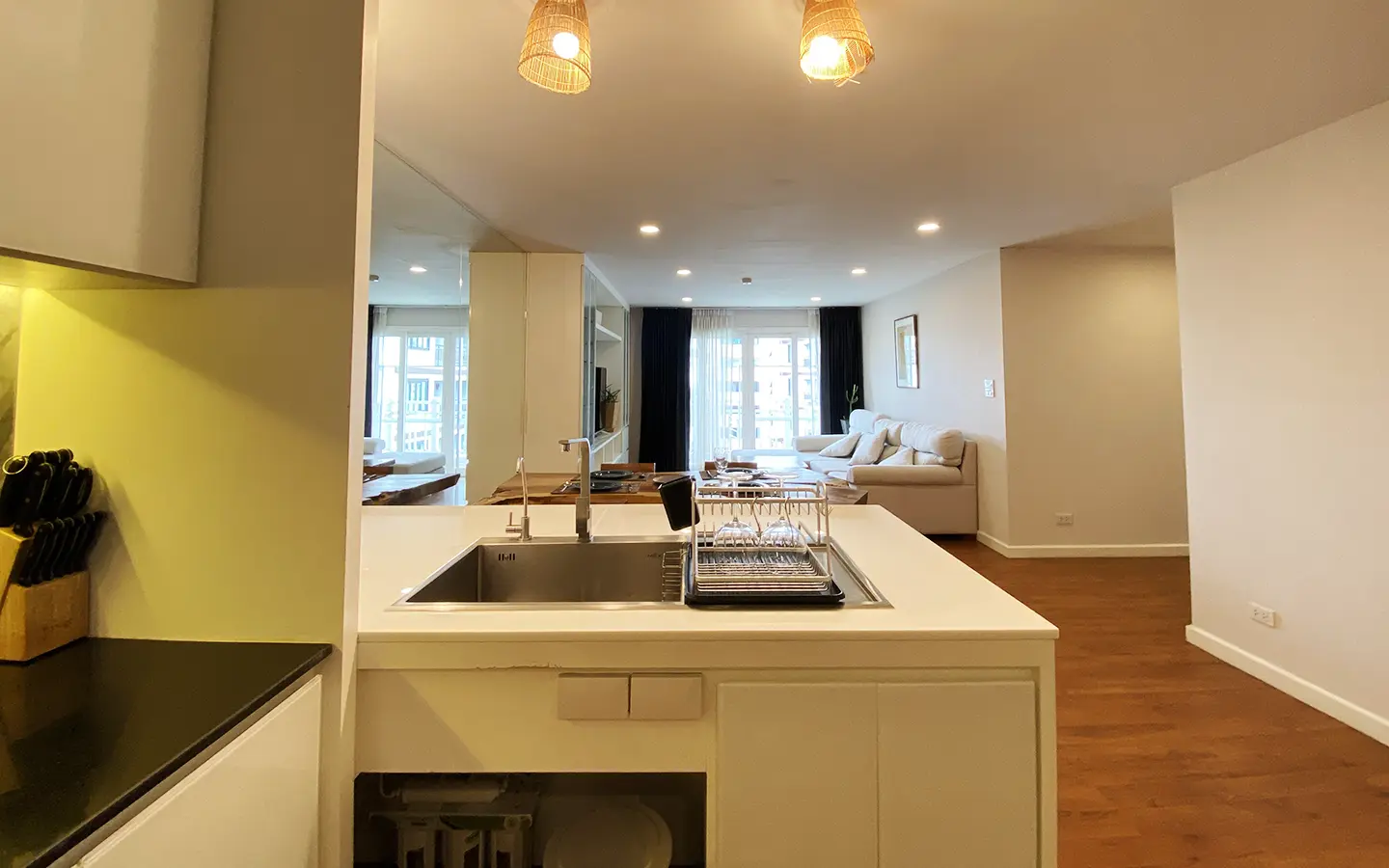 Walking through the unit, there is an excellent Western kitchen style with good space it has a counter bar for sitting and enjoying breakfast, a wooden dining table, a living area in which the owner uses a mirror to put on the wall to help and make the room look bigger, a balcony.
