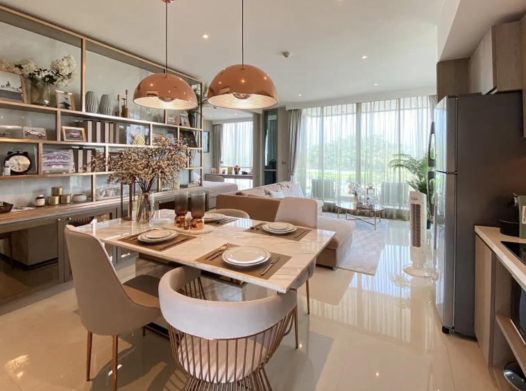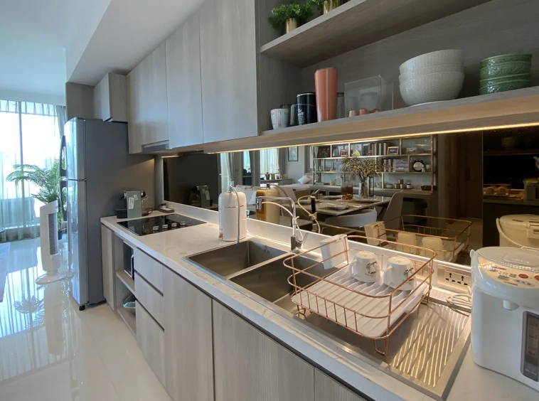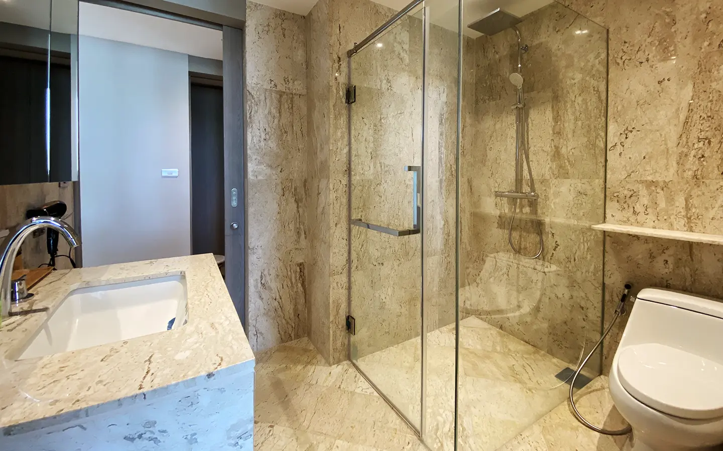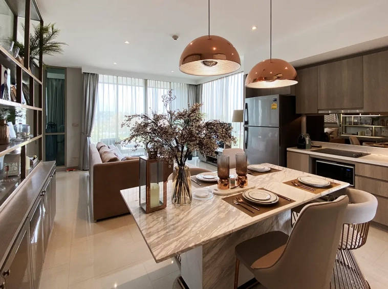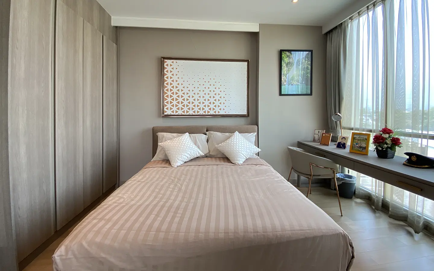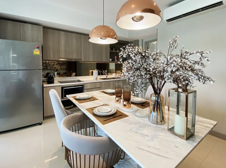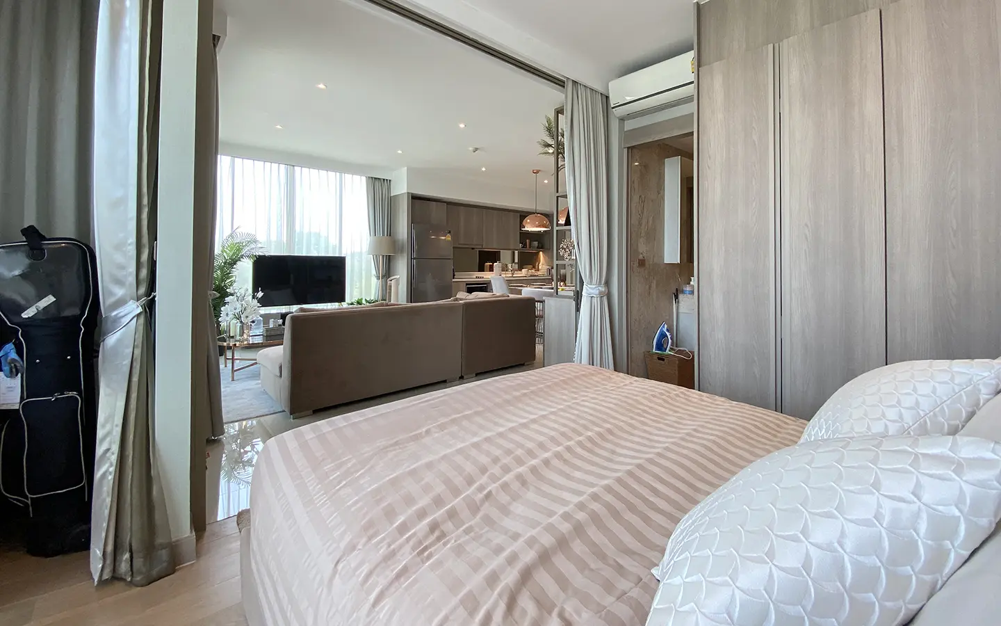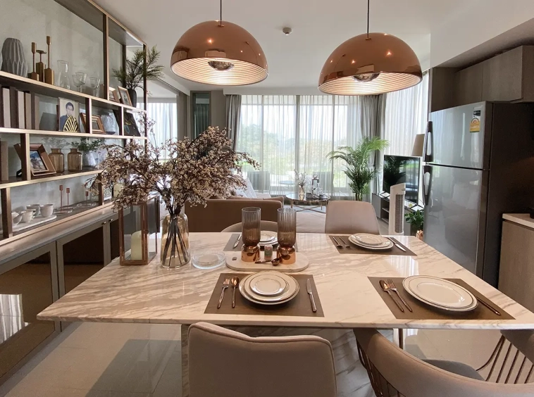 The unit is on the 4th floor and is elaborately furnished. To the left, there is a storage room with a washing machine, guest bathroom, kitchen with dining table and sitting room with access to the terrace and slide door access to bedroom one.