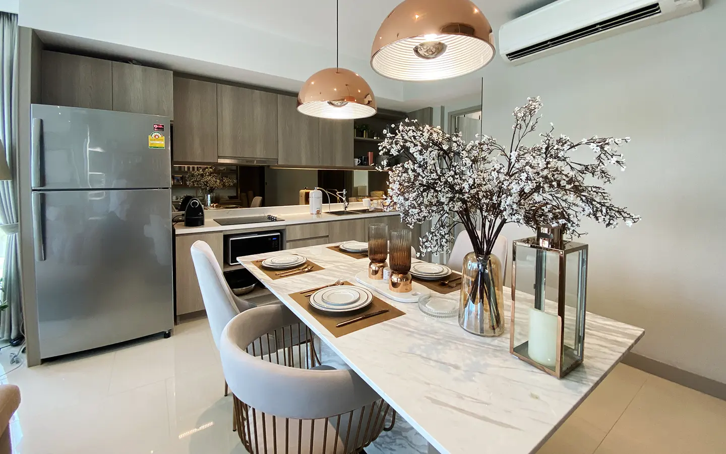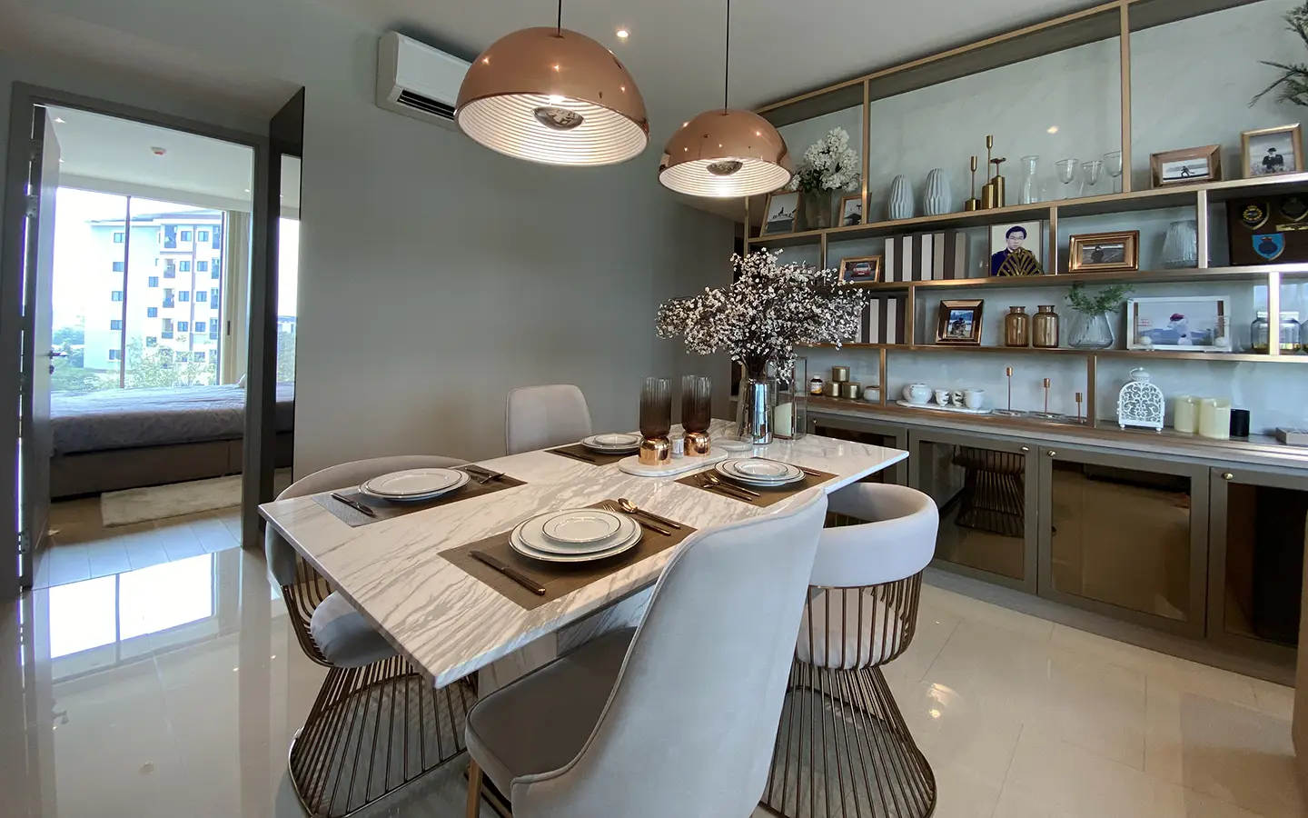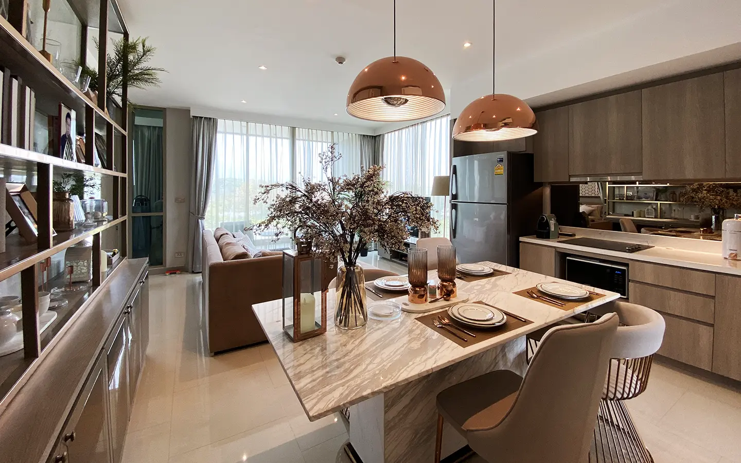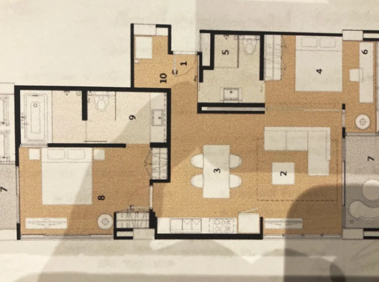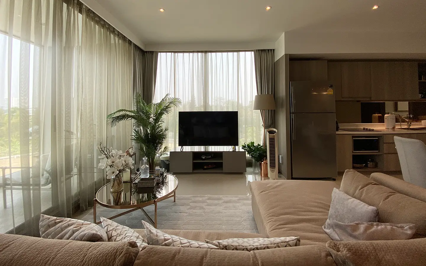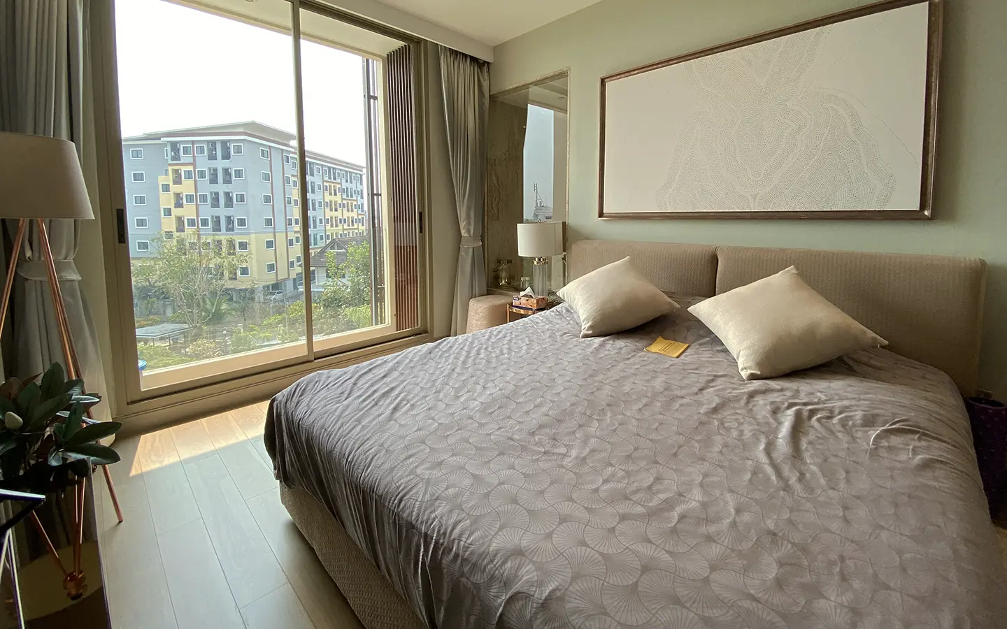 The unit is on the 4th floor and is elaborately furnished. To the left, there is a storage room with a washing machine, guest bathroom, kitchen with dining table and sitting room with access to the terrace and slide door access to bedroom one.