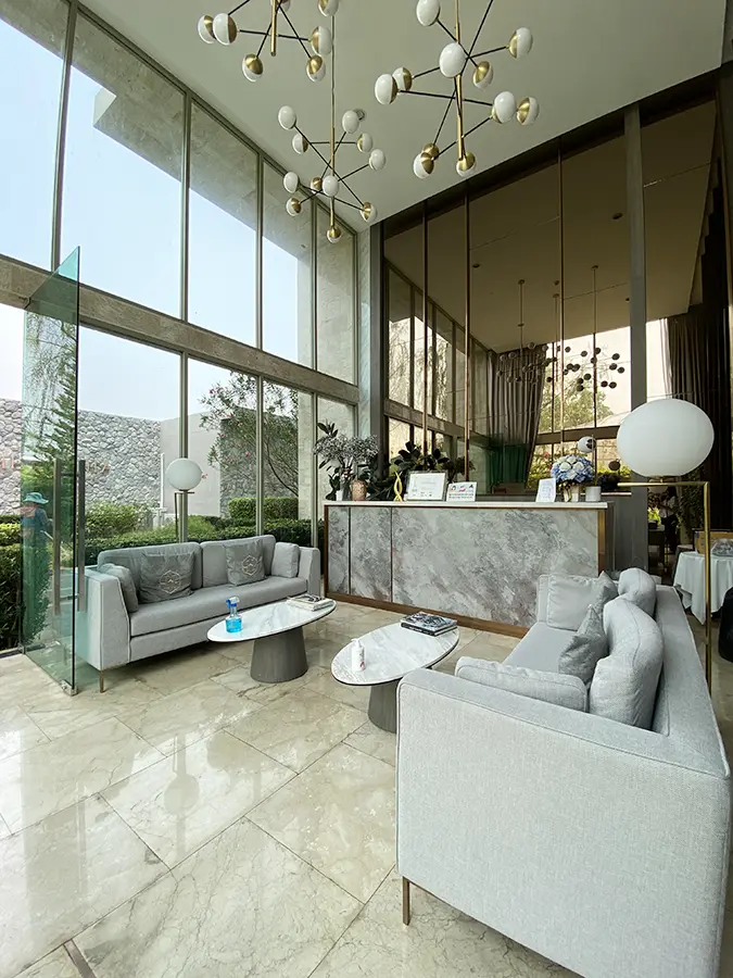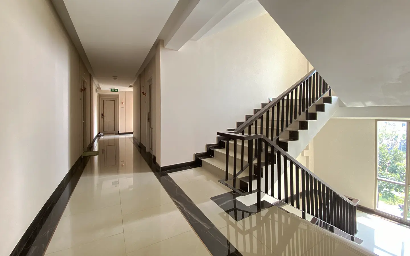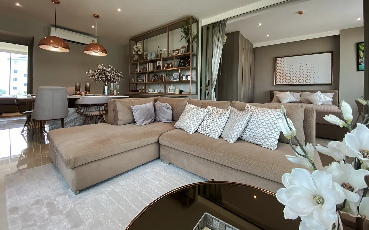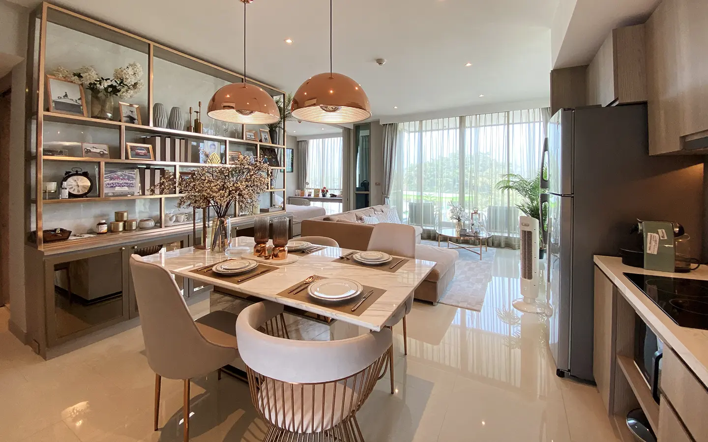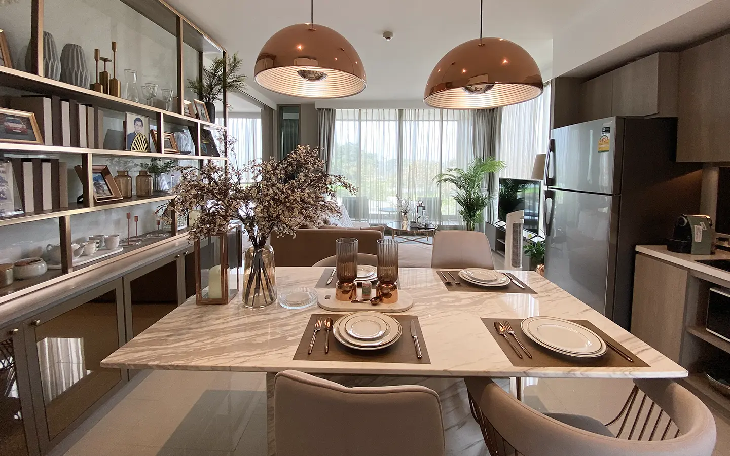 The unit is on the 4th floor and is elaborately furnished. To the left, there is a storage room with a washing machine, guest bathroom, kitchen with dining table and sitting room with access to the terrace and slide door access to bedroom one.