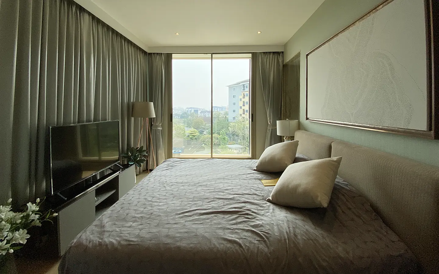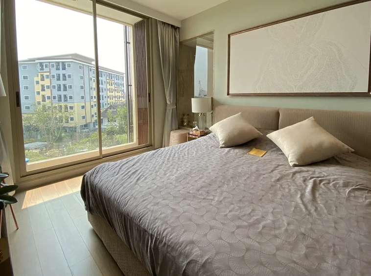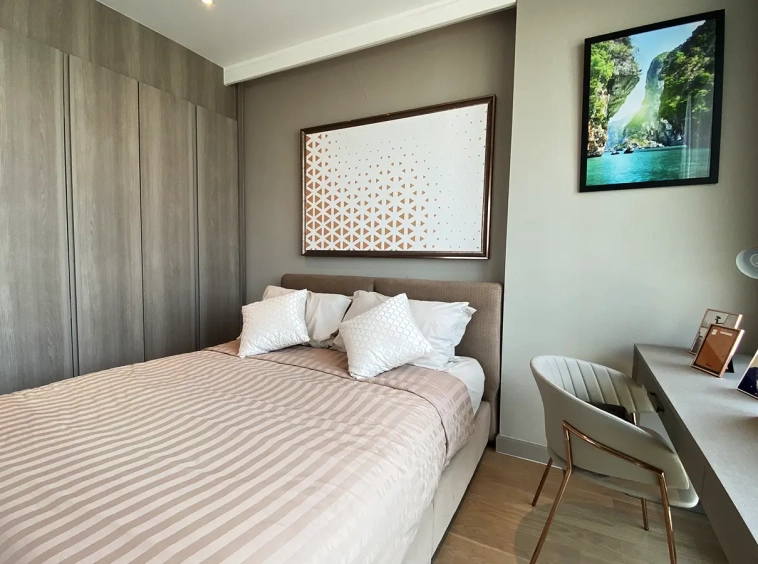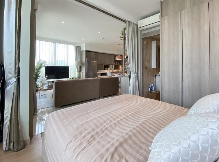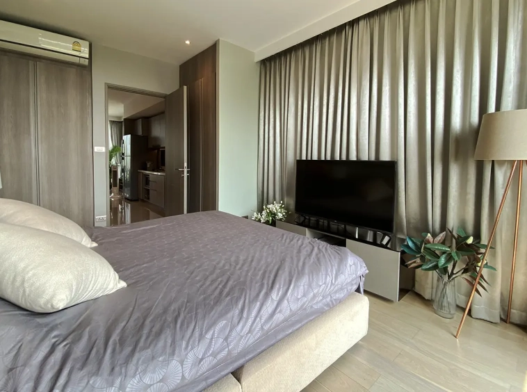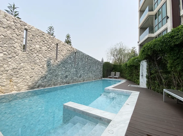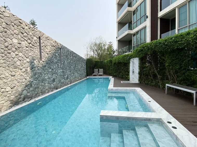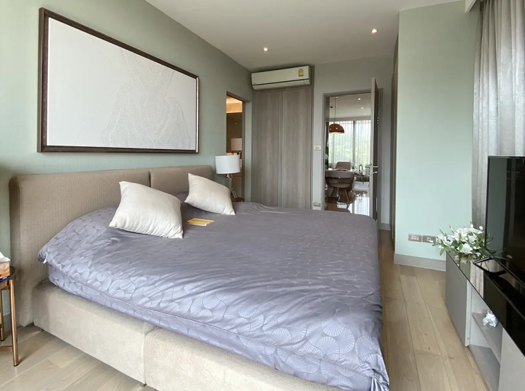 To the right, there is the master bedroom, ensuite with a large bathtub and access to the terrace with a view of the mountain. The unit is well furnished with high-quality furniture and fittings as well as lighting. It is 5 years old and has been owned by a foreigner who took extremely good care of it. The project offers to park, swimming pool, fitness room, beautiful garden and a rooftop garden where one can enjoy a sundowner with a view of Doi Suthep mountain.