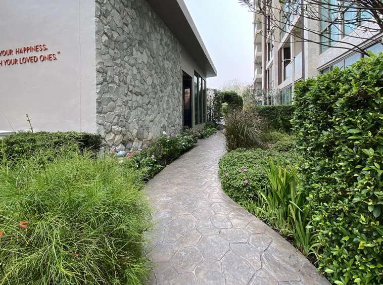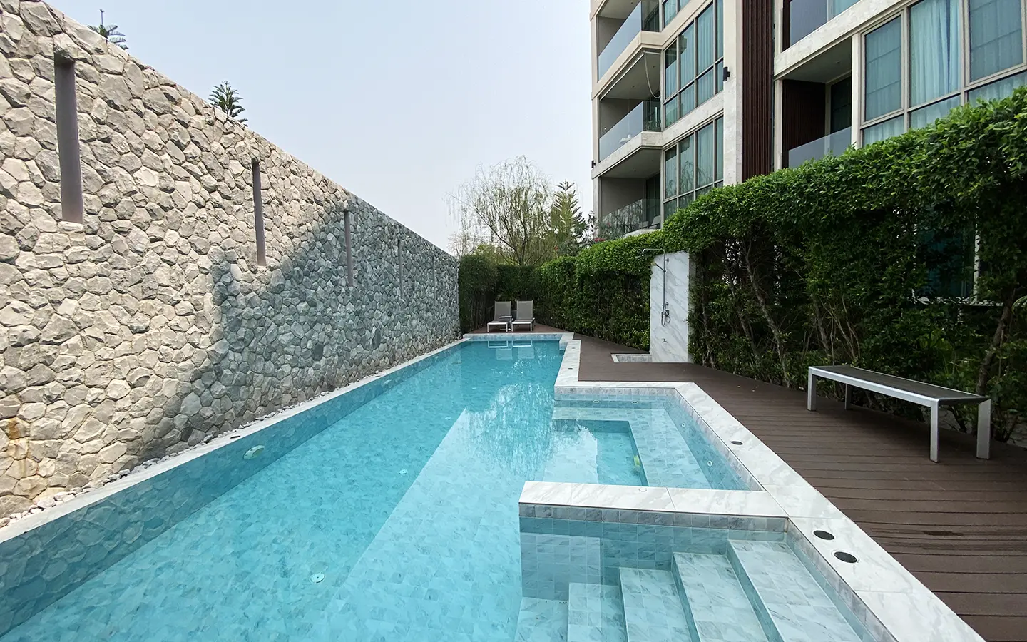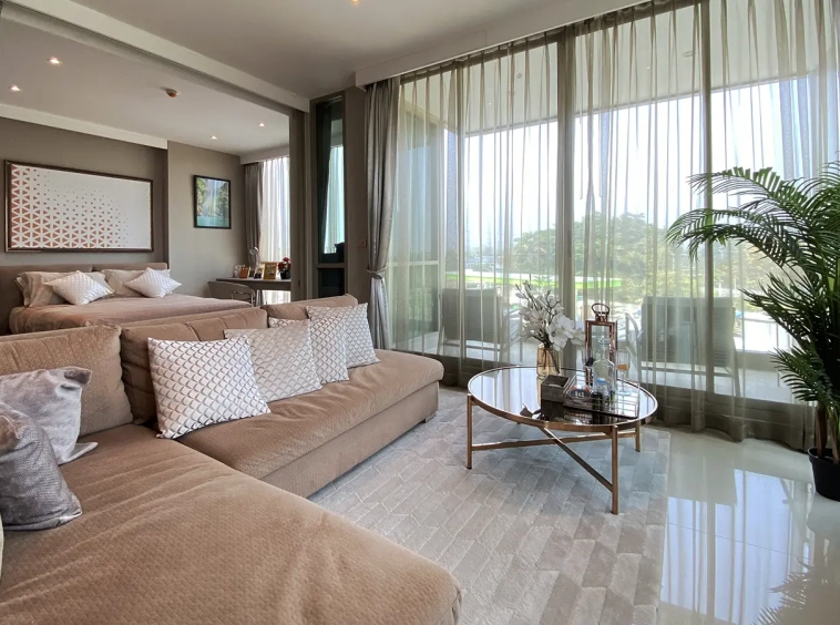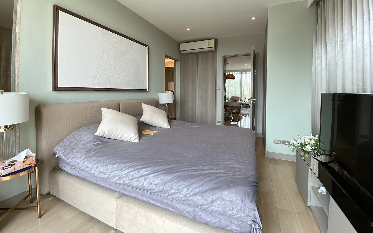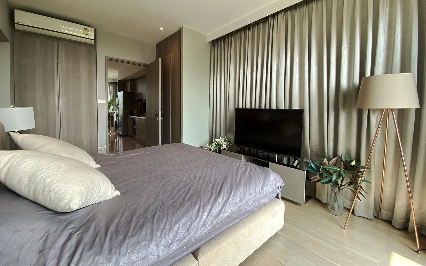 To the right, there is the master bedroom, ensuite with a large bathtub and access to the terrace with a view of the mountain. The unit is well furnished with high-quality furniture and fittings as well as lighting. It is 5 years old and has been owned by a foreigner who took extremely good care of it. The project offers to park, swimming pool, fitness room, beautiful garden and a rooftop garden where one can enjoy a sundowner with a view of Doi Suthep mountain.