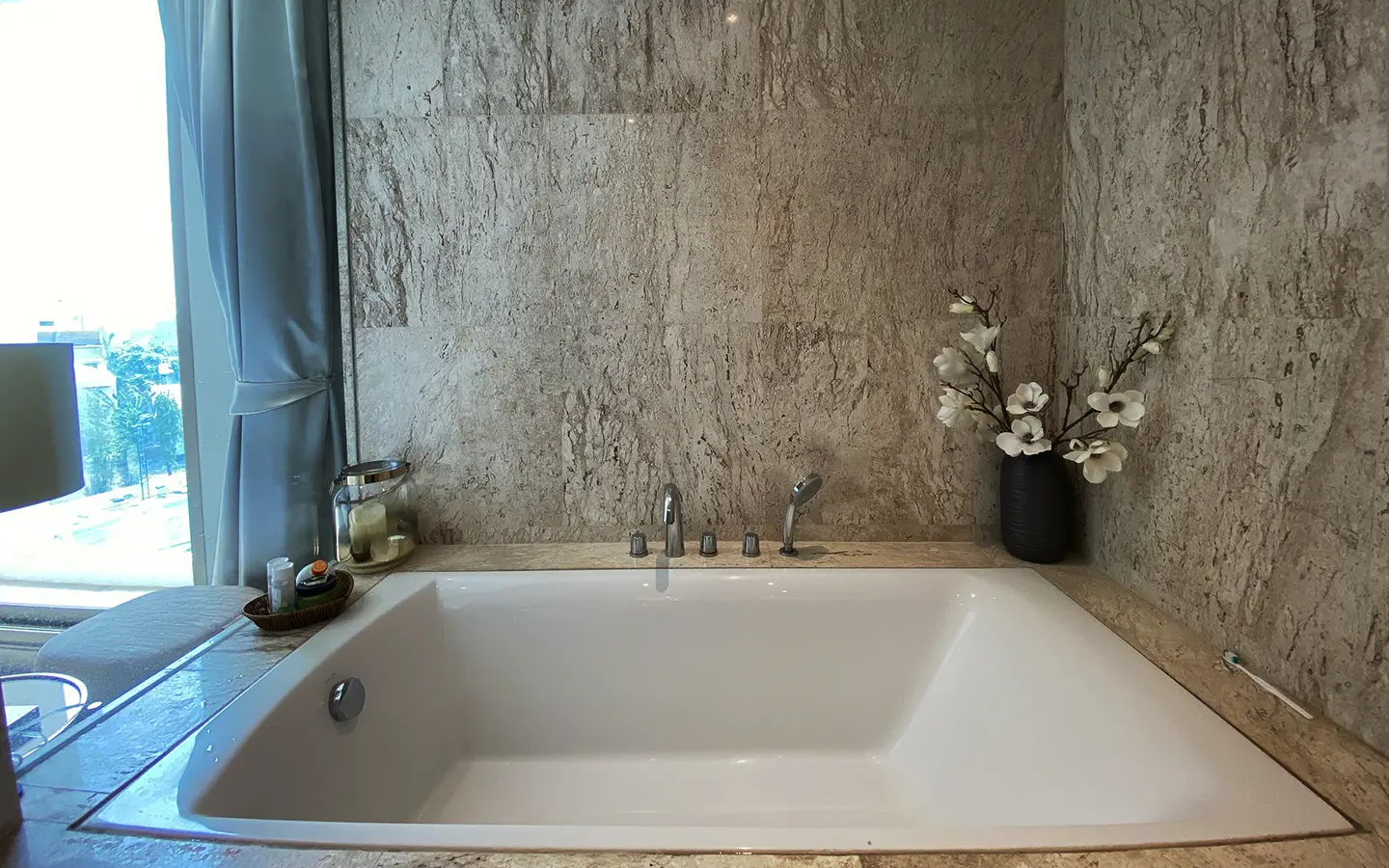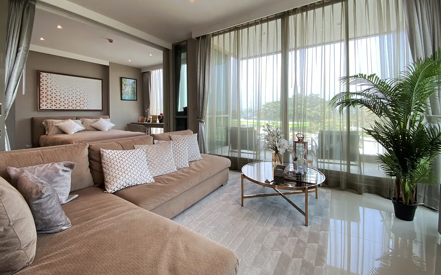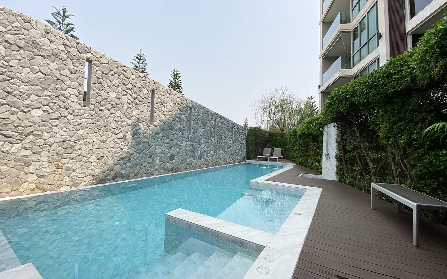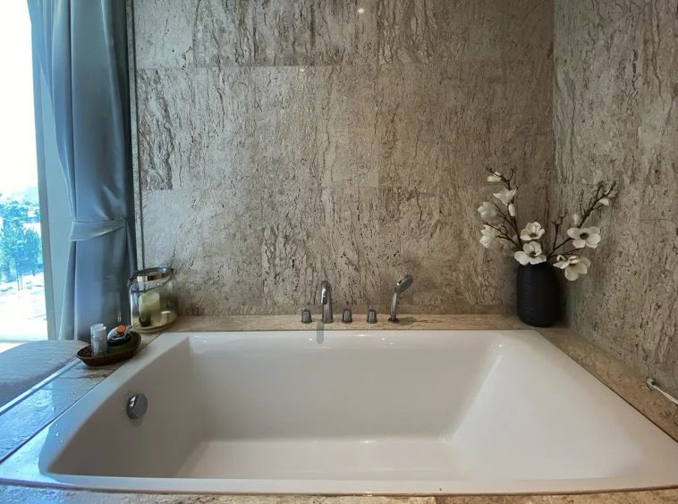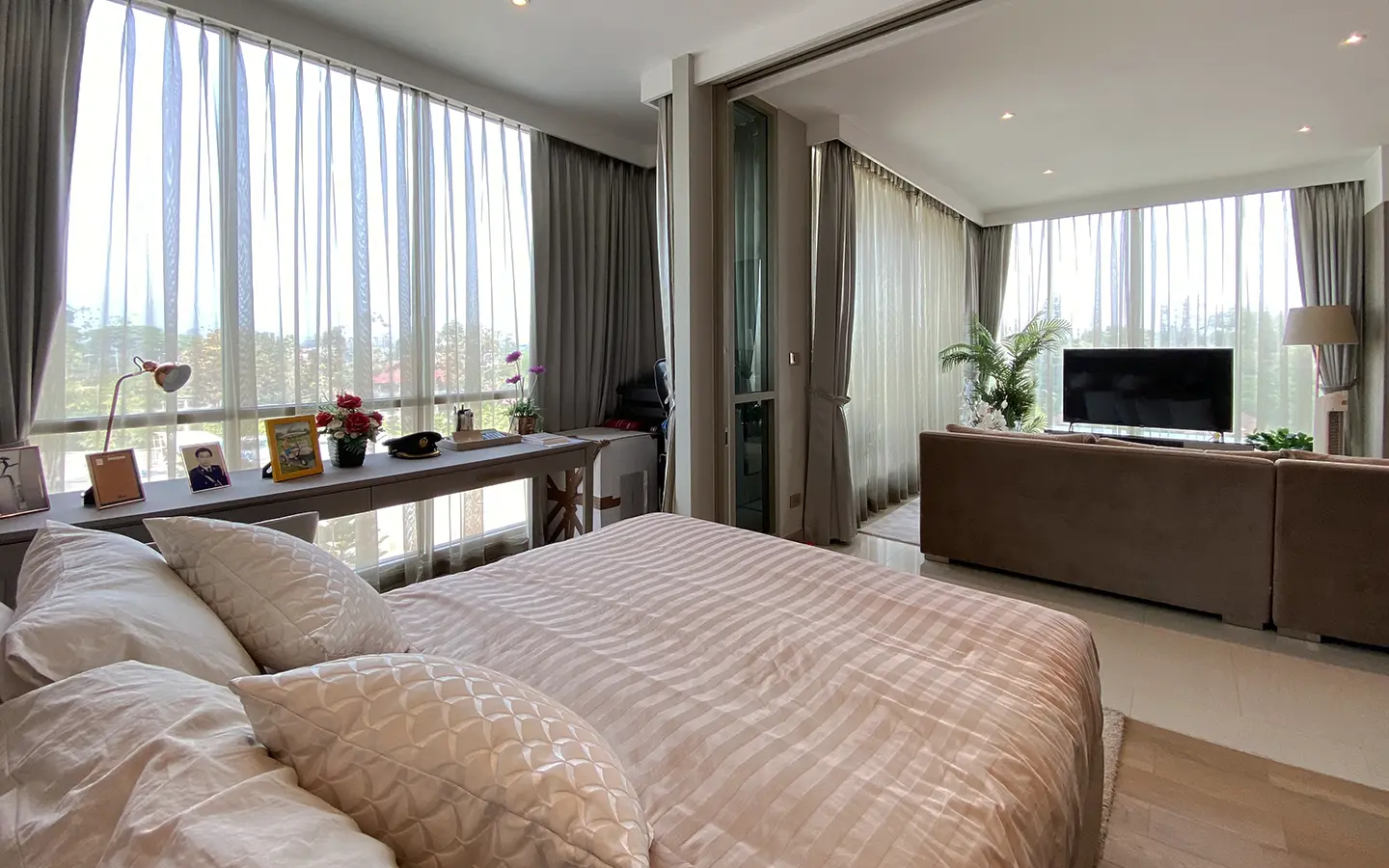 To the right, there is the master bedroom, ensuite with a large bathtub and access to the terrace with a view of the mountain. The unit is well furnished with high-quality furniture and fittings as well as lighting. It is 5 years old and has been owned by a foreigner who took extremely good care of it. The project offers to park, swimming pool, fitness room, beautiful garden and a rooftop garden where one can enjoy a sundowner with a view of Doi Suthep mountain.