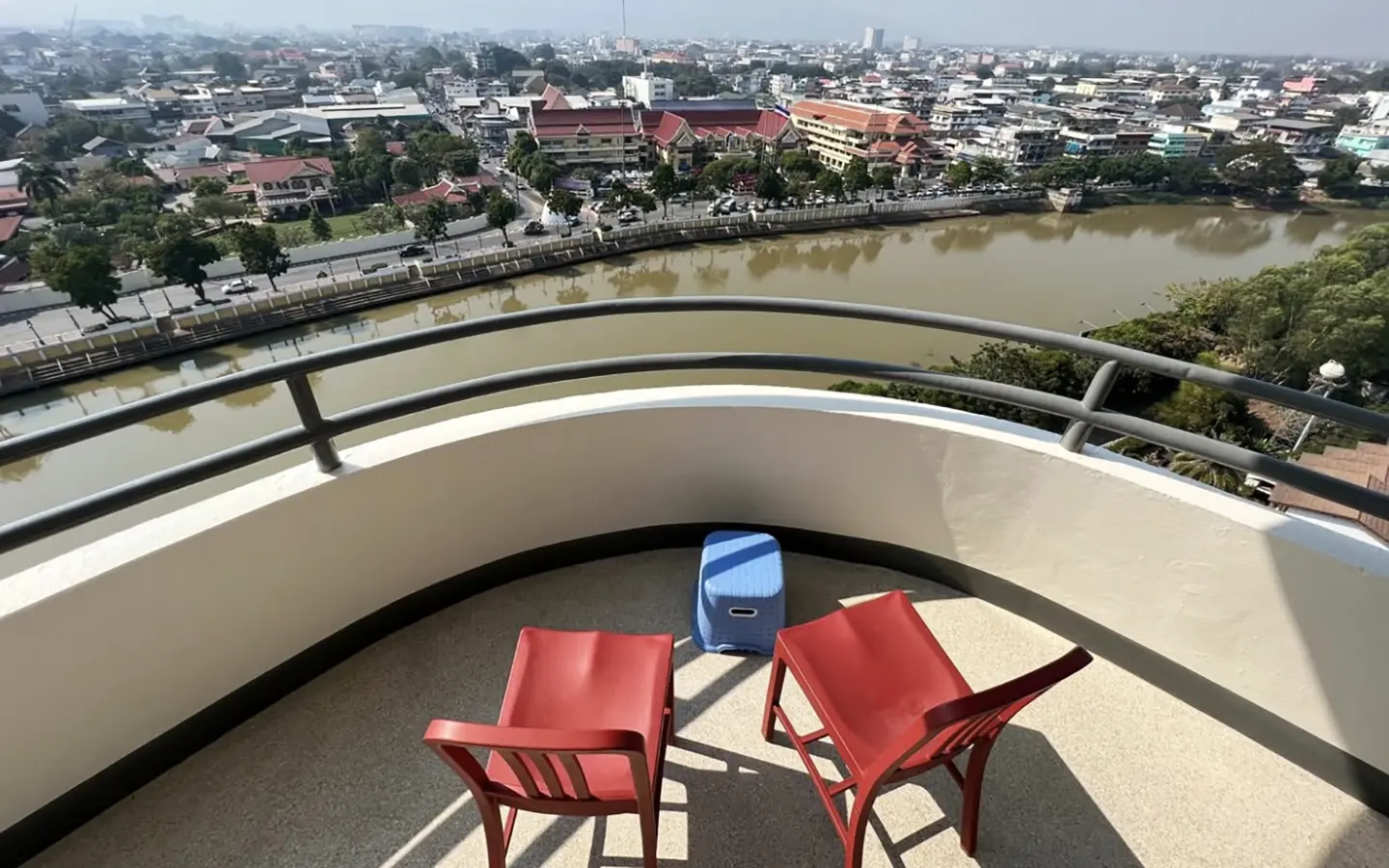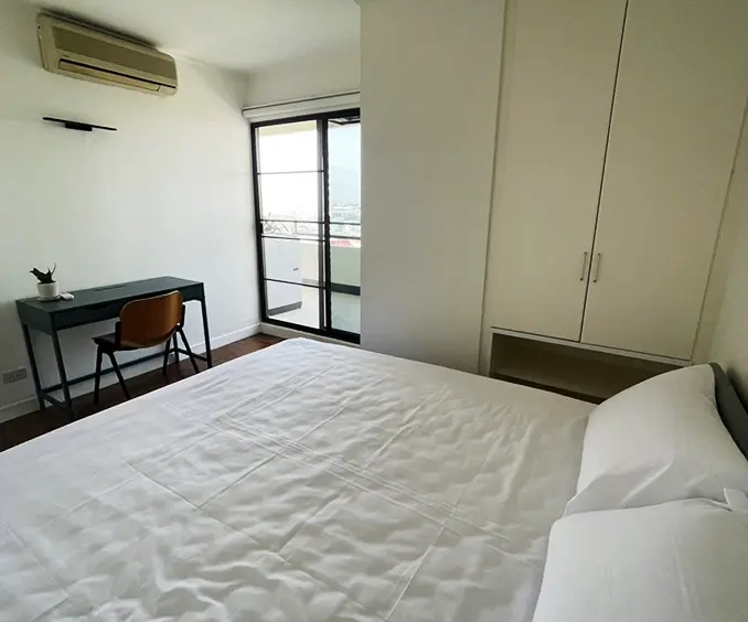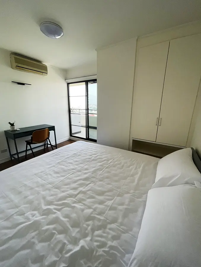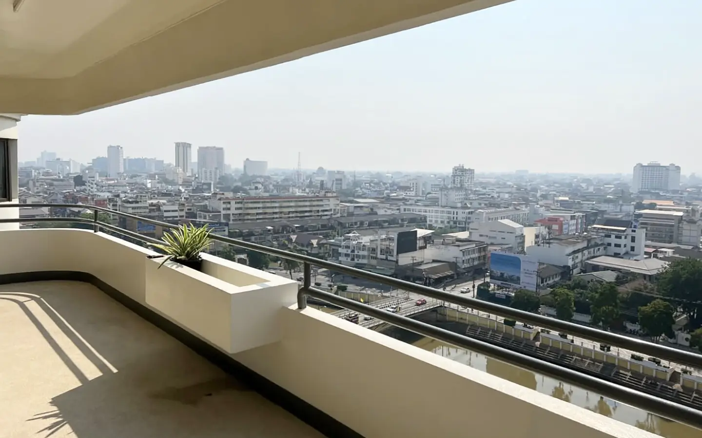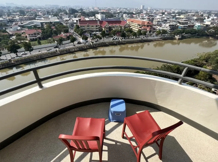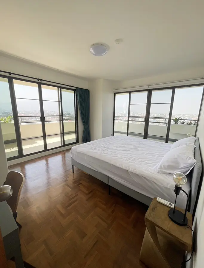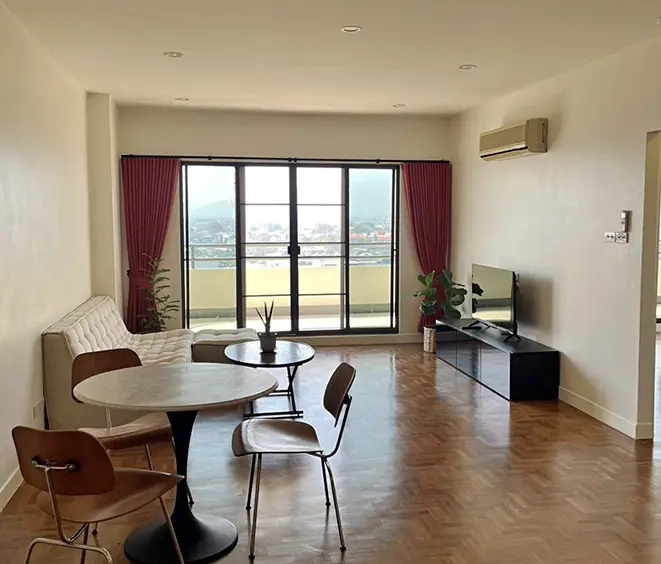 This unit is Northwest corner of the 12th floor with panoramic view facing the Ping River, mountains and city, directly across the river from the historic US Consulate. The location is very central, within a 10 minute walk of the up and coming Chang Moi Creative District, packed with restaurants, cafes and boutiques. Meaung Mai and Wararot markets are just across the bridge and it is a 5 minute drive to the ring road or center of the city and a 15 minute drive to the airport.