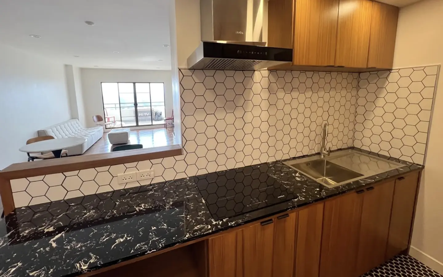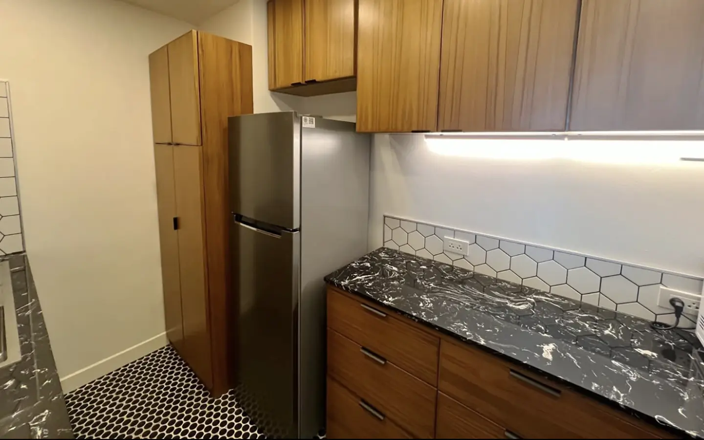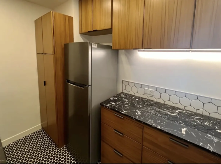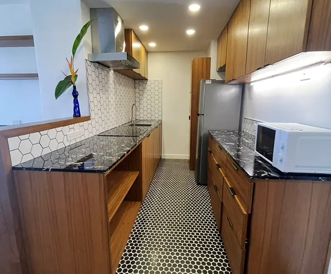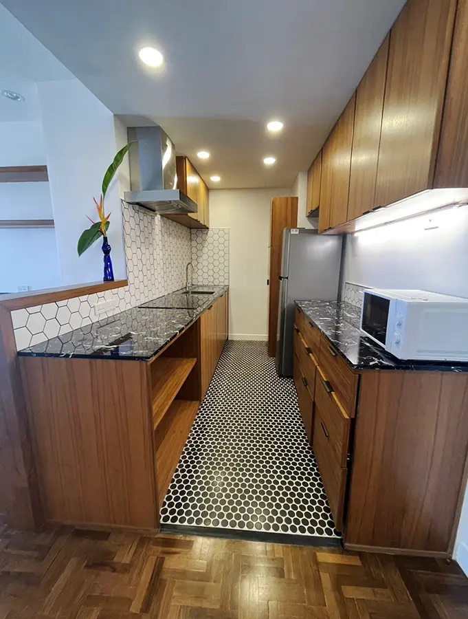 A galley kitchen with custom built teak cabinets and new appliances including an induction hob, fridge, microwave and hood vented into a chimney, European tile floor and backsplash was added to replace a huge, awkwardly laid out 2nd bathroom and tiny "kitchen" corner in the living room. A custom built teak wet bar and bar height counter was put in the location of the old "kitchen". All new compressed stone countertops complete the finishes.