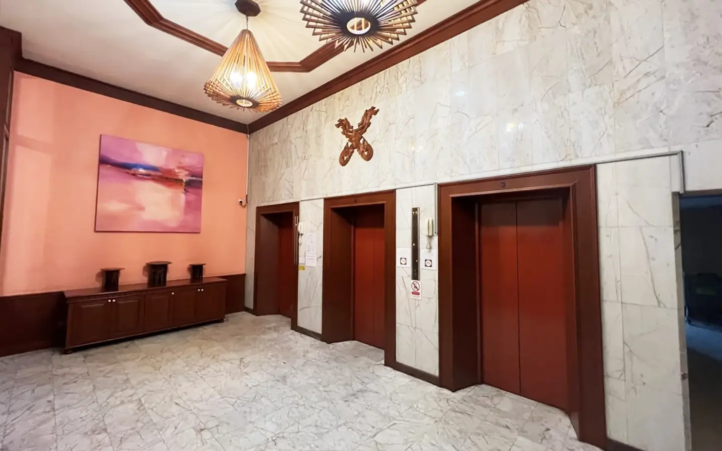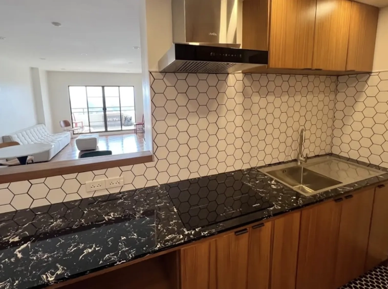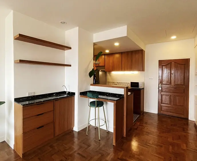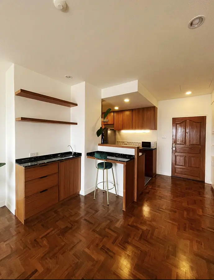 The apartment has had a complete renovation (finished in late 2022) to western standards and ergonomics where possible, with all new paint inside and out, grounded electrical, new plumbing (pipes and fixtures), new raised gypsum board ceiling, window treatments, new LED lighting. The original teak parquet floors were sanded down and refinished. The balcony has a new sand cast (saai lang) floor.