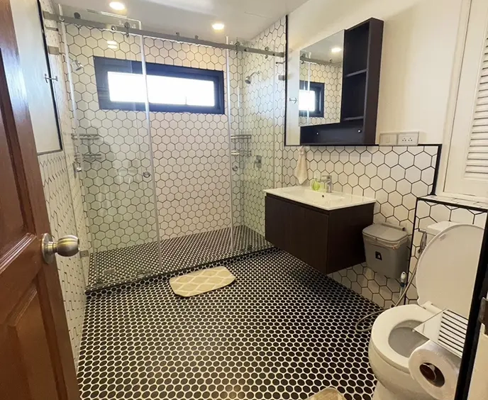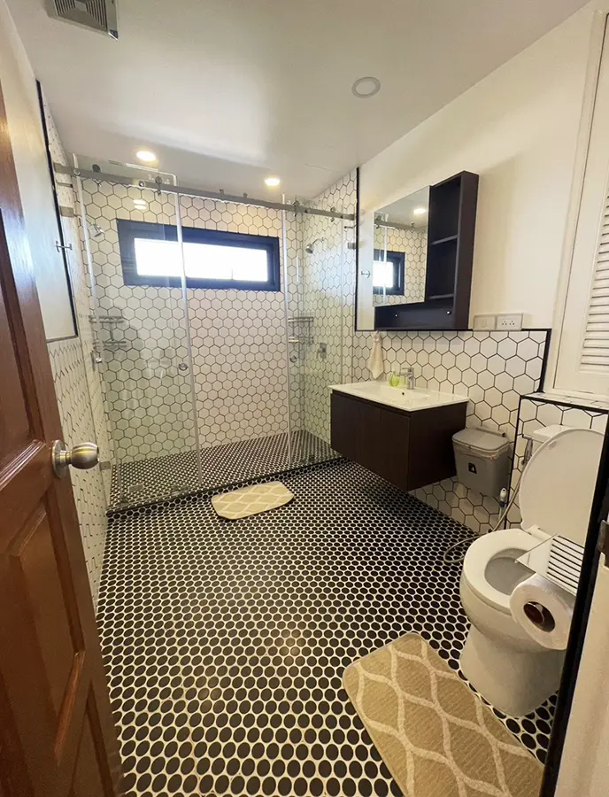 The bathroom was gutted and remodeled with a western style double head shower, European tiles, glass shower doors and new fixtures.