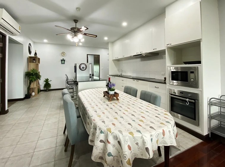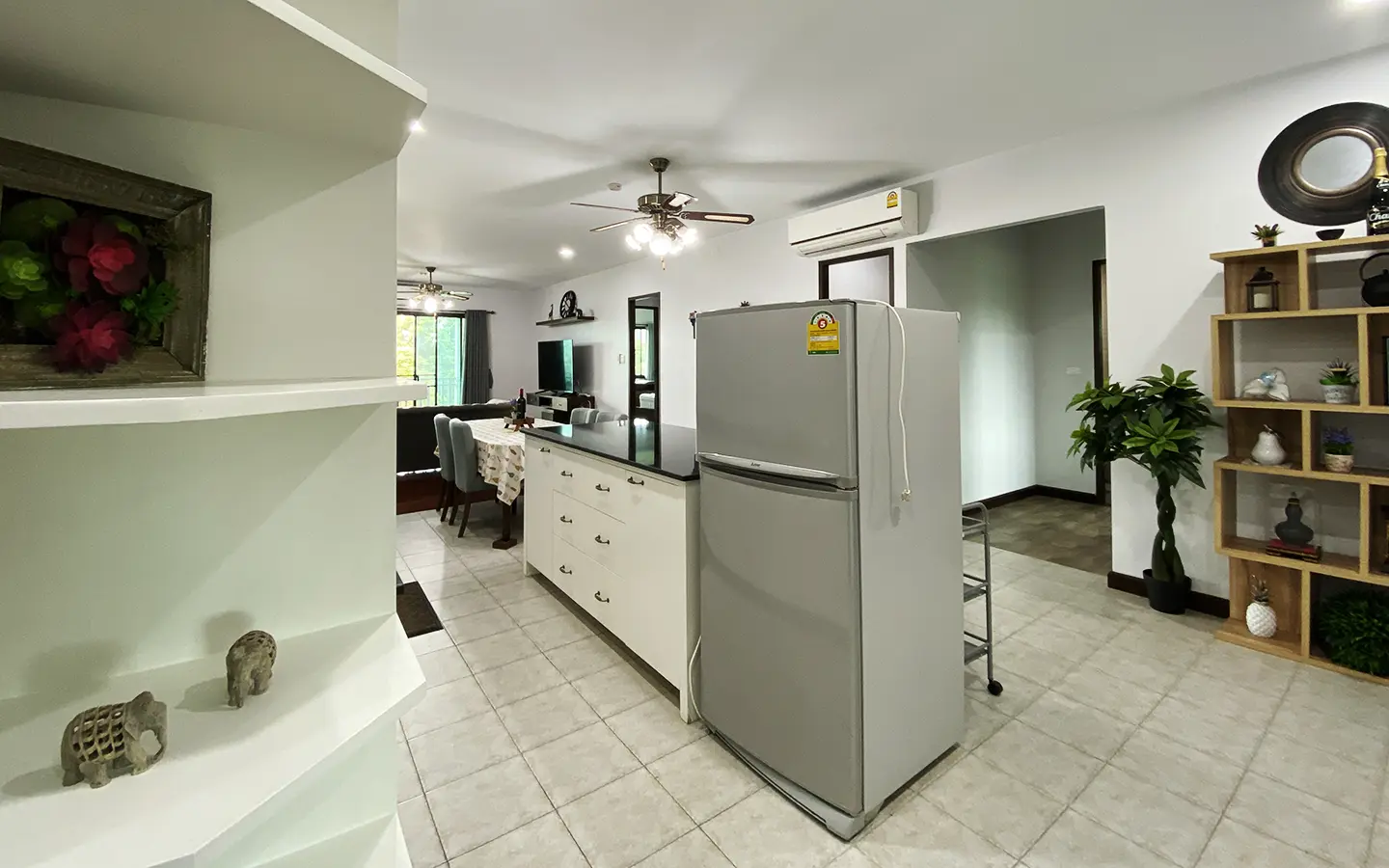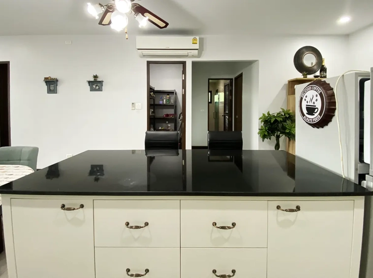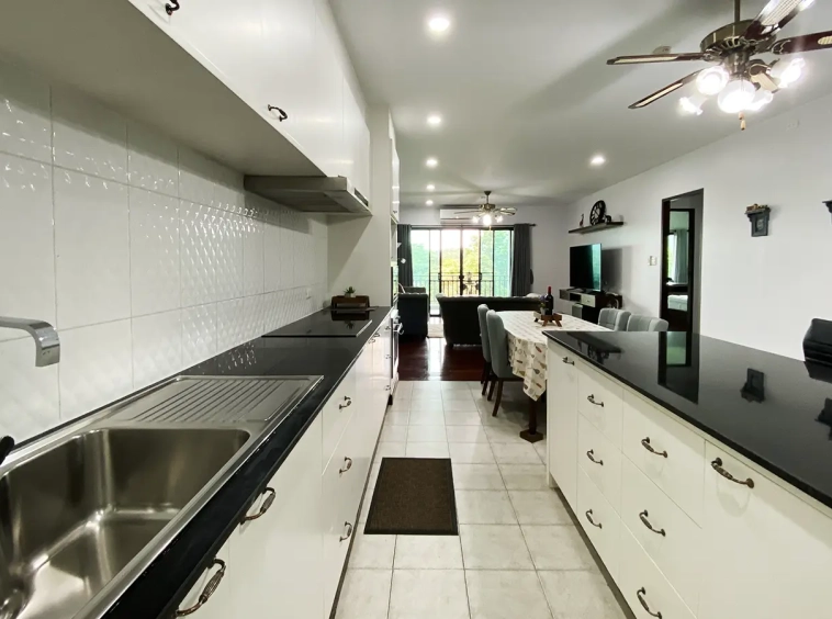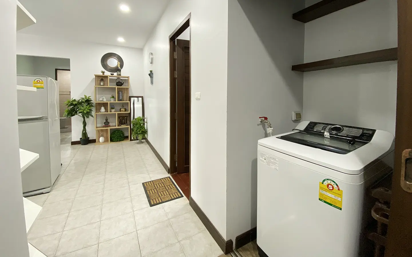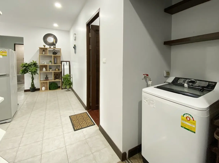 Upon entering, you’ll find a built-in shoe cabinet and storage area to the right, which also includes a washing machine. To the left is a European-style kitchen with a center island that doubles as a breakfast bar, ample built-in storage, and an adjacent dining area.