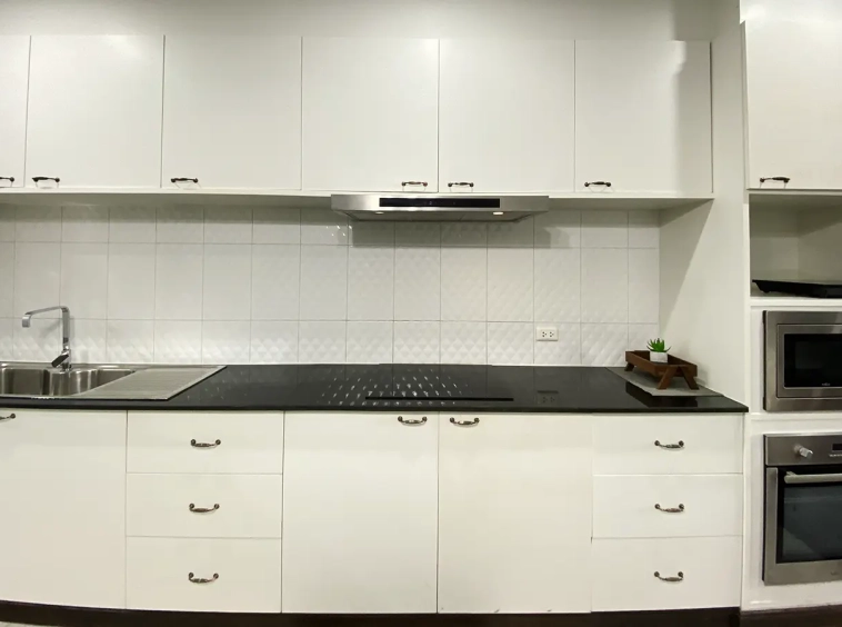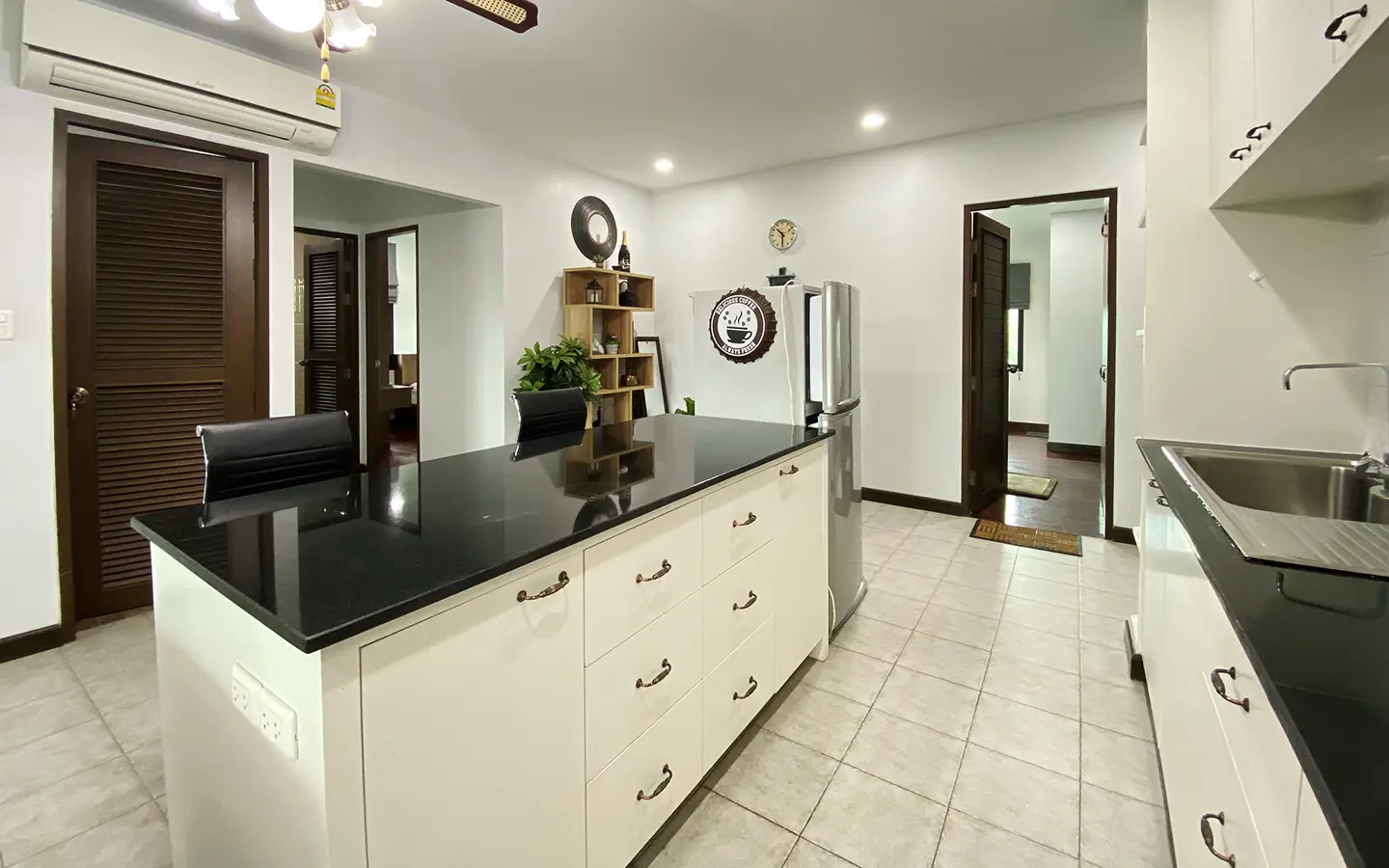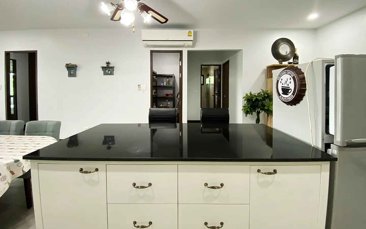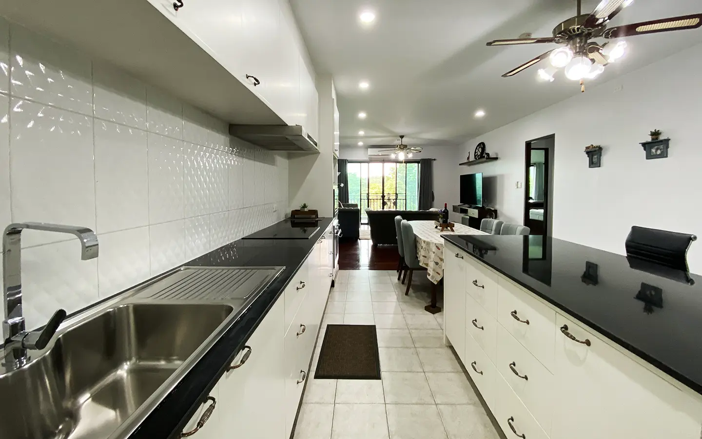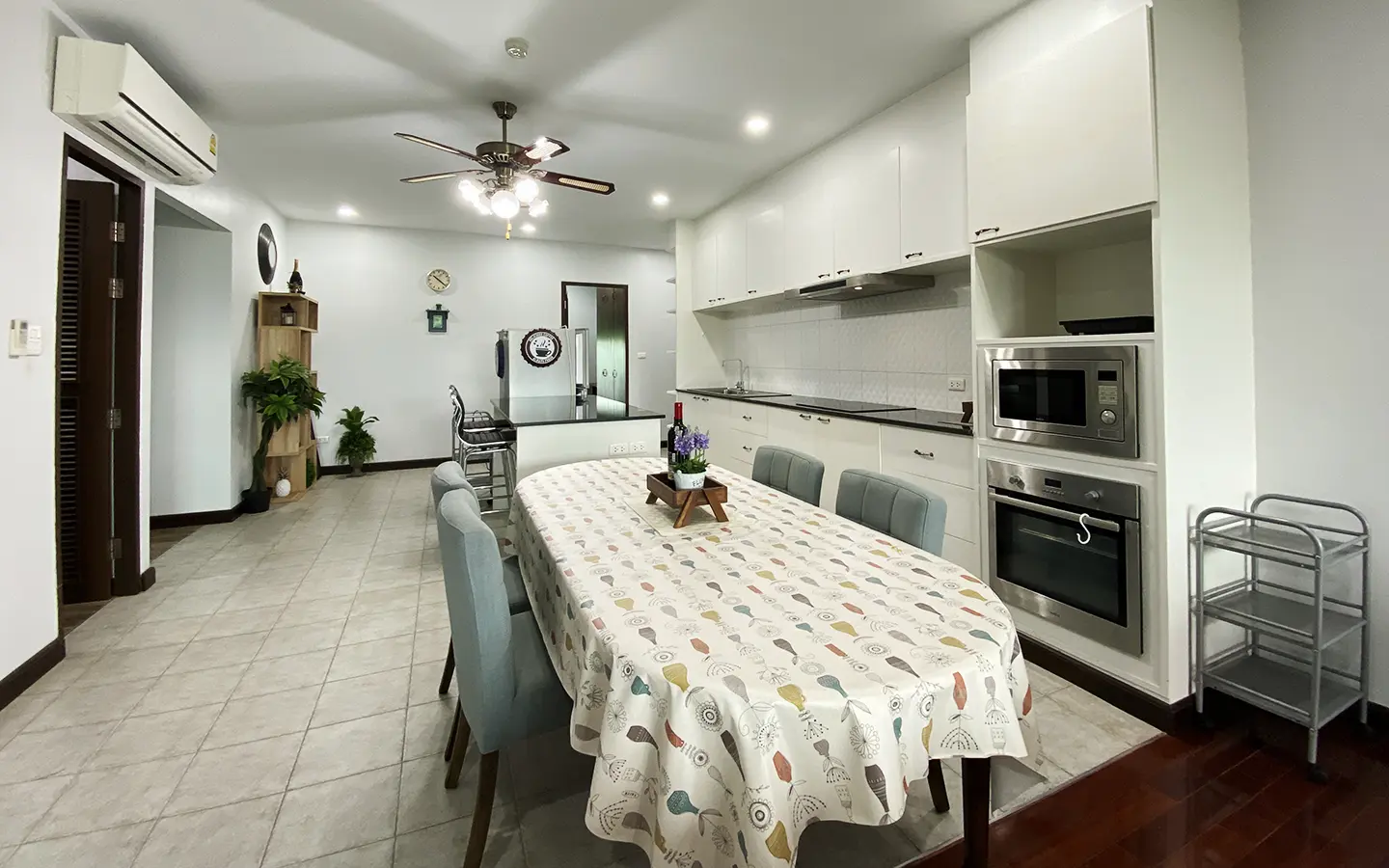 Upon entering, you’ll find a built-in shoe cabinet and storage area to the right, which also includes a washing machine. To the left is a European-style kitchen with a center island that doubles as a breakfast bar, ample built-in storage, and an adjacent dining area.