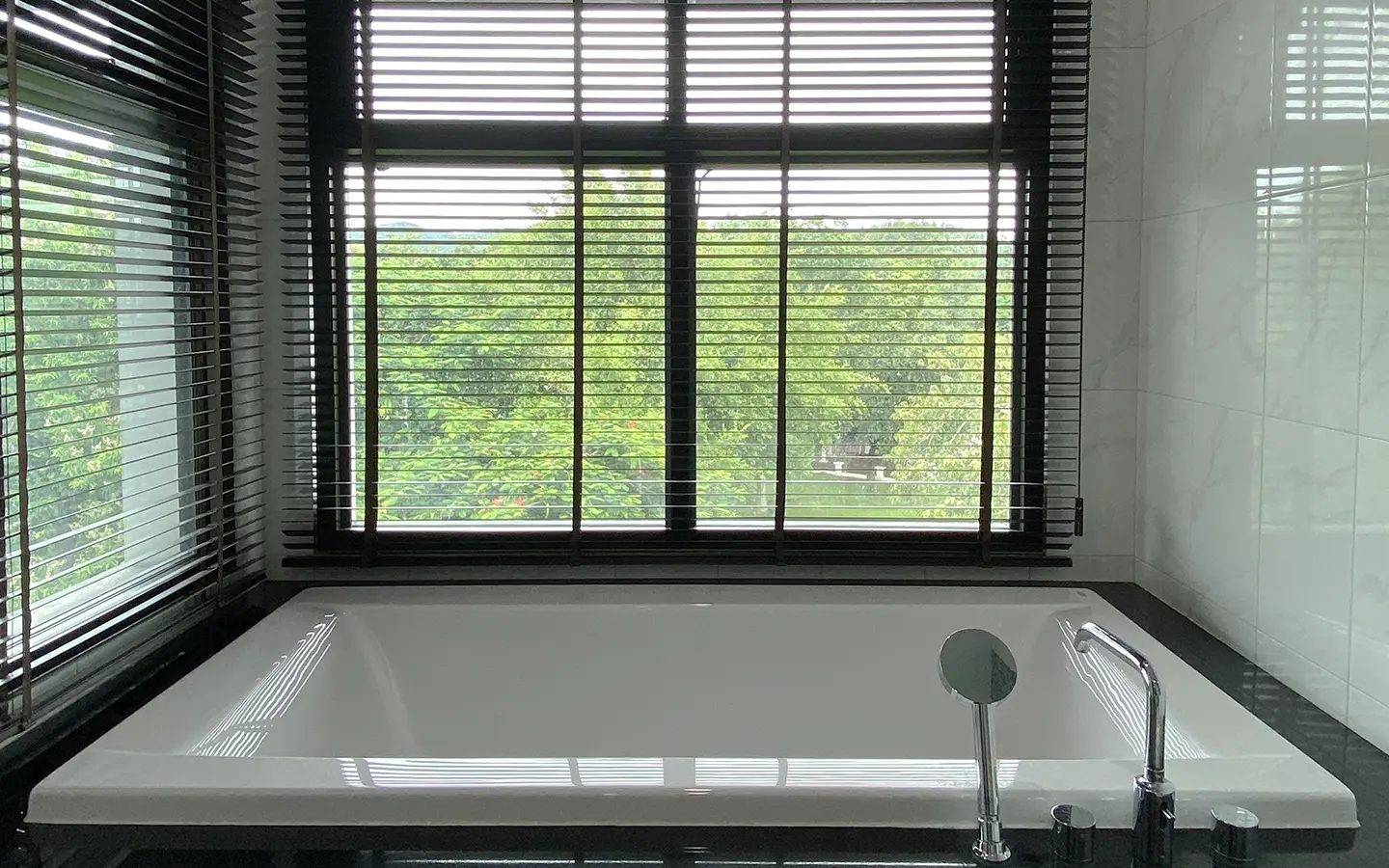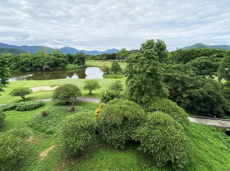 From the living area, you can access the master bedroom, which features a walk-in wardrobe, a private en-suite bathroom with a large bathtub, and a cozy workspace overlooking the golf course.