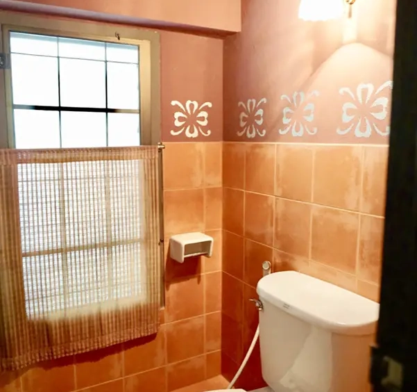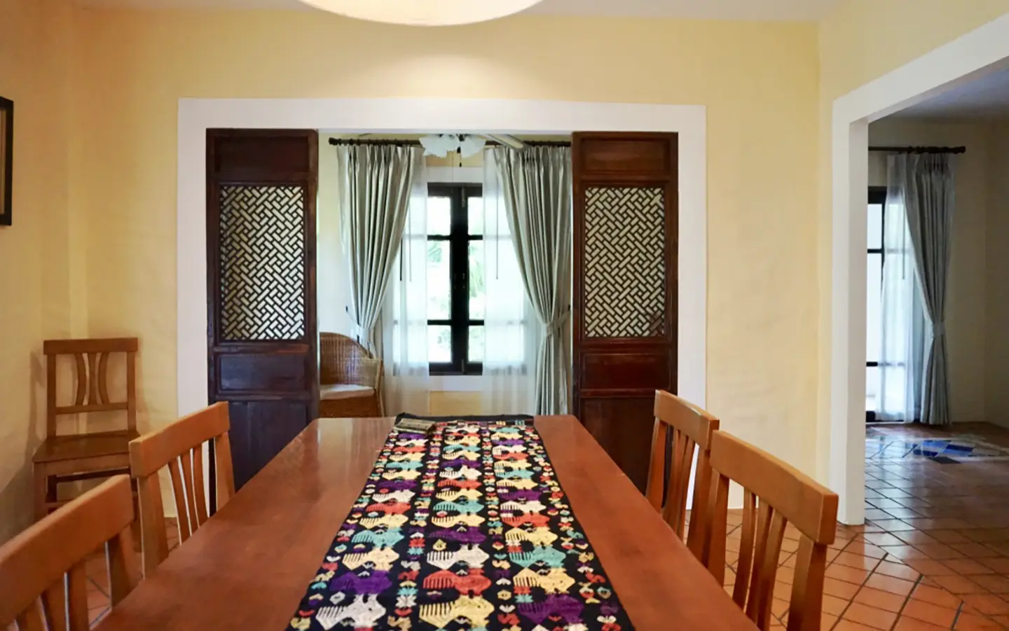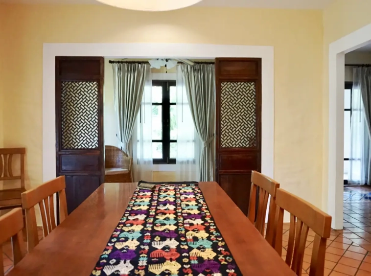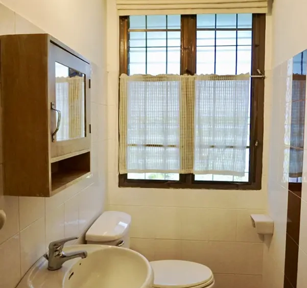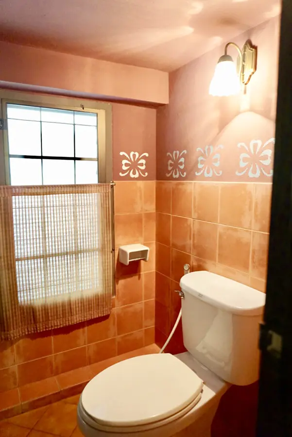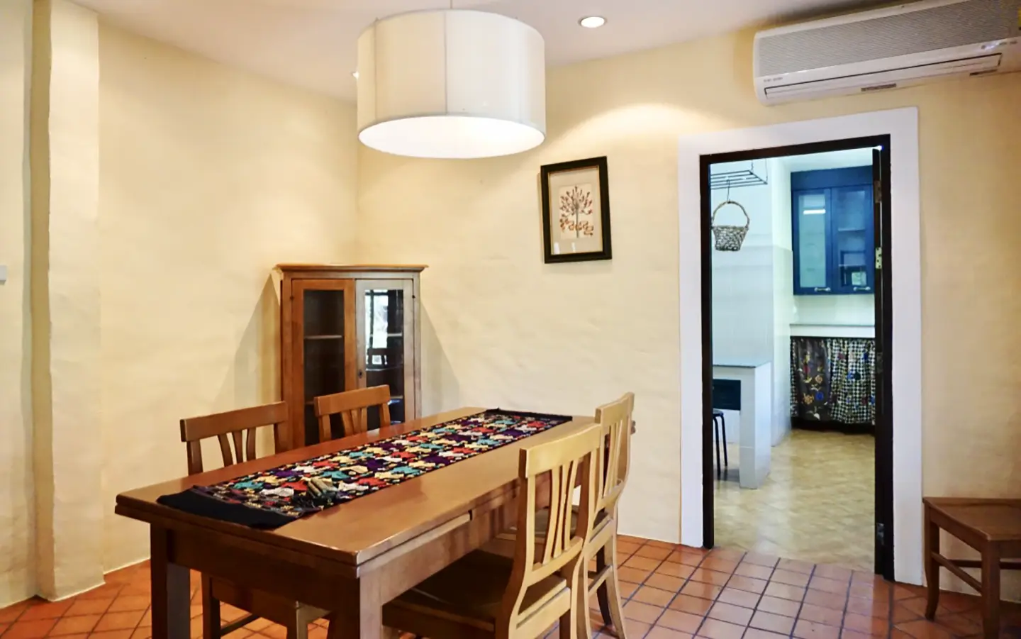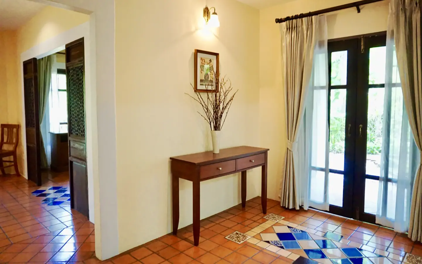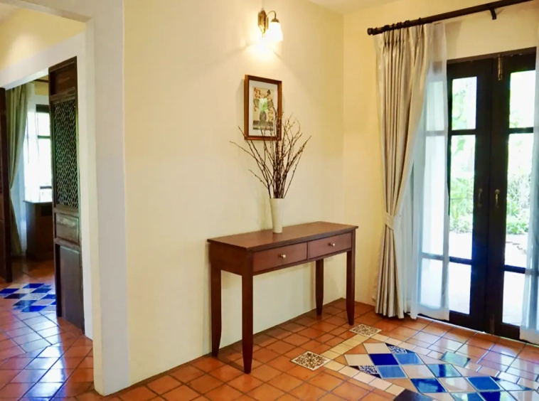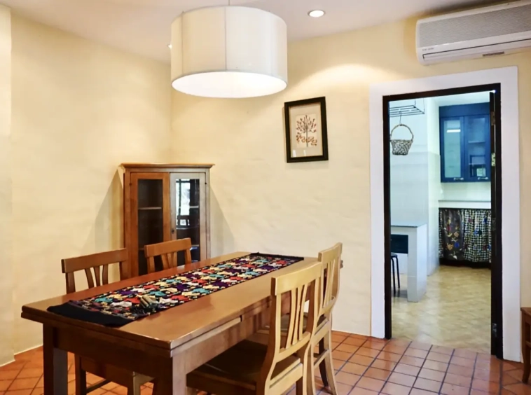 Upstairs the master bedroom has a walk-in closet and ensuite with a bathtub. It has a terrace overlooking the courtyard garden below. The second bedroom shares a family bathroom while the third bedroom is current with no bed but can supply upon request. The third bedroom also has a terrace. All rooms are equipped with a/c and very cosy in European style decoration. Along the house are covered terracotta flooring terraces to sit and enjoy the tranquillity of the courtyard garden.