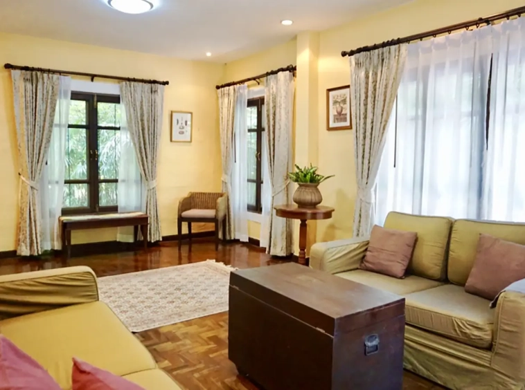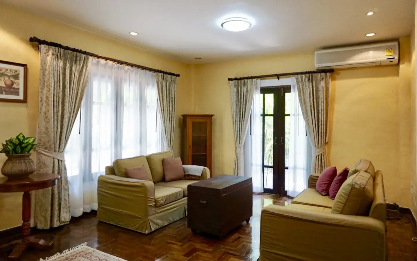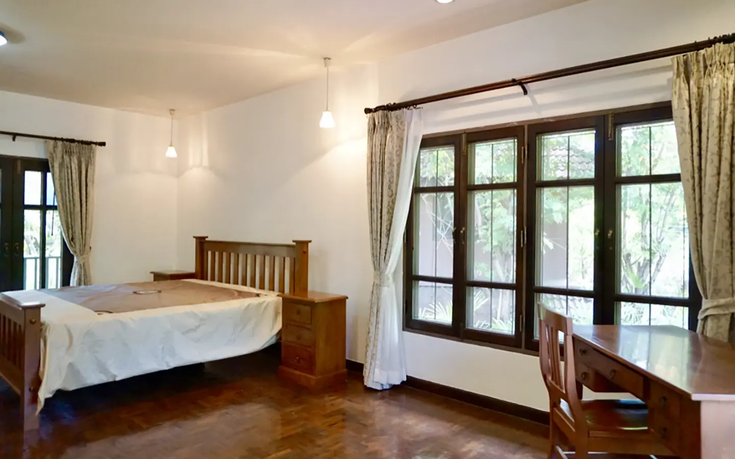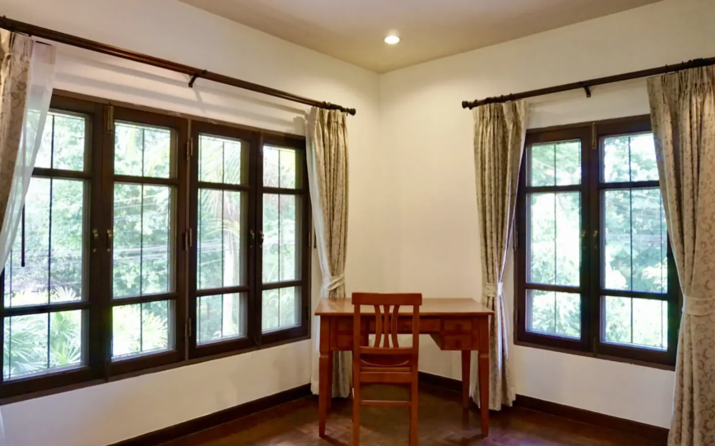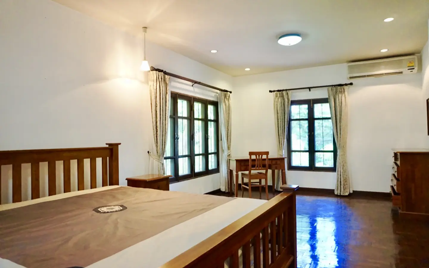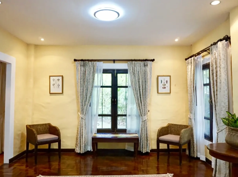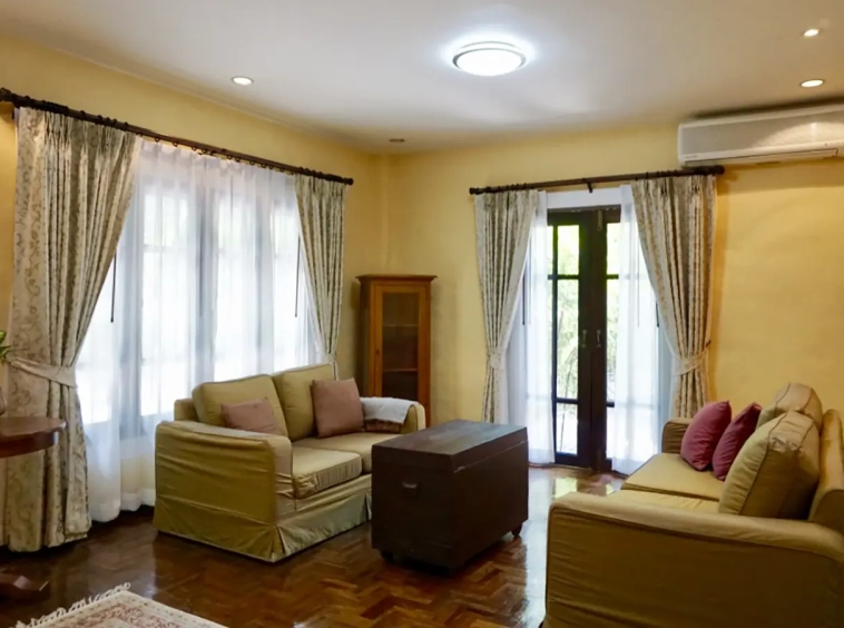 Unique European style 3 bedroom house for rent fully furnished in Chiang Mai. Located in a private small gated community of nine houses and six apartments. Located just off the Canal Road, a stone throw from Huay Kaew junction, easy distance to Maya Mall, Nimmanhemin area, Chiang Mai University a mere 10 minutes drive to the airport.