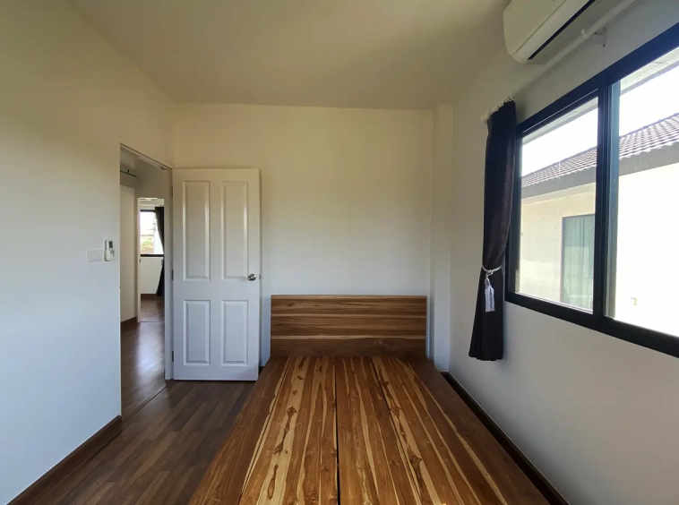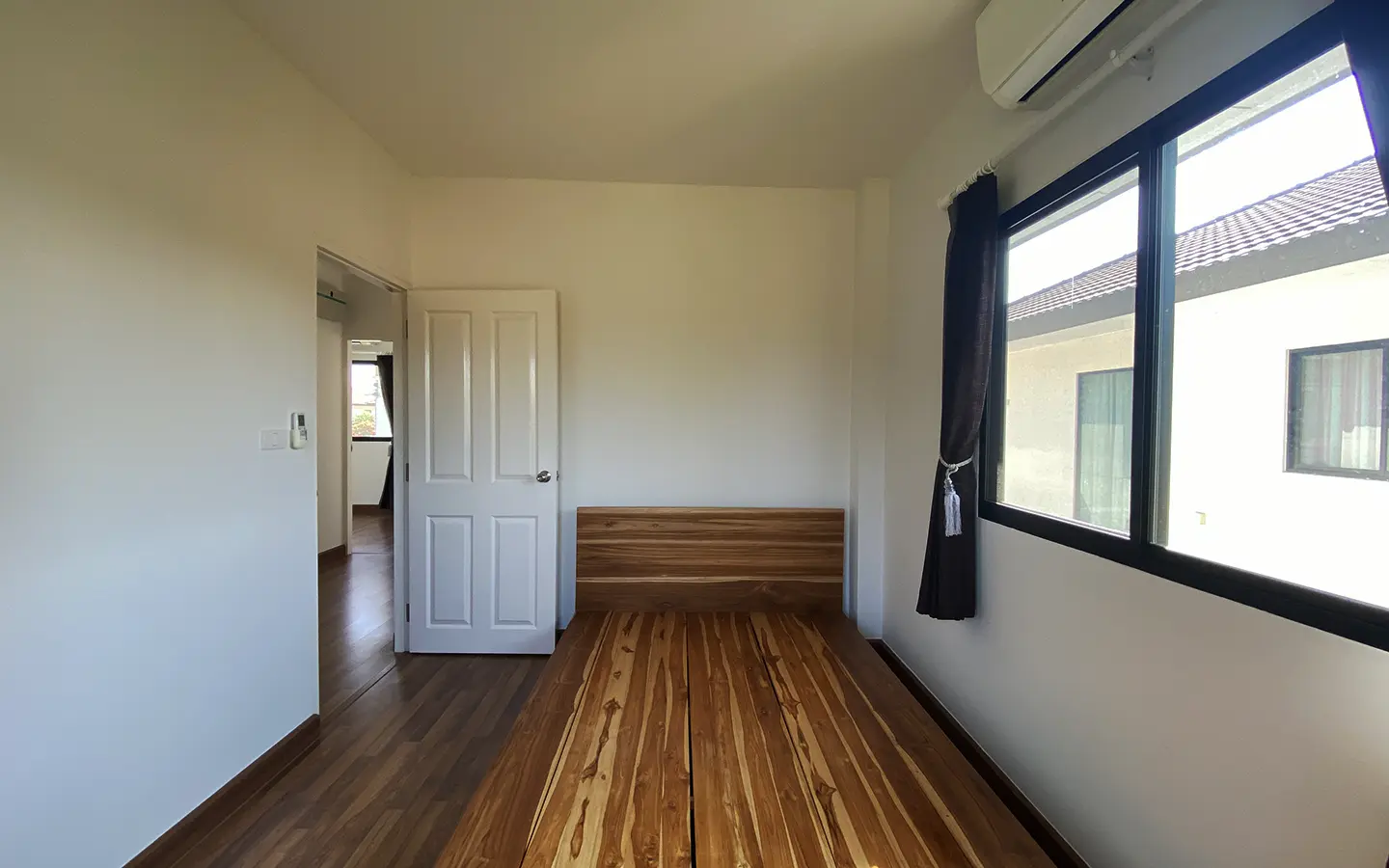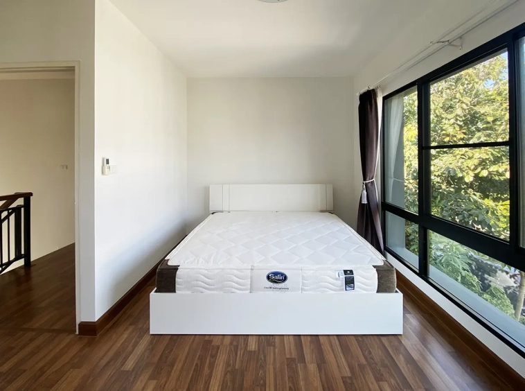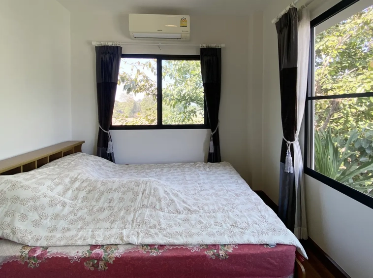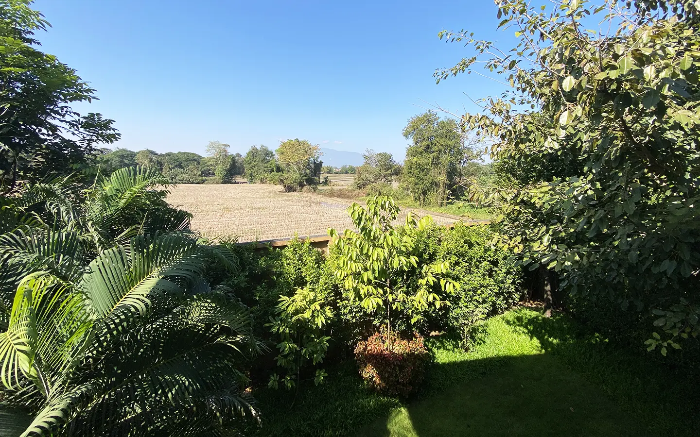 The house has a covered carport and nice mature garden with trees at the front and lawn with some trees and shrubs and the back. Inside, there is open plan living with the dining area having glass doors to ceiling access to the garden and providing natural light. There is a guest bathroom and kitchen with access to the laundry room where the fridge/freezer and washing machine are located. Going up on the beautiful wooden staircase are the 3 bedrooms. The master bedroom has wall to wall and floor to ceiling window and comes with a matching bedroom set. It is ensuite with a shower. Two further bedrooms sharing a family bathroom with shower. The guest bedroom offers a view of the mountain as well as rice paddy.