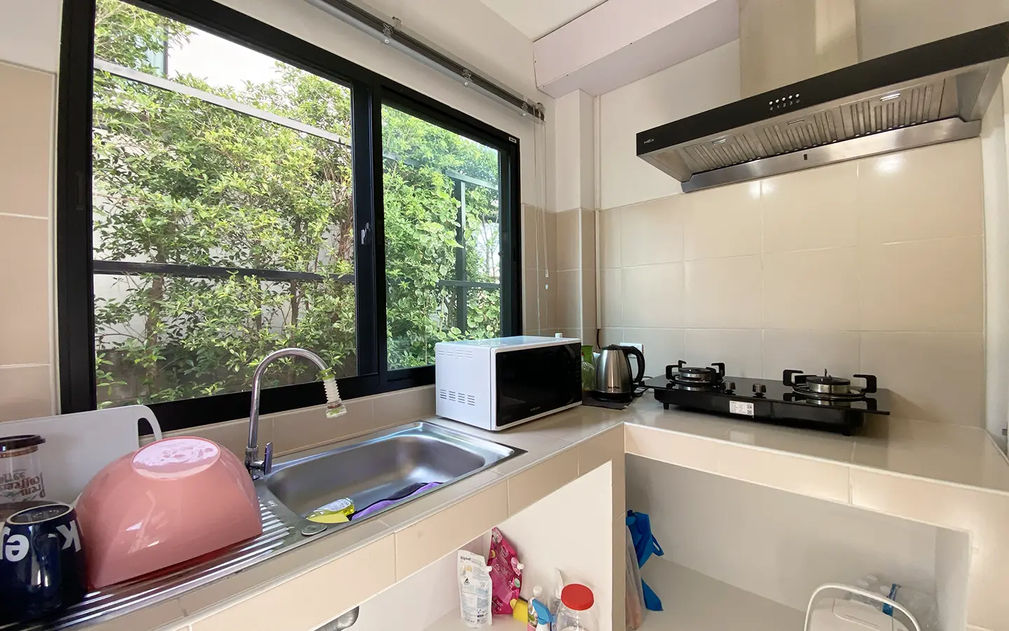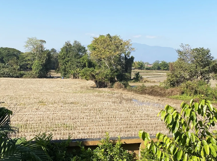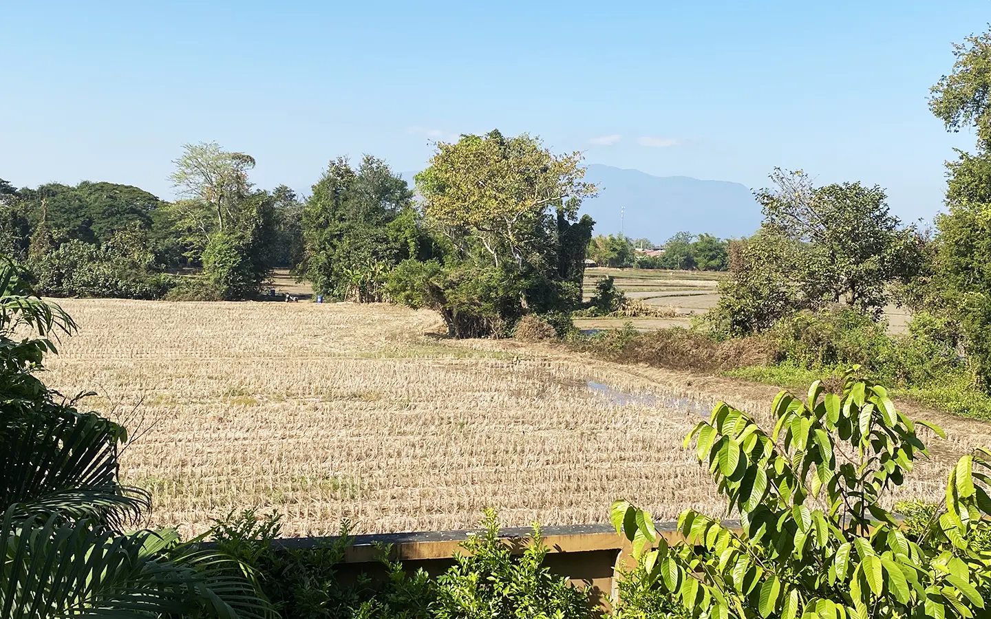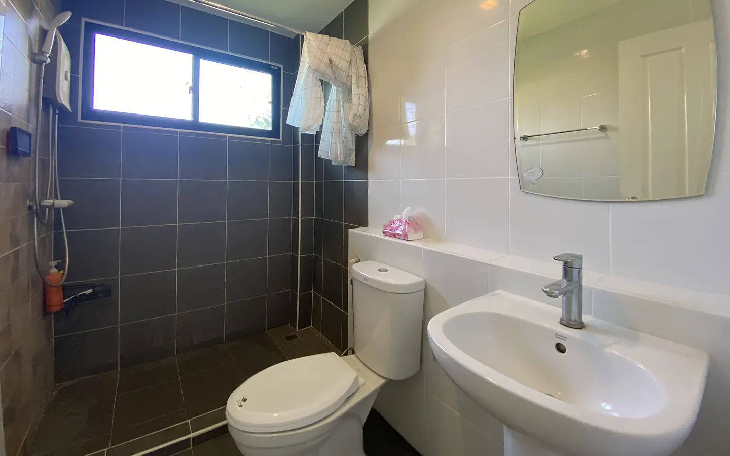 The house has a covered carport and nice mature garden with trees at the front and lawn with some trees and shrubs and the back. Inside, there is open plan living with the dining area having glass doors to ceiling access to the garden and providing natural light. There is a guest bathroom and kitchen with access to the laundry room where the fridge/freezer and washing machine are located. Going up on the beautiful wooden staircase are the 3 bedrooms. The master bedroom has wall to wall and floor to ceiling window and comes with a matching bedroom set. It is ensuite with a shower. Two further bedrooms sharing a family bathroom with shower. The guest bedroom offers a view of the mountain as well as rice paddy.