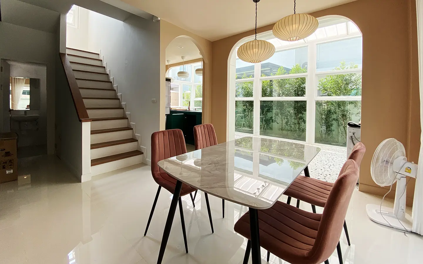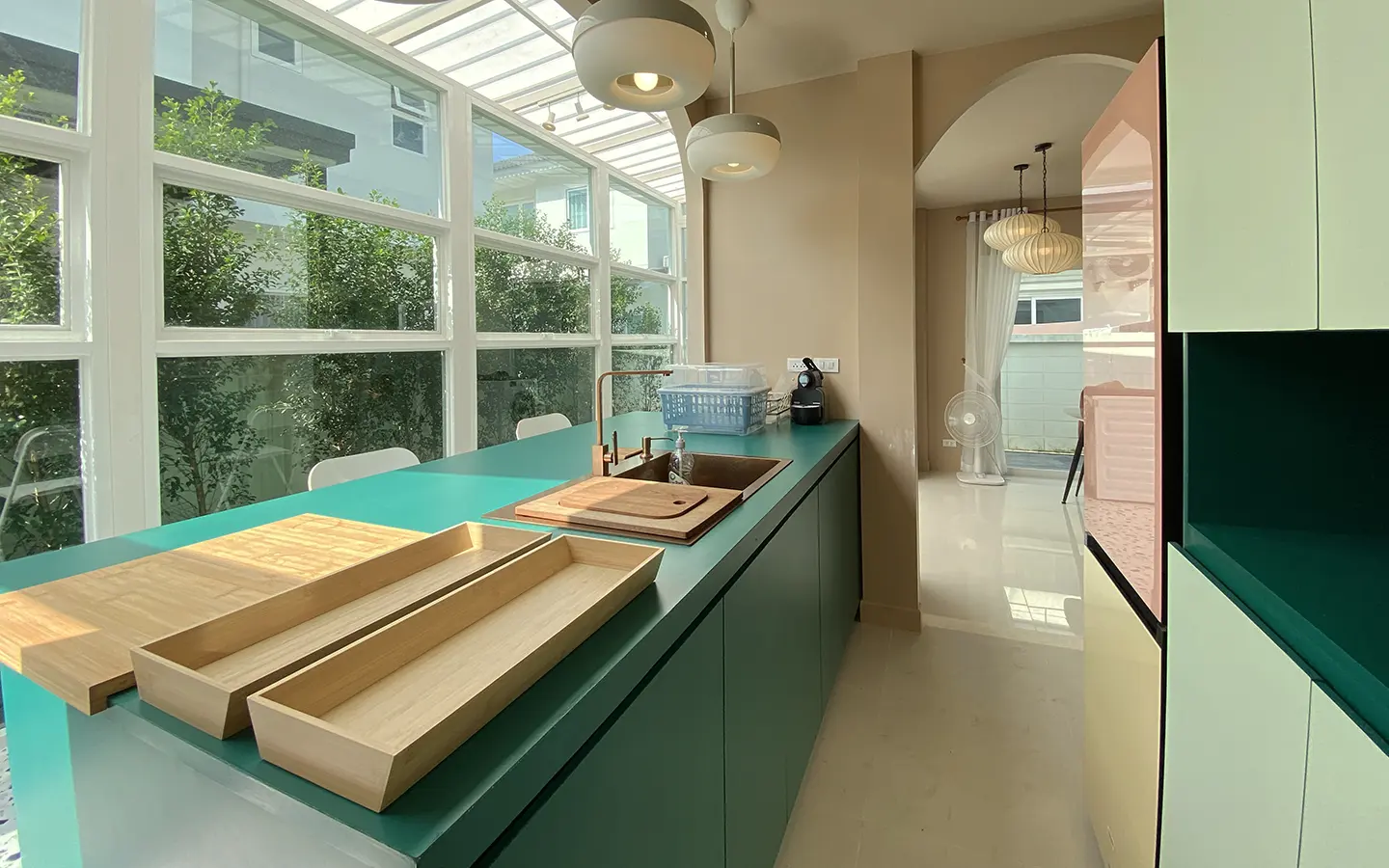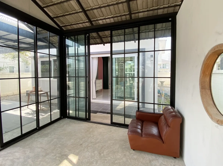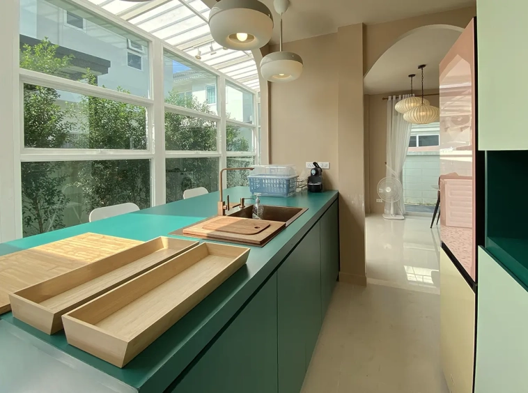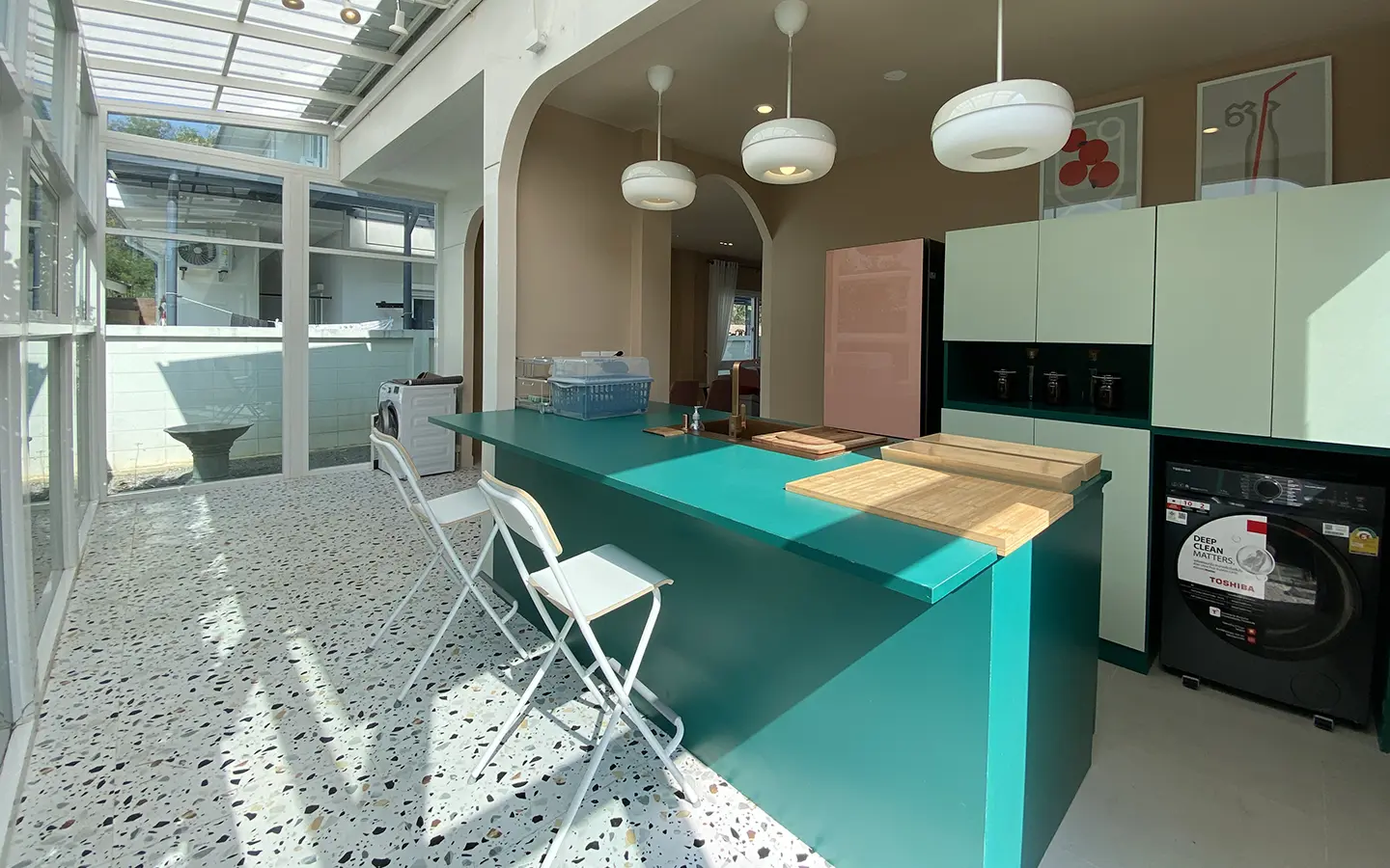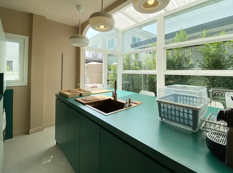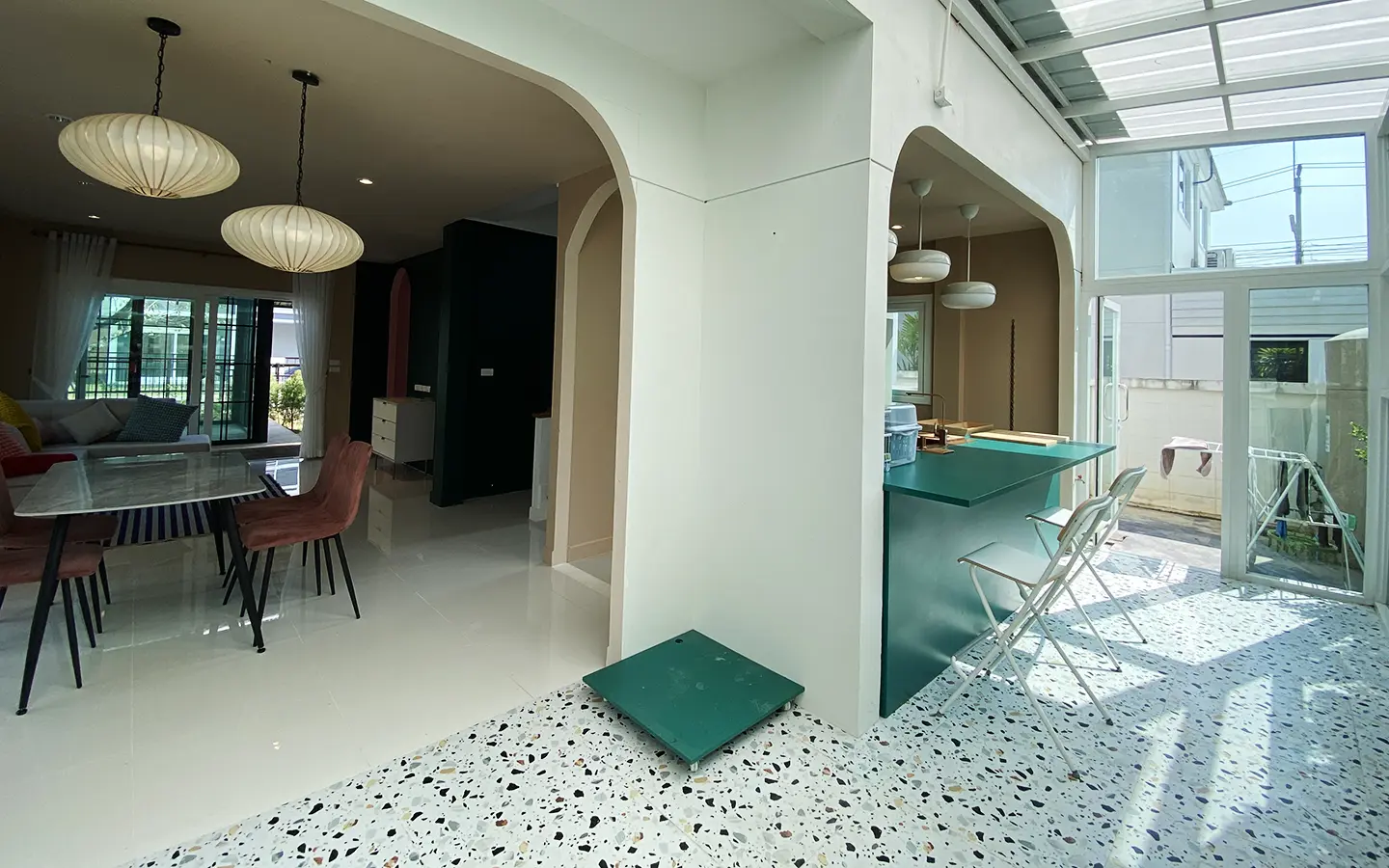 This house sits on a decent-sized plot of land with a paved driveway into a covered parking area and a conservatory-style sun lounge on the right, perfect for afternoon tea or just chilling and enjoying the outdoors. Inside, the open-plan living room has a sitting area with a comfortable L-shape sofa, dining table, and arch doors leading to a multipurpose or TV room to the left. Large glass doors and windows on all sides with floor-to-ceiling curtains give a luxury feel. There is a guest bathroom beneath the staircase. Straight on is an extension containing a fitted kitchen with a food preparation island and breakfast bar. This area has glass walls and ceiling providing good natural light and door access to the washing area.