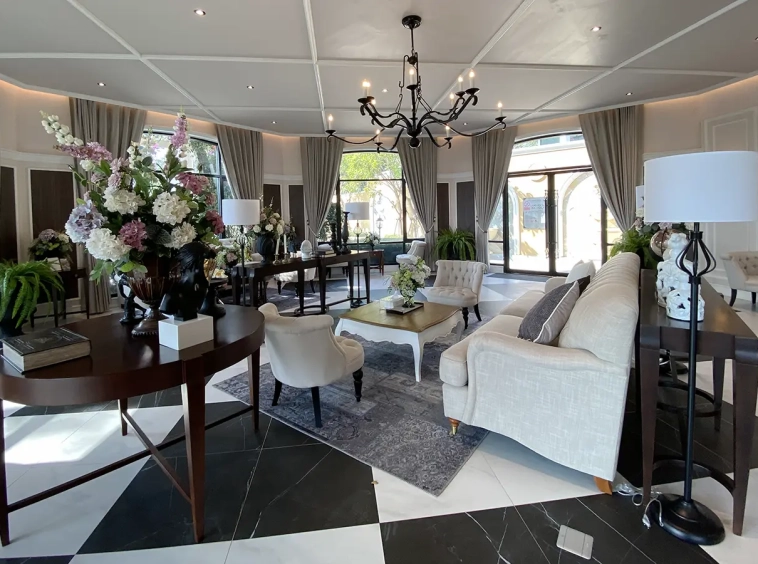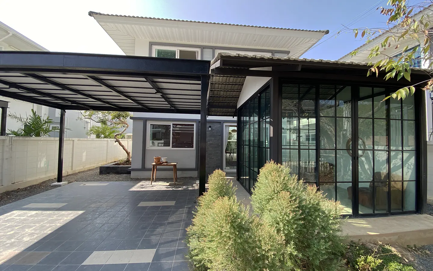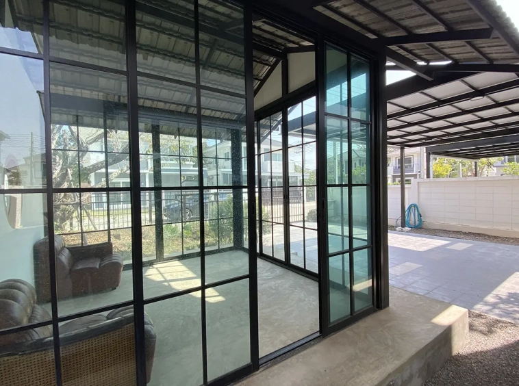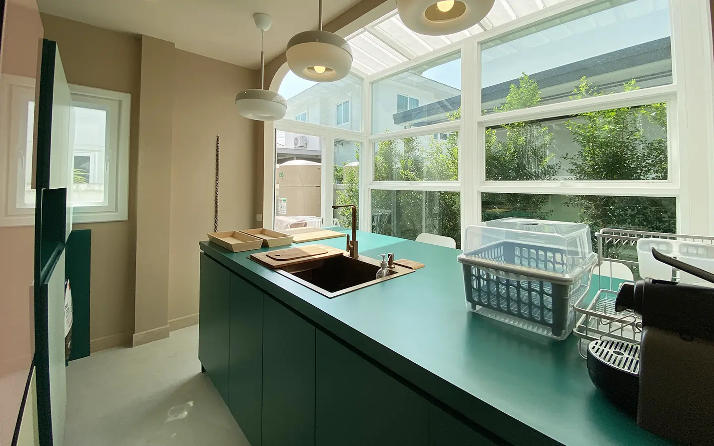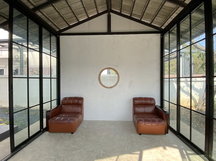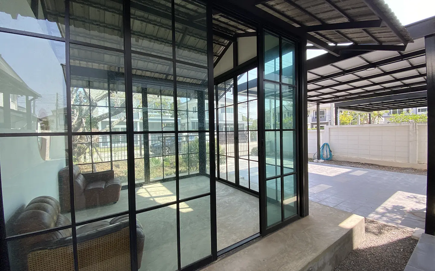 This house sits on a decent-sized plot of land with a paved driveway into a covered parking area and a conservatory-style sun lounge on the right, perfect for afternoon tea or just chilling and enjoying the outdoors. Inside, the open-plan living room has a sitting area with a comfortable L-shape sofa, dining table, and arch doors leading to a multipurpose or TV room to the left. Large glass doors and windows on all sides with floor-to-ceiling curtains give a luxury feel. There is a guest bathroom beneath the staircase. Straight on is an extension containing a fitted kitchen with a food preparation island and breakfast bar. This area has glass walls and ceiling providing good natural light and door access to the washing area.