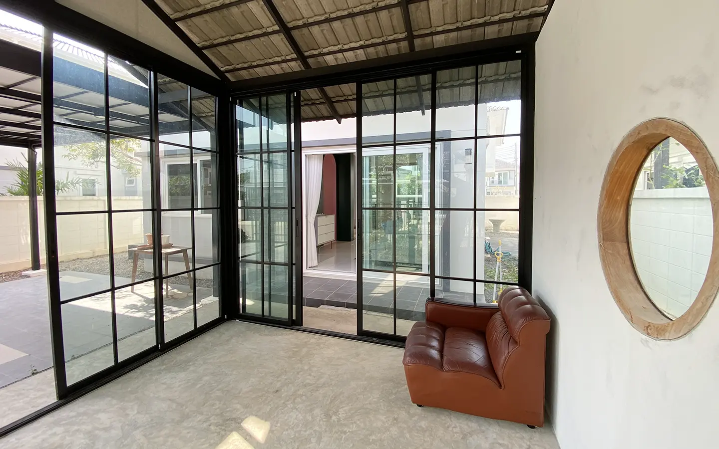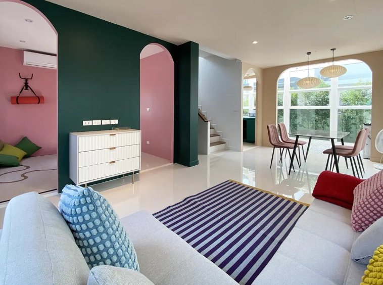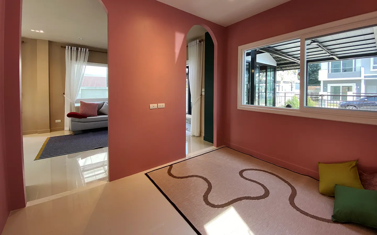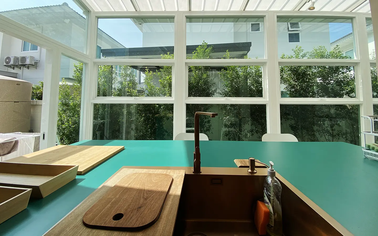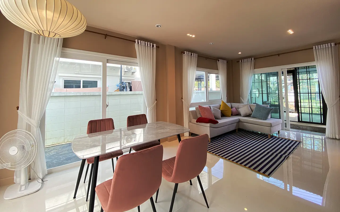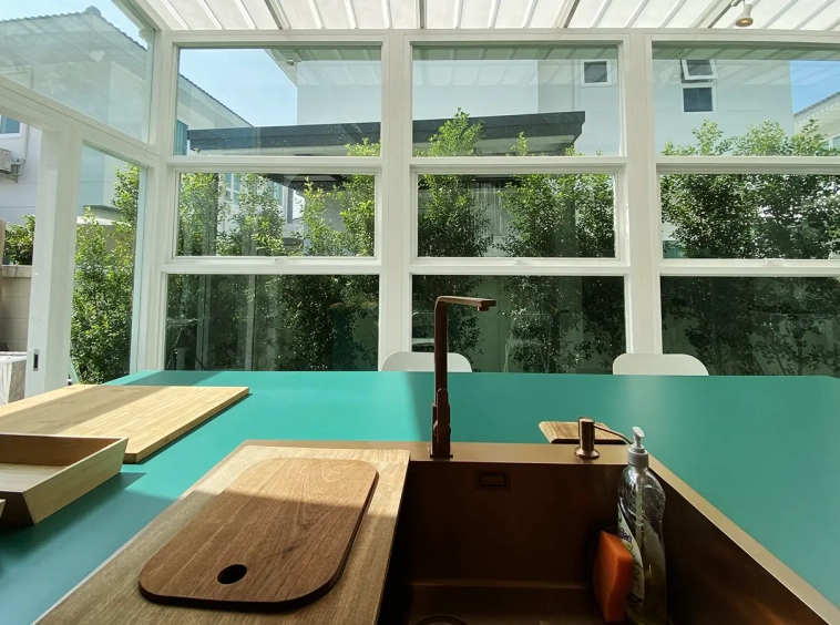 This house sits on a decent-sized plot of land with a paved driveway into a covered parking area and a conservatory-style sun lounge on the right, perfect for afternoon tea or just chilling and enjoying the outdoors. Inside, the open-plan living room has a sitting area with a comfortable L-shape sofa, dining table, and arch doors leading to a multipurpose or TV room to the left. Large glass doors and windows on all sides with floor-to-ceiling curtains give a luxury feel. There is a guest bathroom beneath the staircase. Straight on is an extension containing a fitted kitchen with a food preparation island and breakfast bar. This area has glass walls and ceiling providing good natural light and door access to the washing area.
