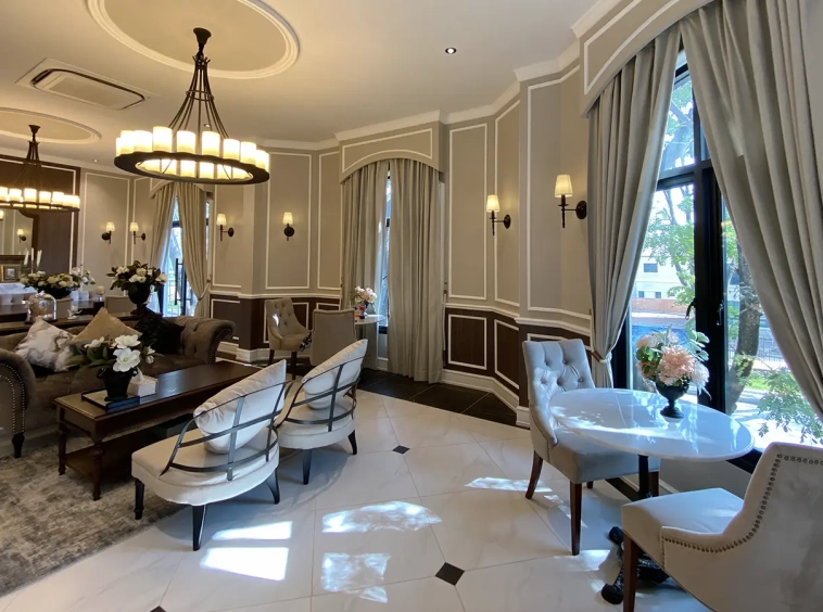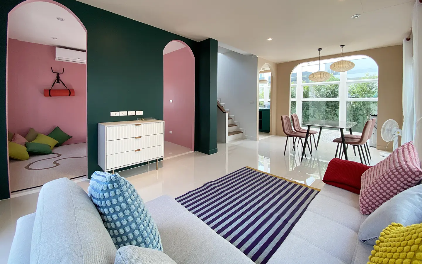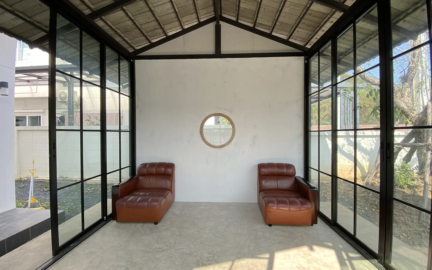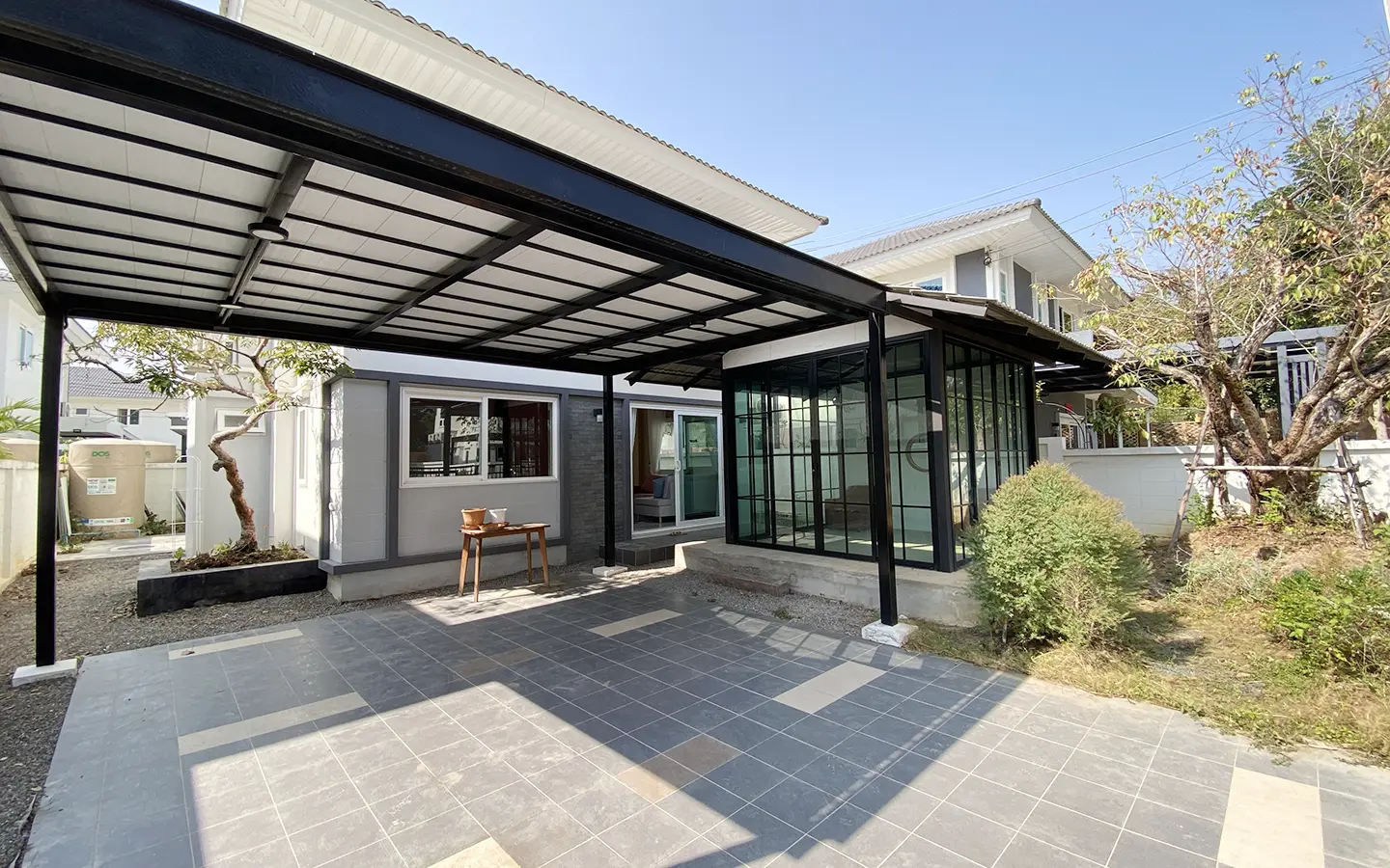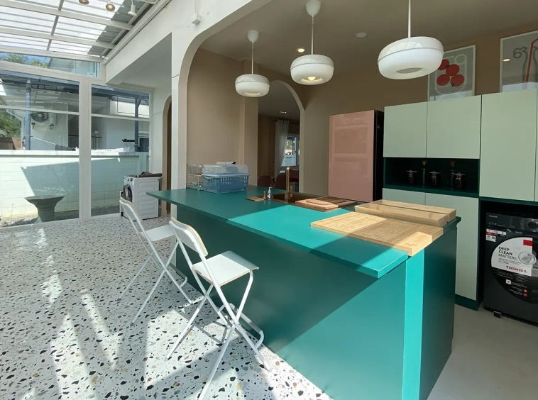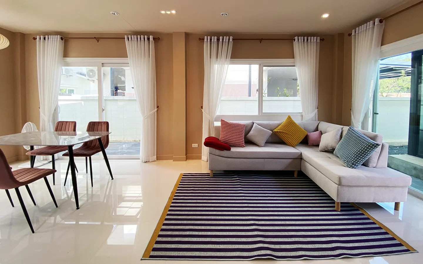 This house sits on a decent-sized plot of land with a paved driveway into a covered parking area and a conservatory-style sun lounge on the right, perfect for afternoon tea or just chilling and enjoying the outdoors. Inside, the open-plan living room has a sitting area with a comfortable L-shape sofa, dining table, and arch doors leading to a multipurpose or TV room to the left. Large glass doors and windows on all sides with floor-to-ceiling curtains give a luxury feel. There is a guest bathroom beneath the staircase. Straight on is an extension containing a fitted kitchen with a food preparation island and breakfast bar. This area has glass walls and ceiling providing good natural light and door access to the washing area.