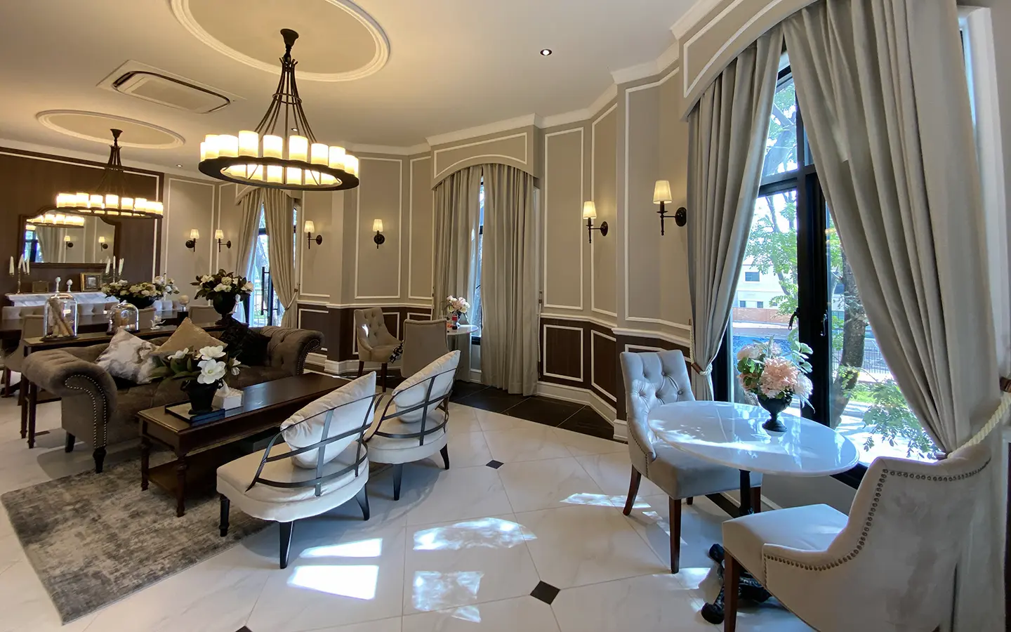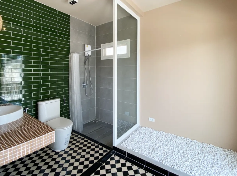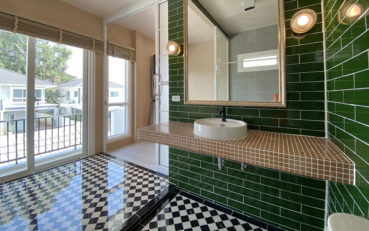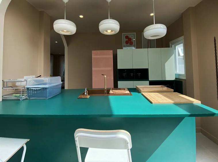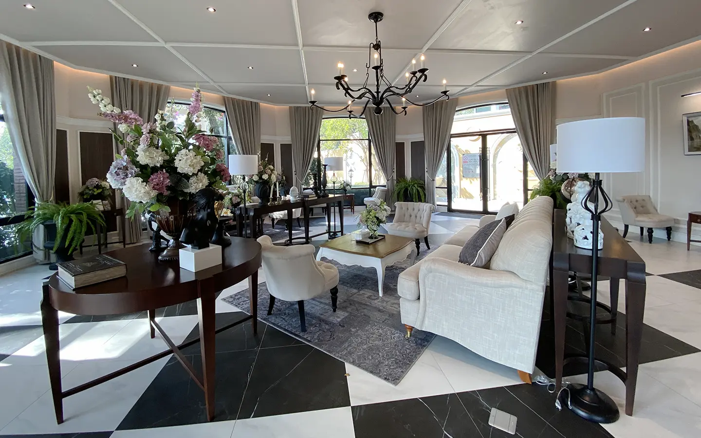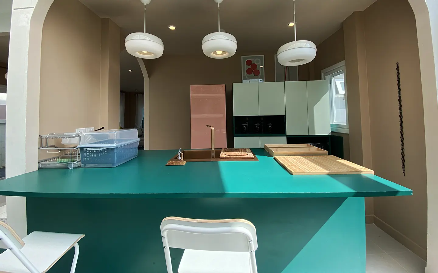 This house sits on a decent-sized plot of land with a paved driveway into a covered parking area and a conservatory-style sun lounge on the right, perfect for afternoon tea or just chilling and enjoying the outdoors. Inside, the open-plan living room has a sitting area with a comfortable L-shape sofa, dining table, and arch doors leading to a multipurpose or TV room to the left. Large glass doors and windows on all sides with floor-to-ceiling curtains give a luxury feel. There is a guest bathroom beneath the staircase. Straight on is an extension containing a fitted kitchen with a food preparation island and breakfast bar. This area has glass walls and ceiling providing good natural light and door access to the washing area.