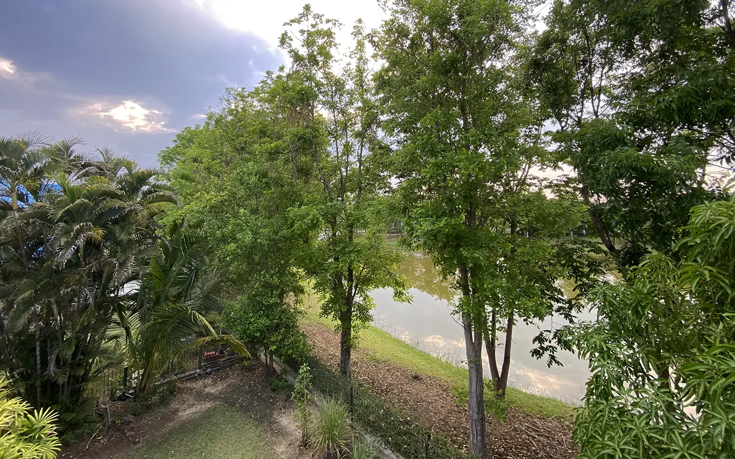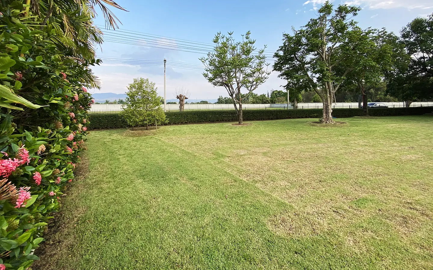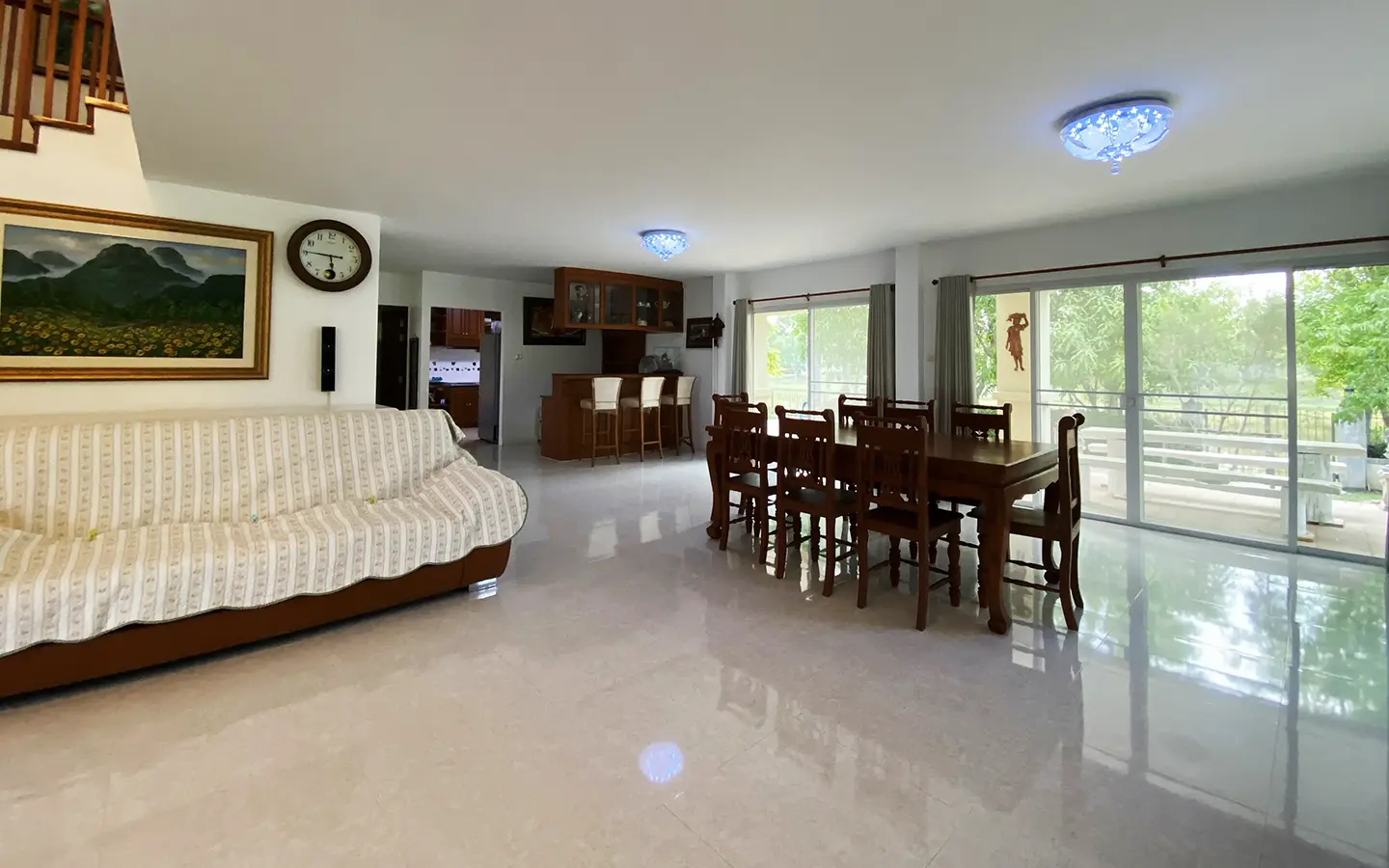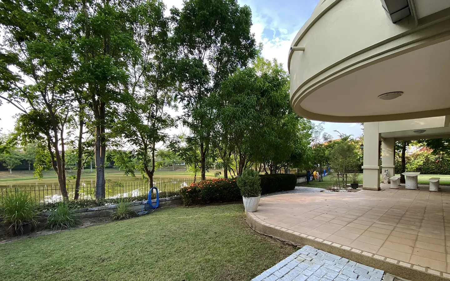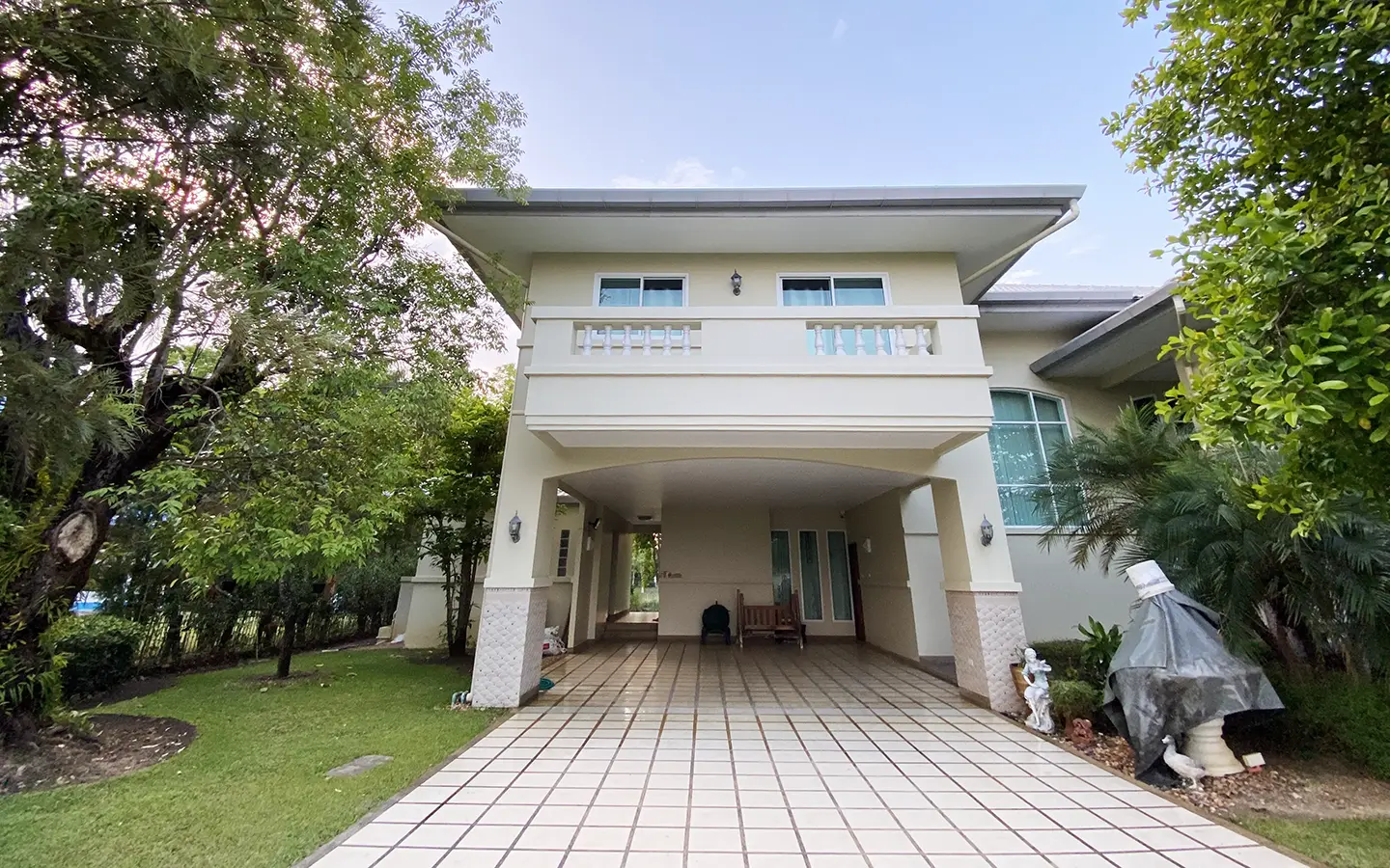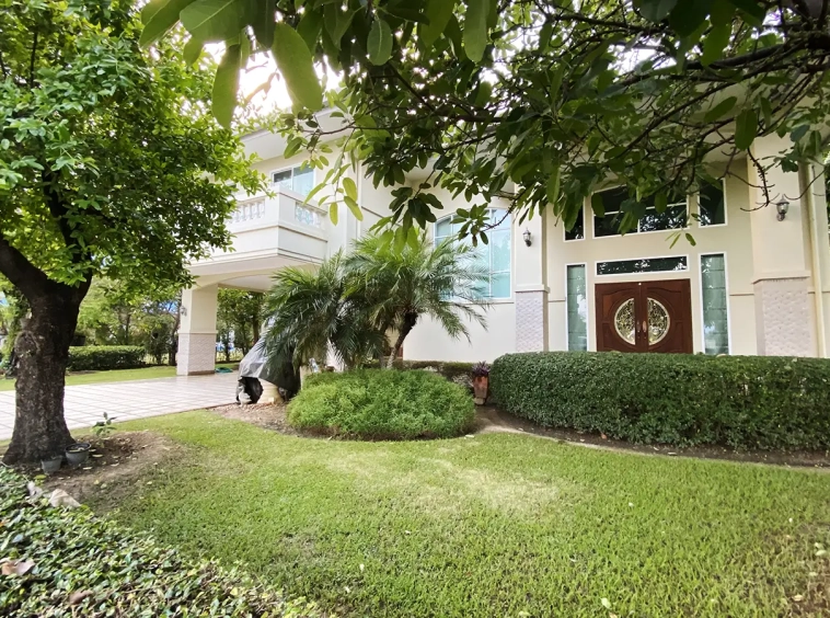 The house has only been used as a vacation home and has recently undergone a renovation and is in great shape. The garden is well-kept and has a large manicured lawn with views of the mountain, and several mature trees and shrubs. A covered carport comes with a storage room attached. Inside, the open plan living area has a partly double tall ceiling, a sitting area, a dining area, a counter bar and through to the Western kitchen, a guest bathroom, a utility room and access to the maid's quarter. There is a large terrace running alongside the living area of the house. At the rear of the house, there is a lake and green area with a terrace to enjoy as well as a small gate access to go for a morning walk.