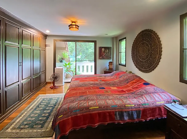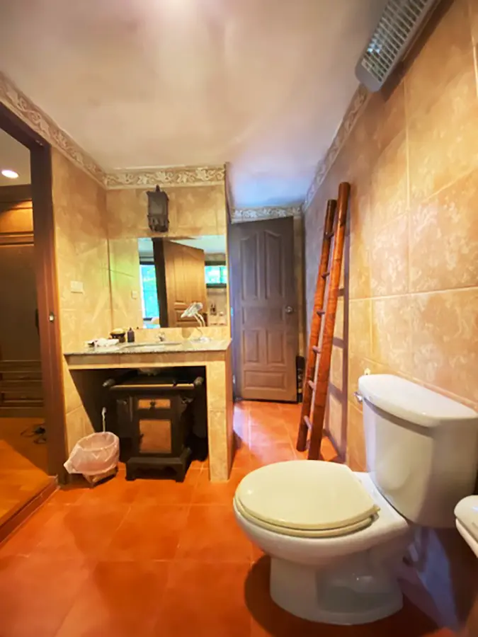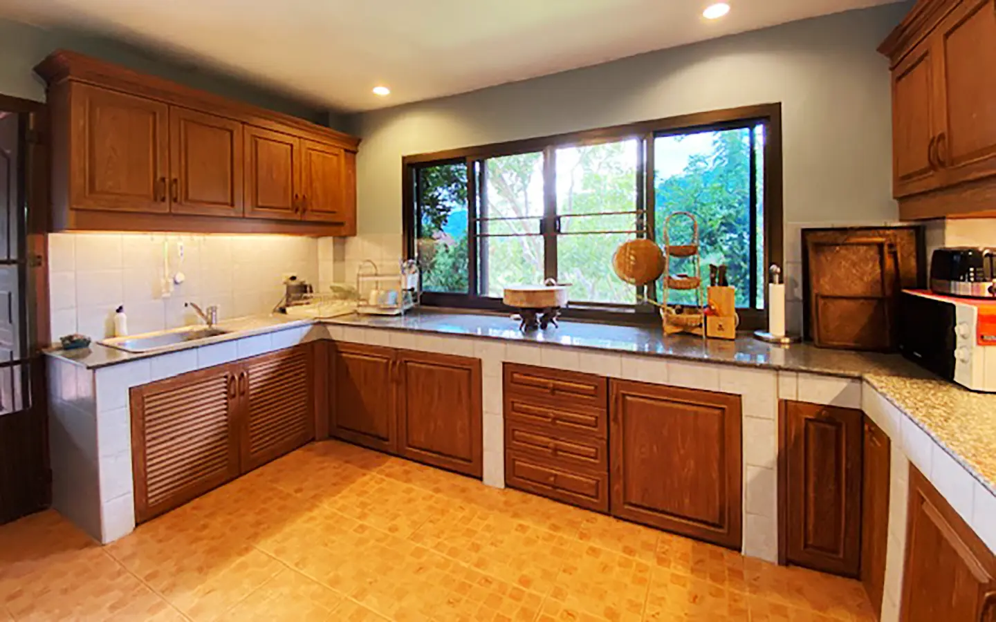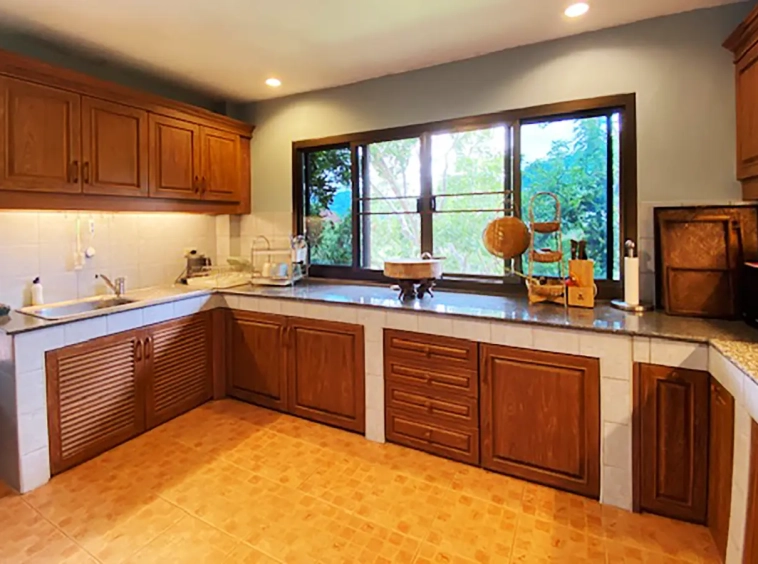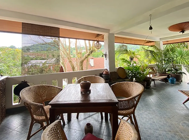 The covered porch is protected from the rain and has a charming outdoor kitchen, dining, and seating area. Because of the elevation of Pong Yang, It is cool and enjoyable to eat outside year-round.