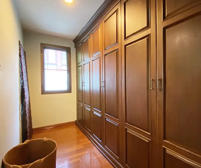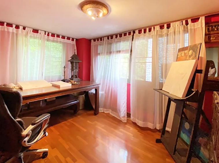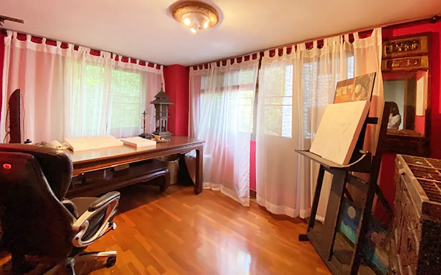 This balcony could easily be converted to an outside spa or shower. There are built-in wooden cabinets and wardrobe storage throughout the house. Across the hall from the main bedroom is a home office with mountain views from windows on three sides. The office also has a veranda.