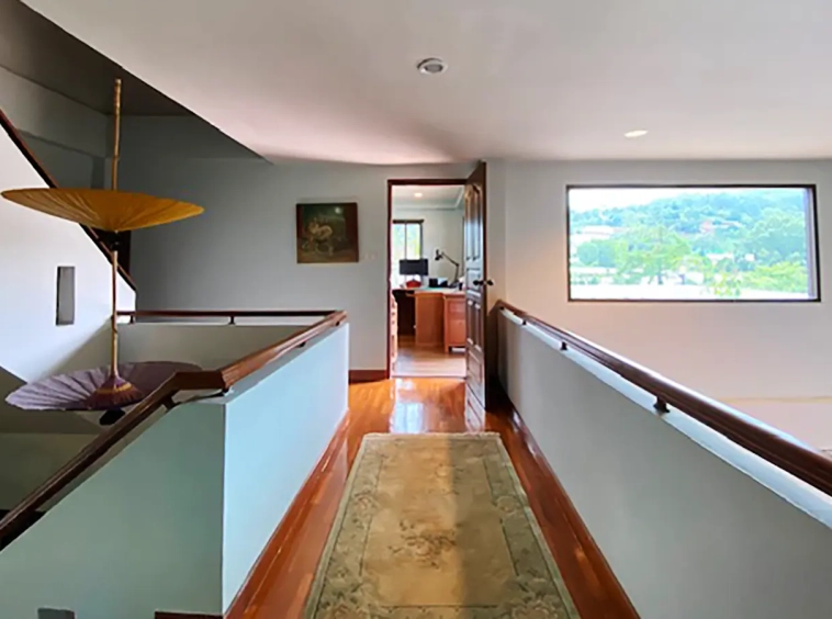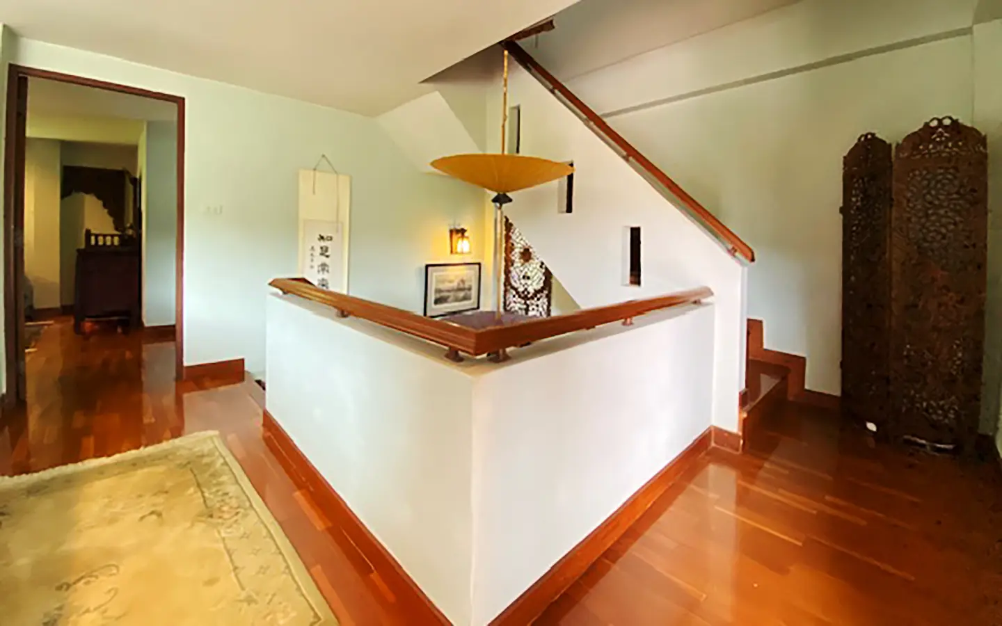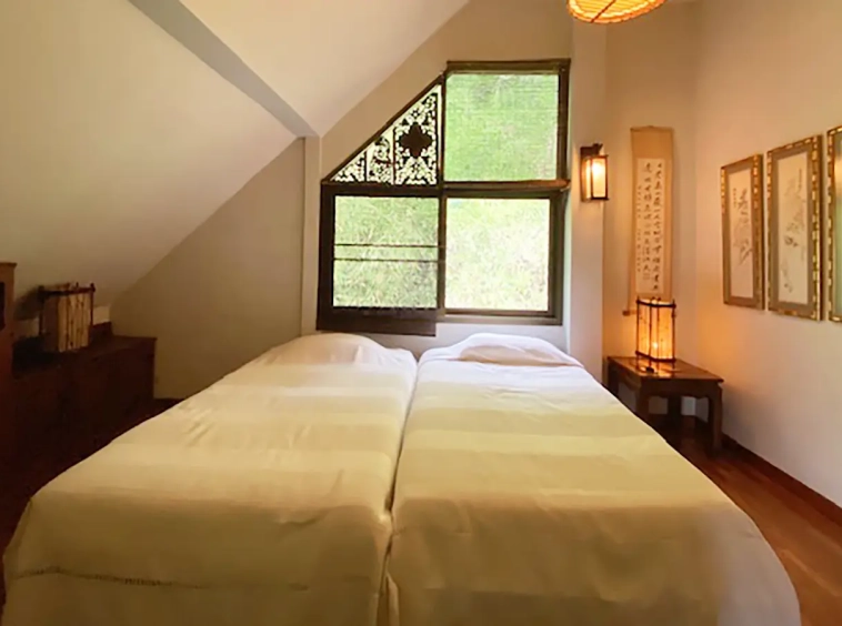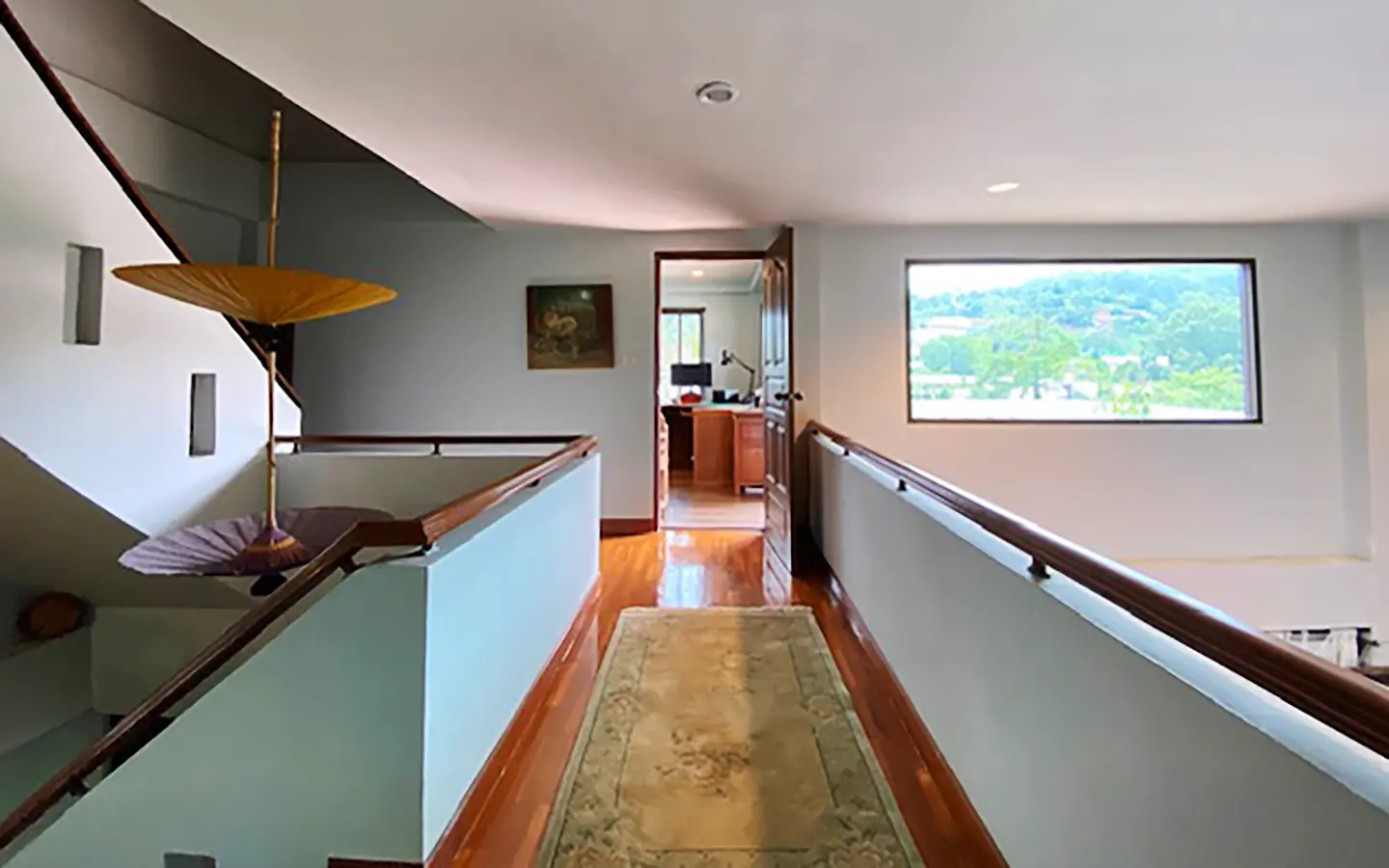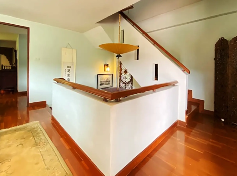 On the third floor is the master bedroom, a suite bathroom and a private balcony with views of the side garden and the hillside bamboo forest behind the house.