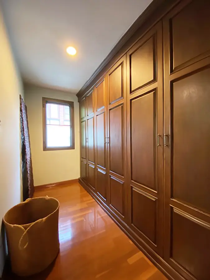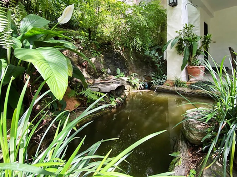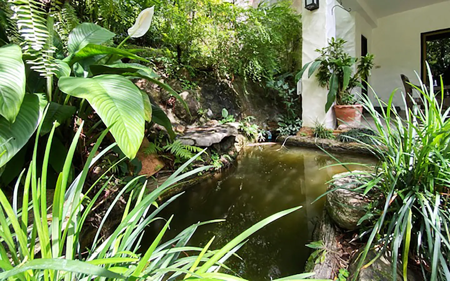 On the ground floor, past a charming fishpond, is a great room with built-in wood cabinets and a bathroom. This room can be used as a dining room or TV room. Just off this space is the indoor kitchen. It leads outside to the housekeeper's quarters and laundry area. The house has ample storage facilities.