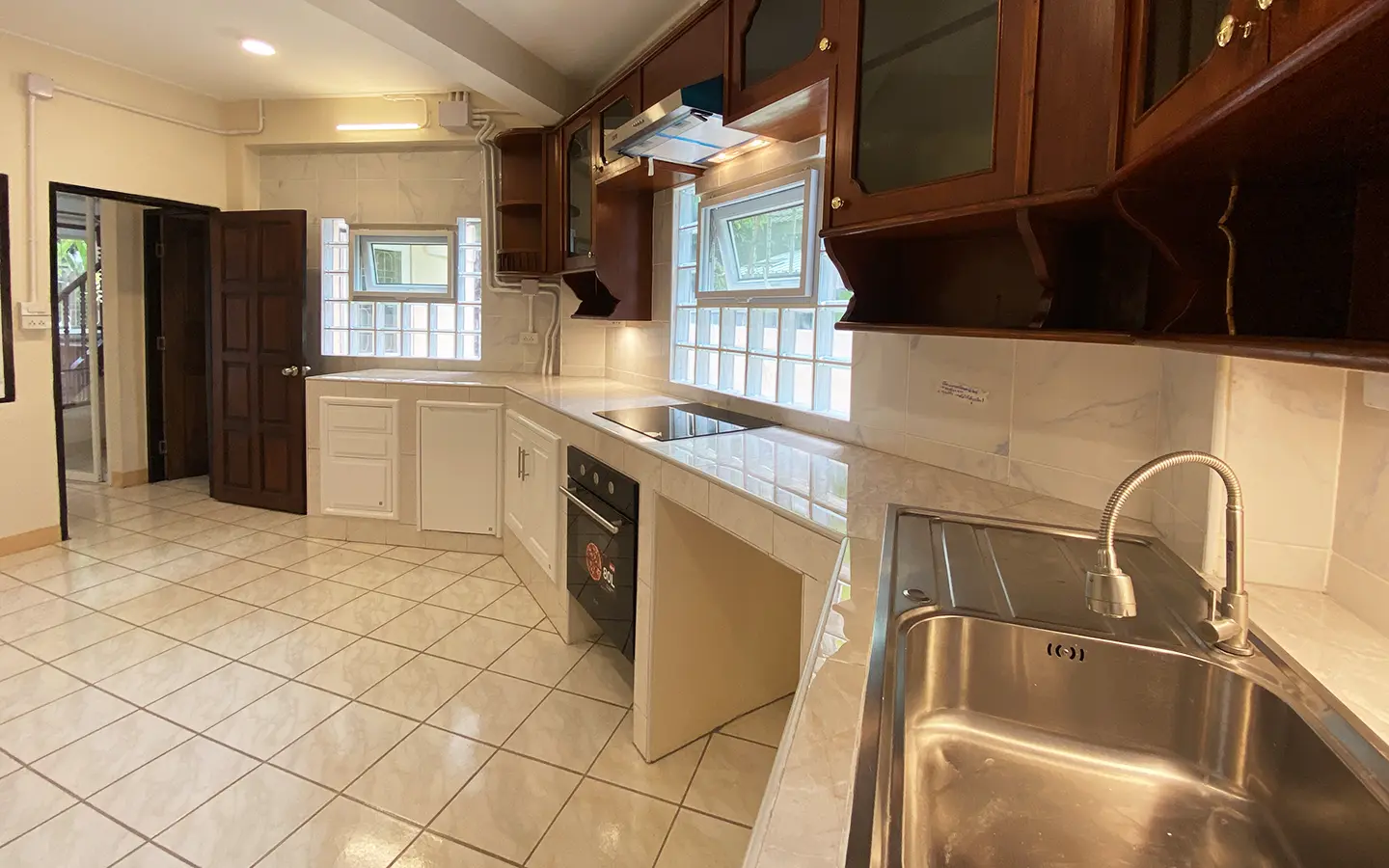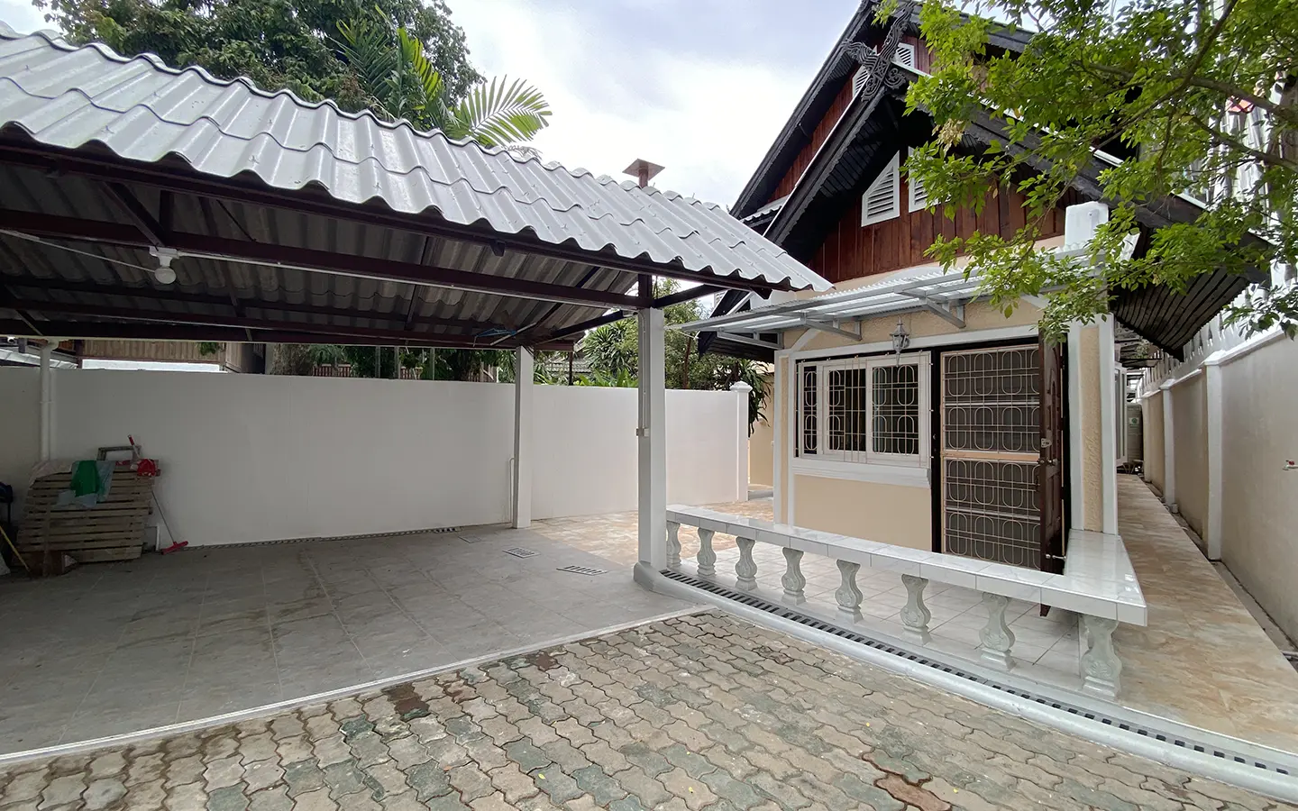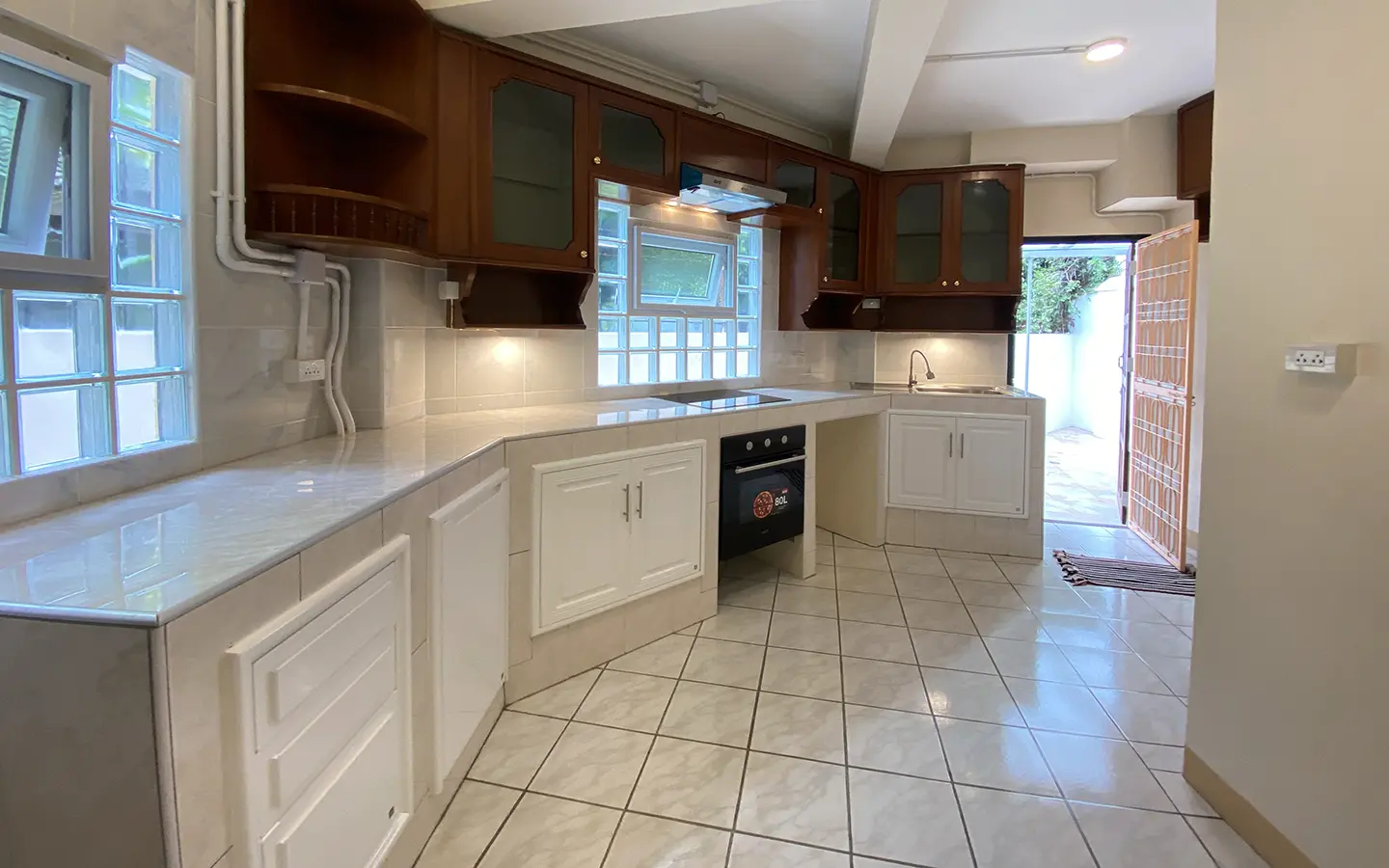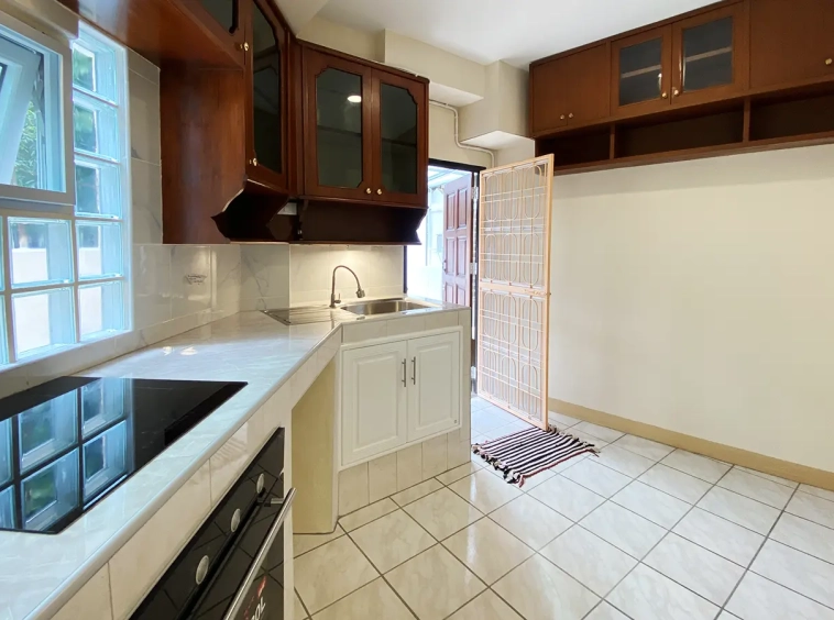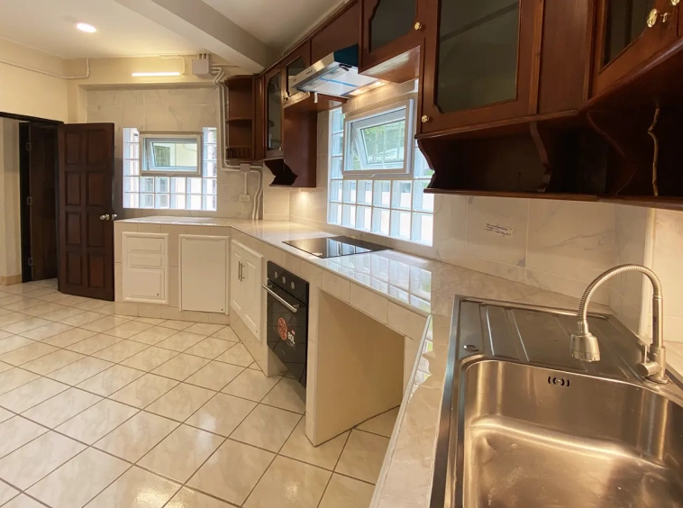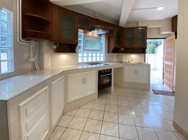The house is set a little off the street sharing the first part of driveway with another property (same landlord) then it is through to the second gate where there is a covered parking for 2/3 cars and there are 2 entrances to the house. The ground floor consists of the living room, a storage room beneath the stairs with sliding glass doors to keep the cool air in, the study or fourth bedroom with a bathroom. Back to the corridor leads to the spacious fully fitted Western kitchen with built-in oven and space for a breakfast table as well as access to the outside laundry area where the washing machine is located. Lovely tile flooring throughout.