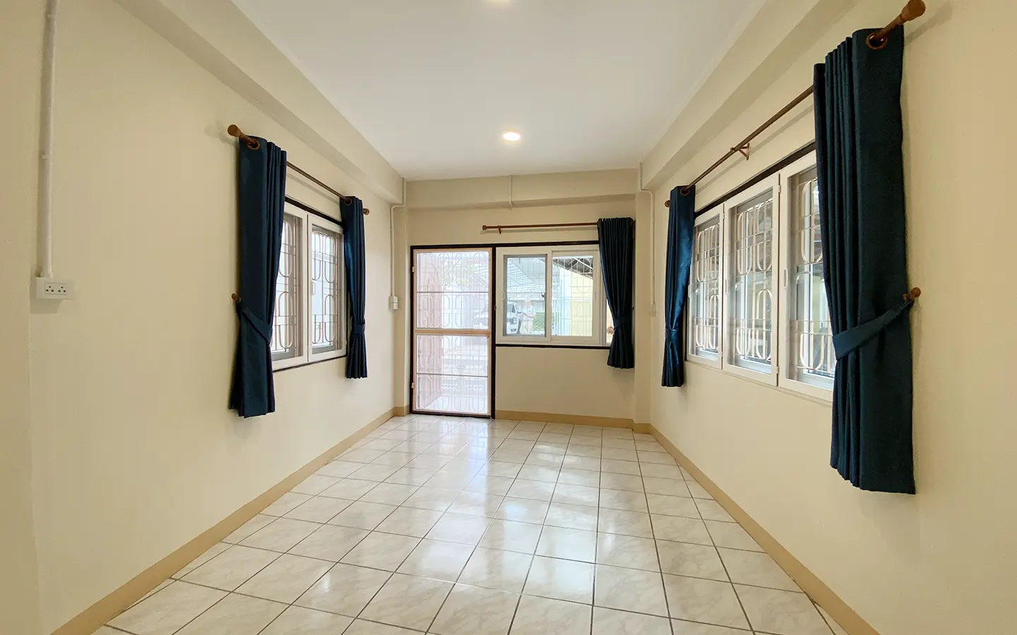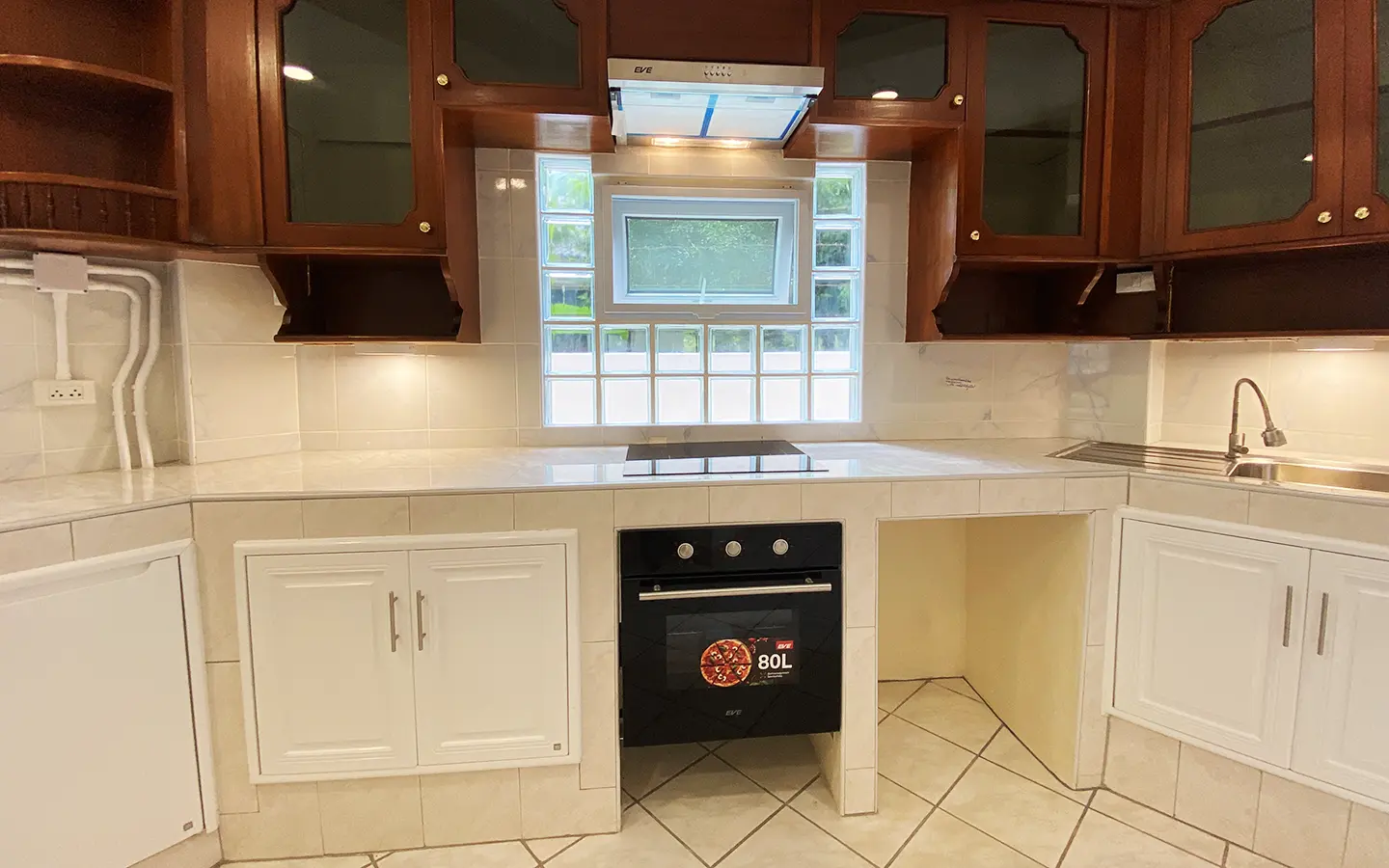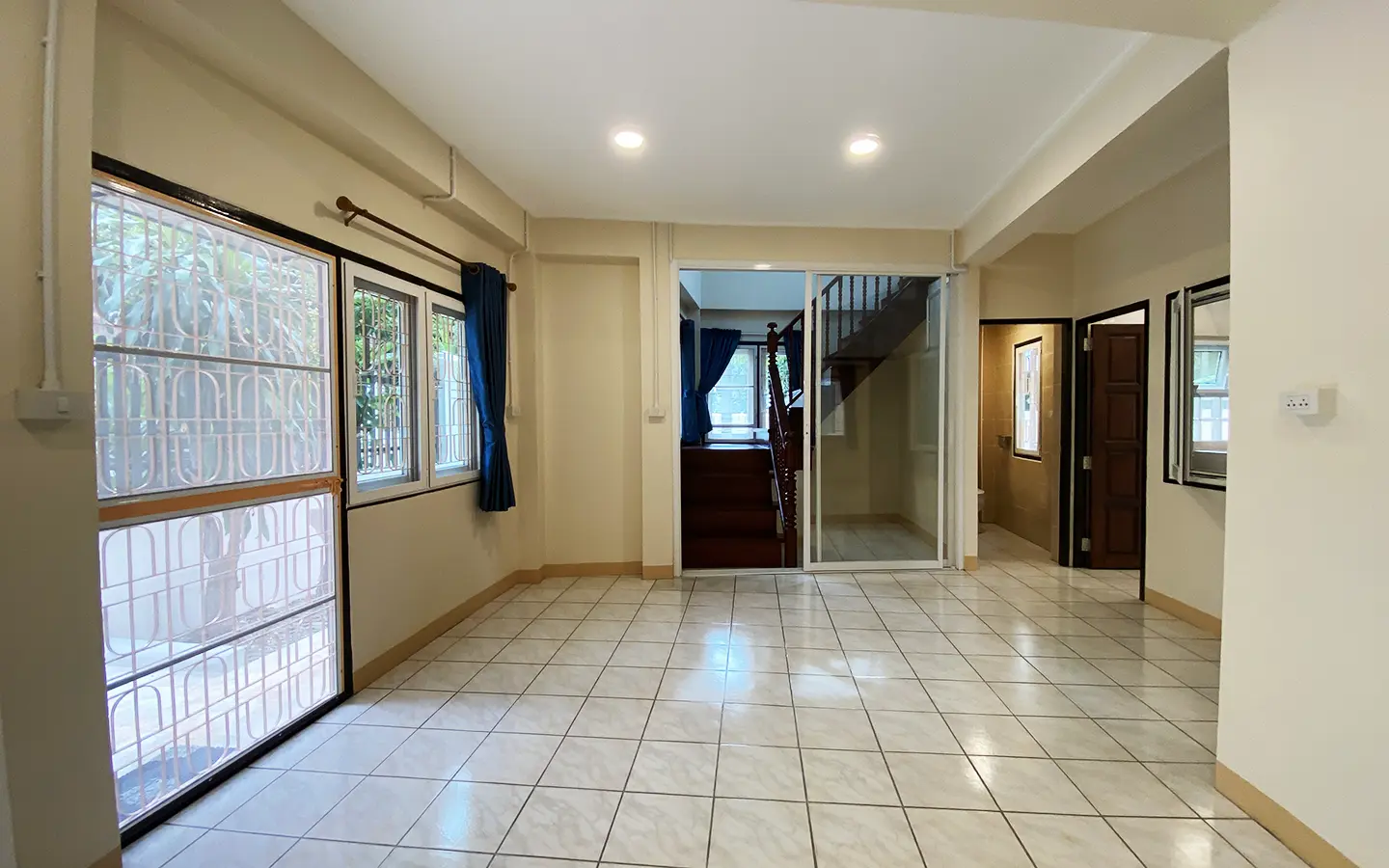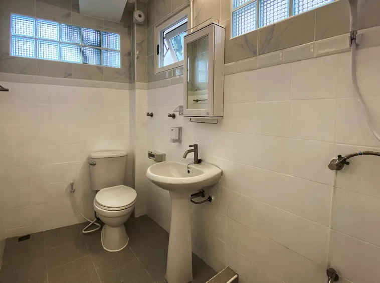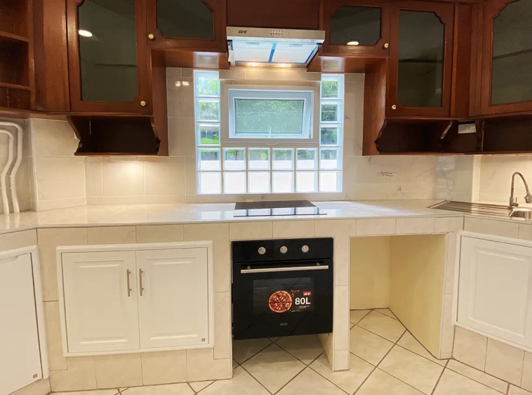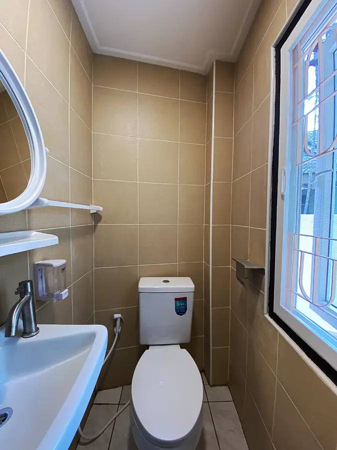 The house is set a little off the street sharing the first part of driveway with another property (same landlord) then it is through to the second gate where there is a covered parking for 2/3 cars and there are 2 entrances to the house. The ground floor consists of the living room, a storage room beneath the stairs with sliding glass doors to keep the cool air in, the study or fourth bedroom with a bathroom. Back to the corridor leads to the spacious fully fitted Western kitchen with built-in oven and space for a breakfast table as well as access to the outside laundry area where the washing machine is located. Lovely tile flooring throughout.
