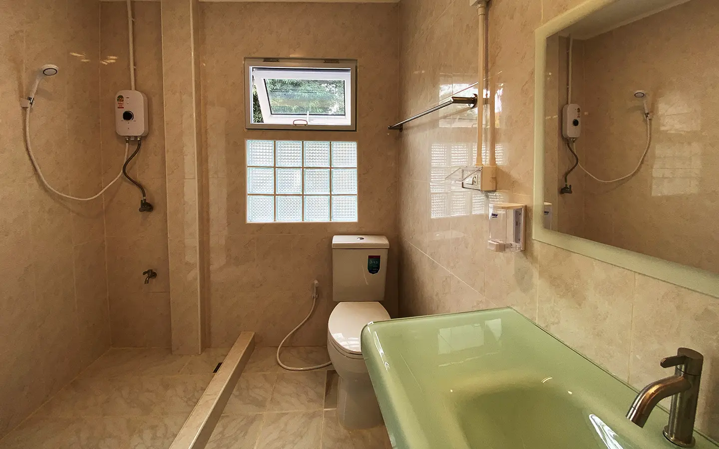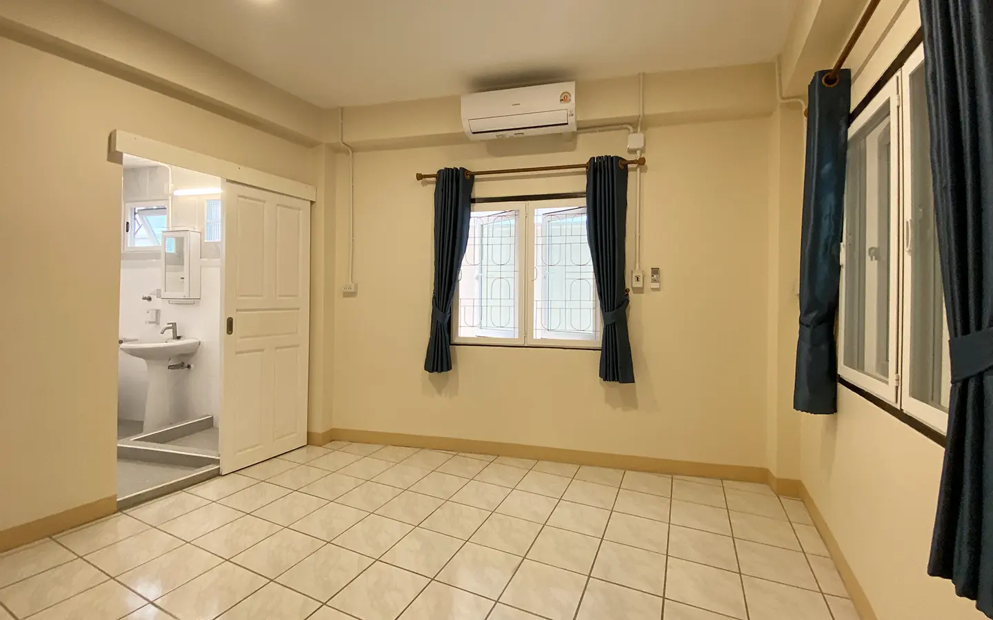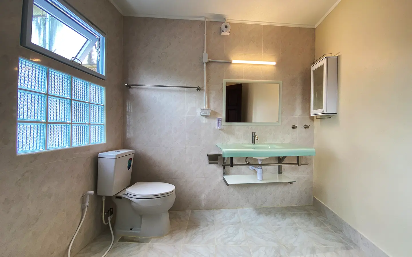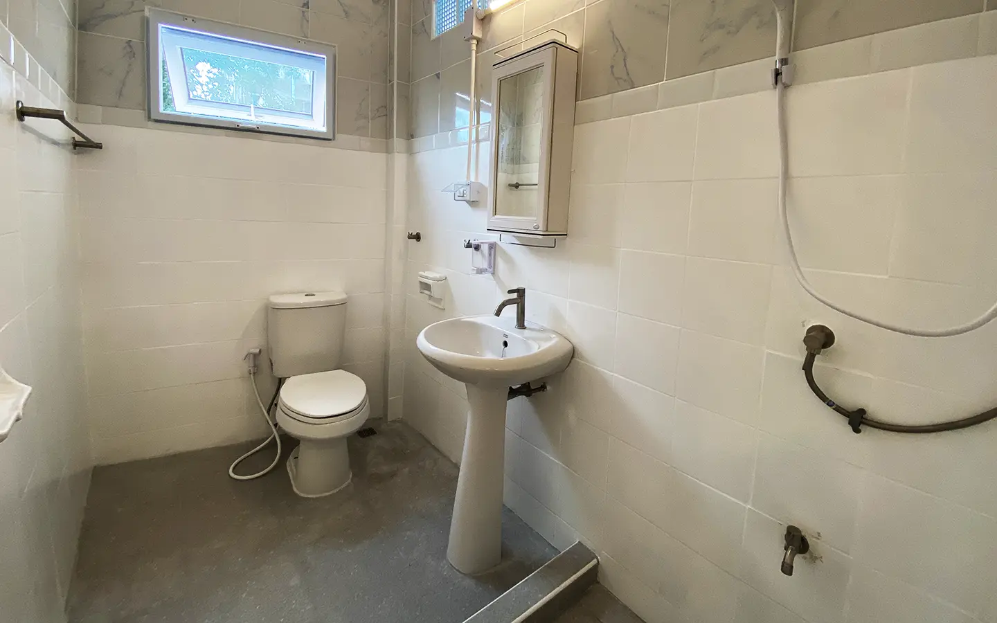 The house is set a little off the street sharing the first part of driveway with another property (same landlord) then it is through to the second gate where there is a covered parking for 2/3 cars and there are 2 entrances to the house. The ground floor consists of the living room, a storage room beneath the stairs with sliding glass doors to keep the cool air in, the study or fourth bedroom with a bathroom. Back to the corridor leads to the spacious fully fitted Western kitchen with built-in oven and space for a breakfast table as well as access to the outside laundry area where the washing machine is located. Lovely tile flooring throughout.