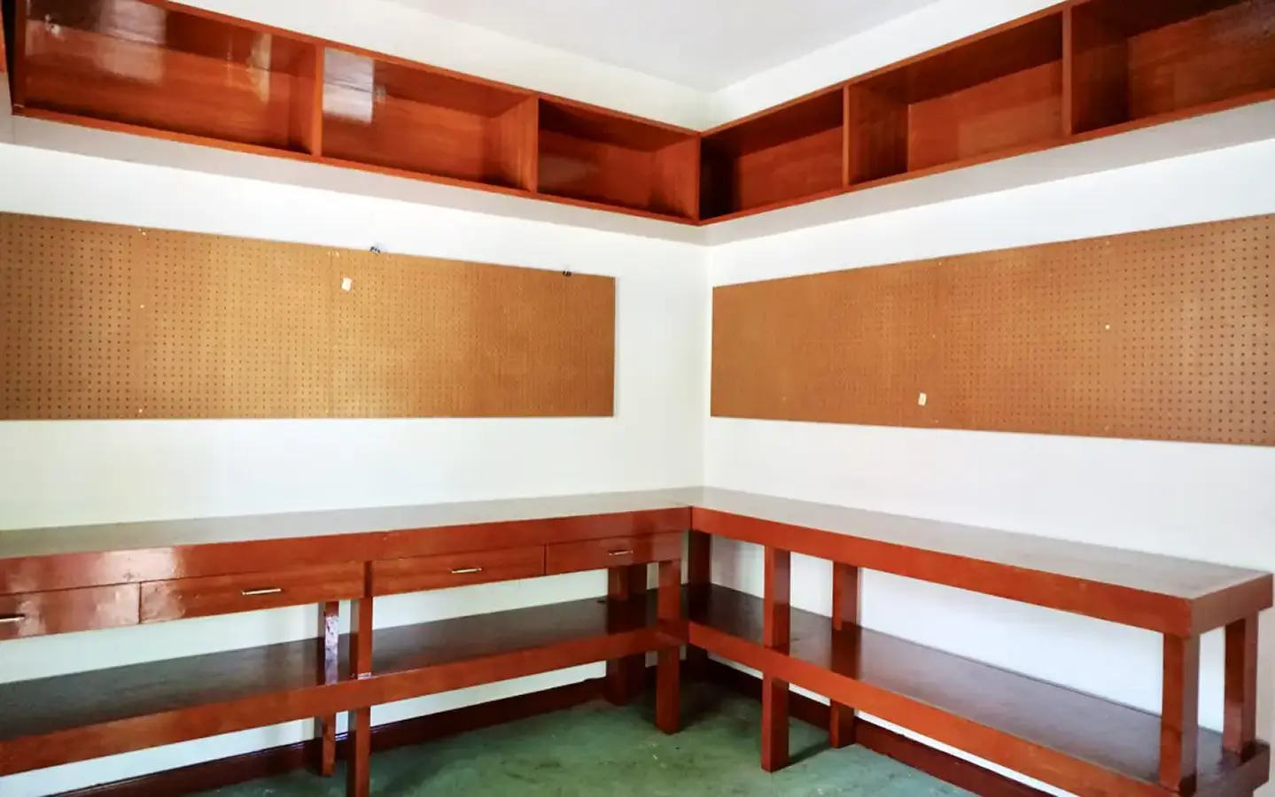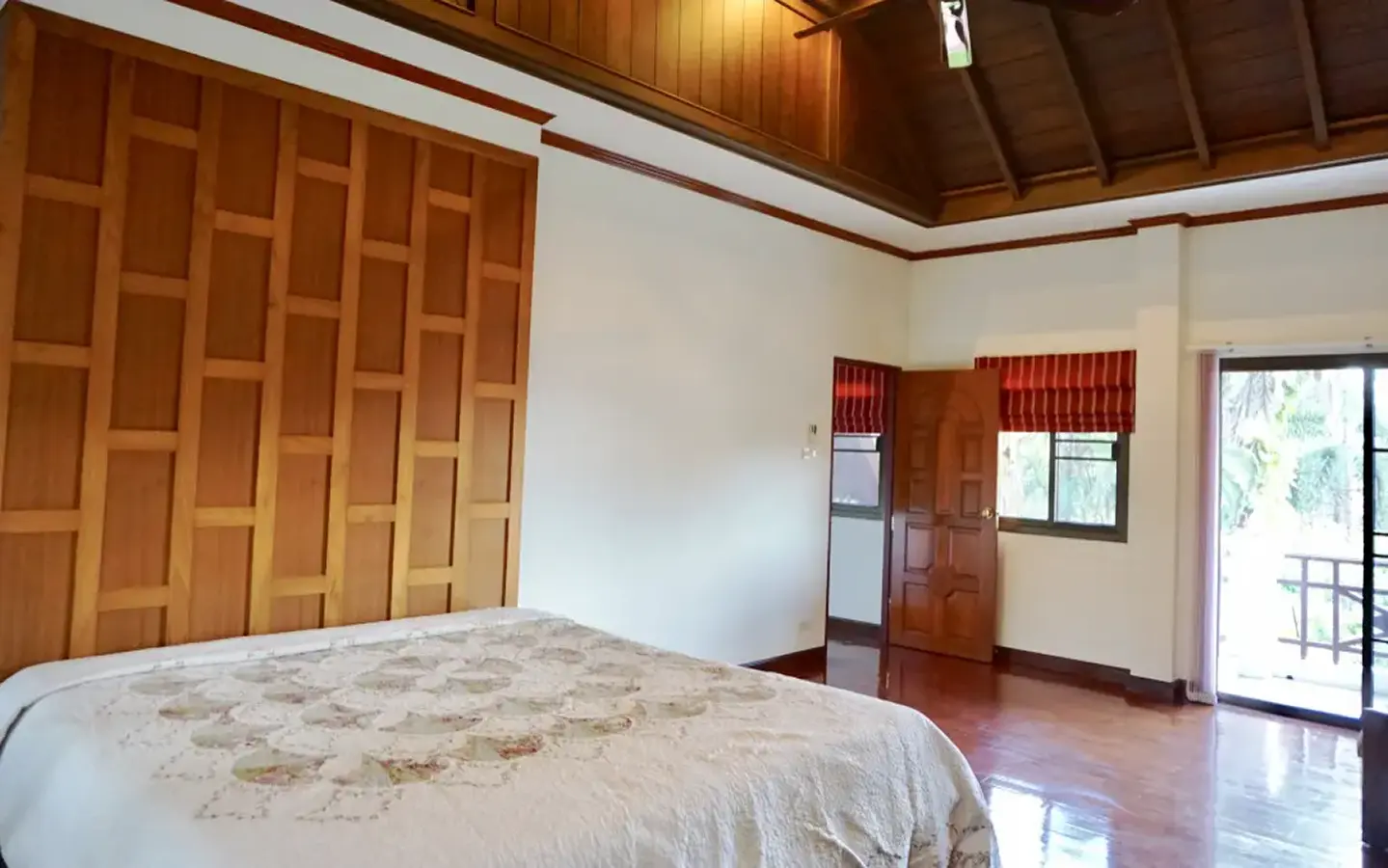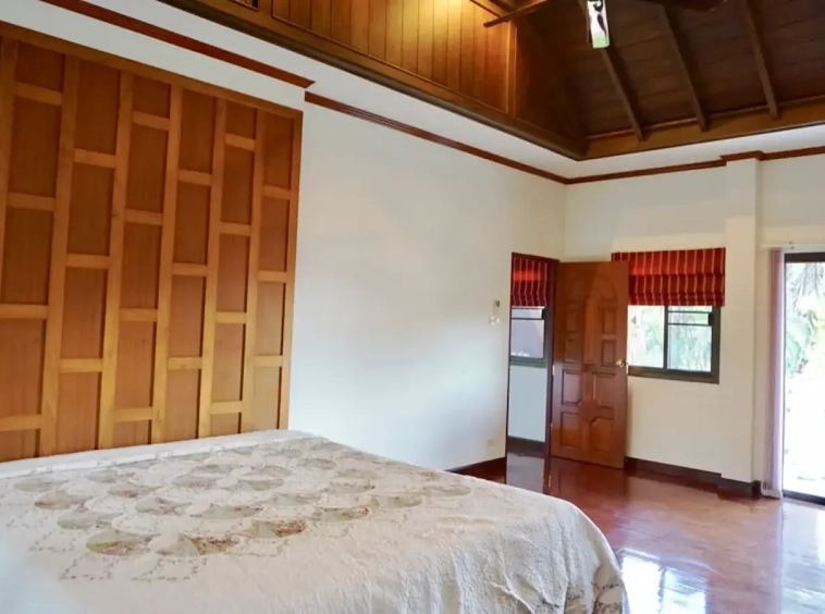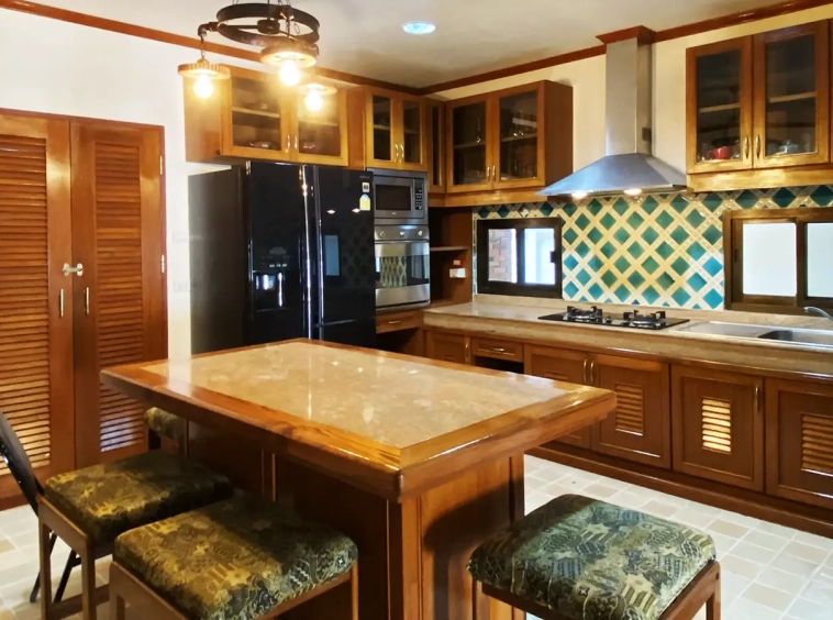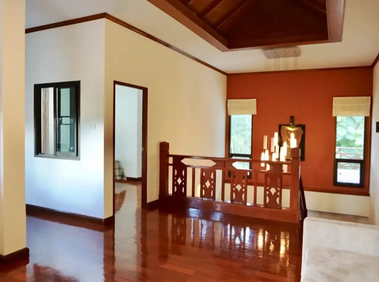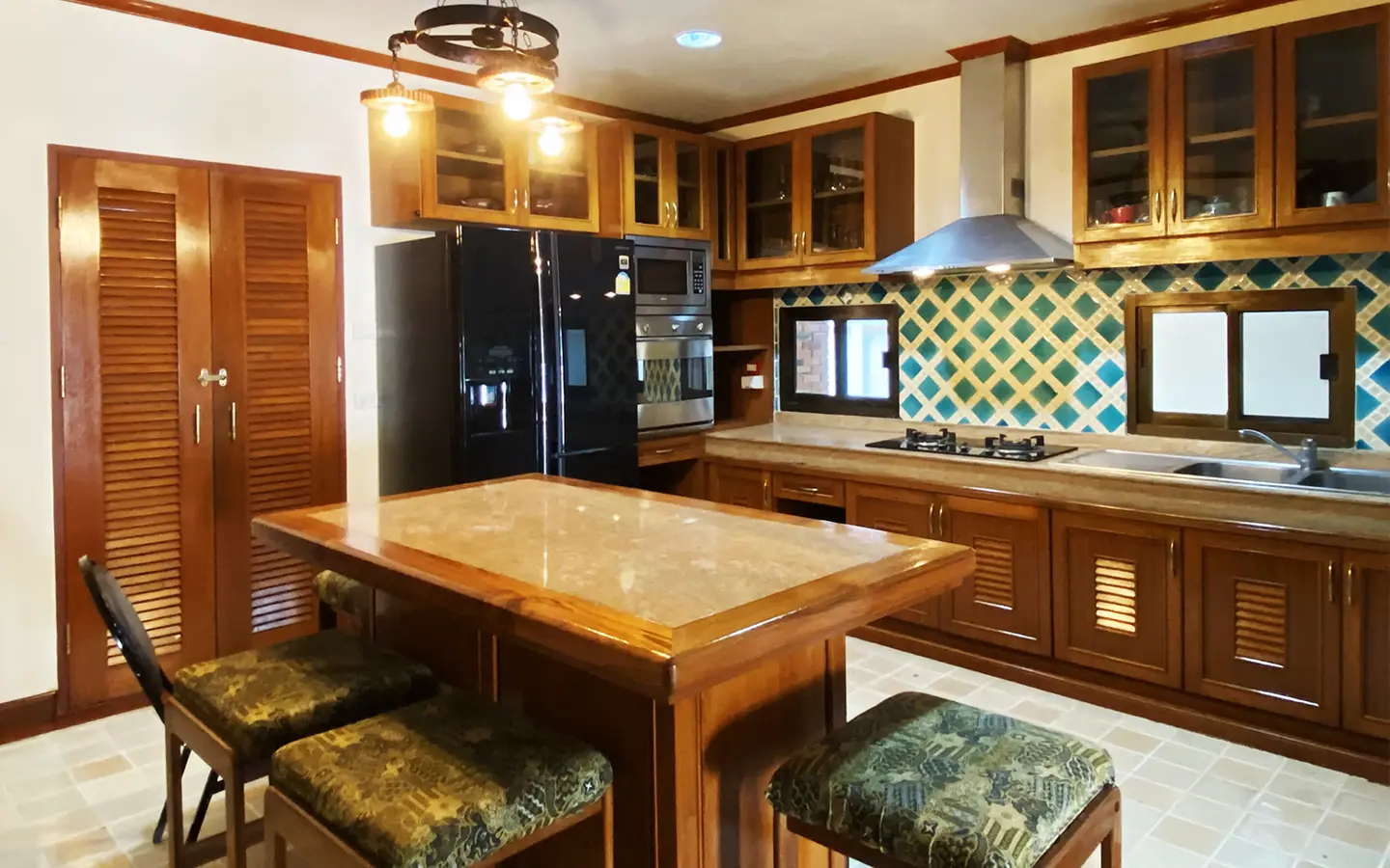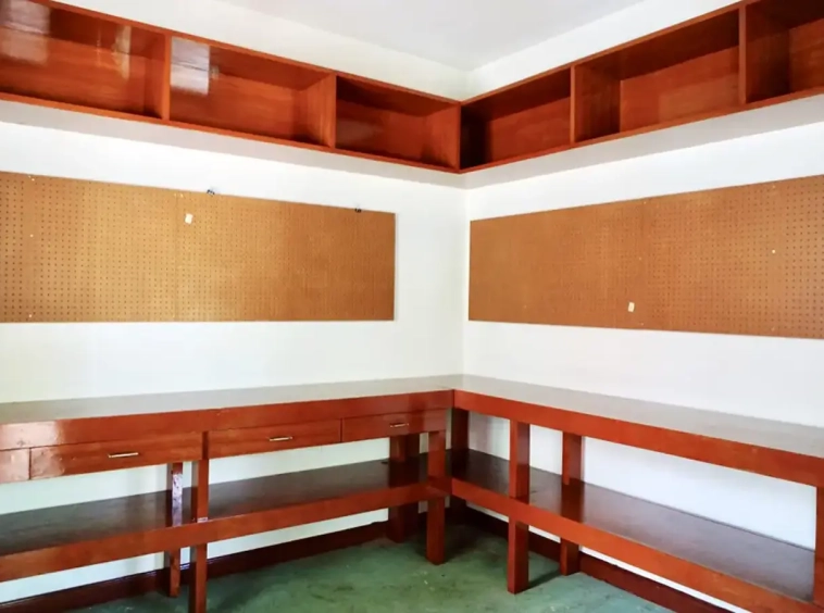 The rear side of the house includes a covered Thai kitchen, a workshop/storage room, and a maid’s room with ensuite.