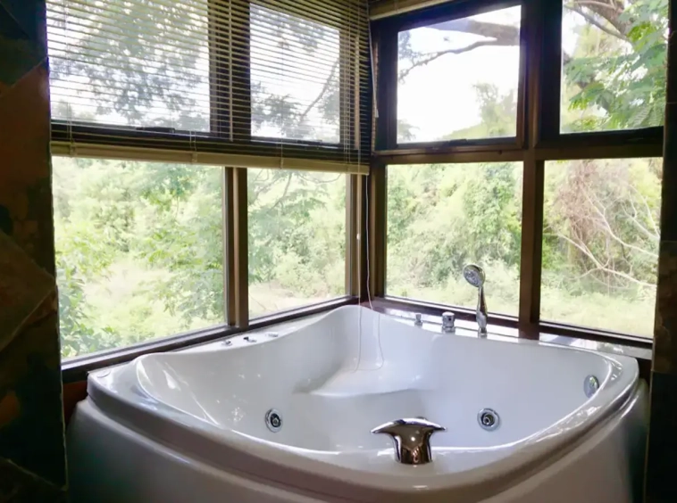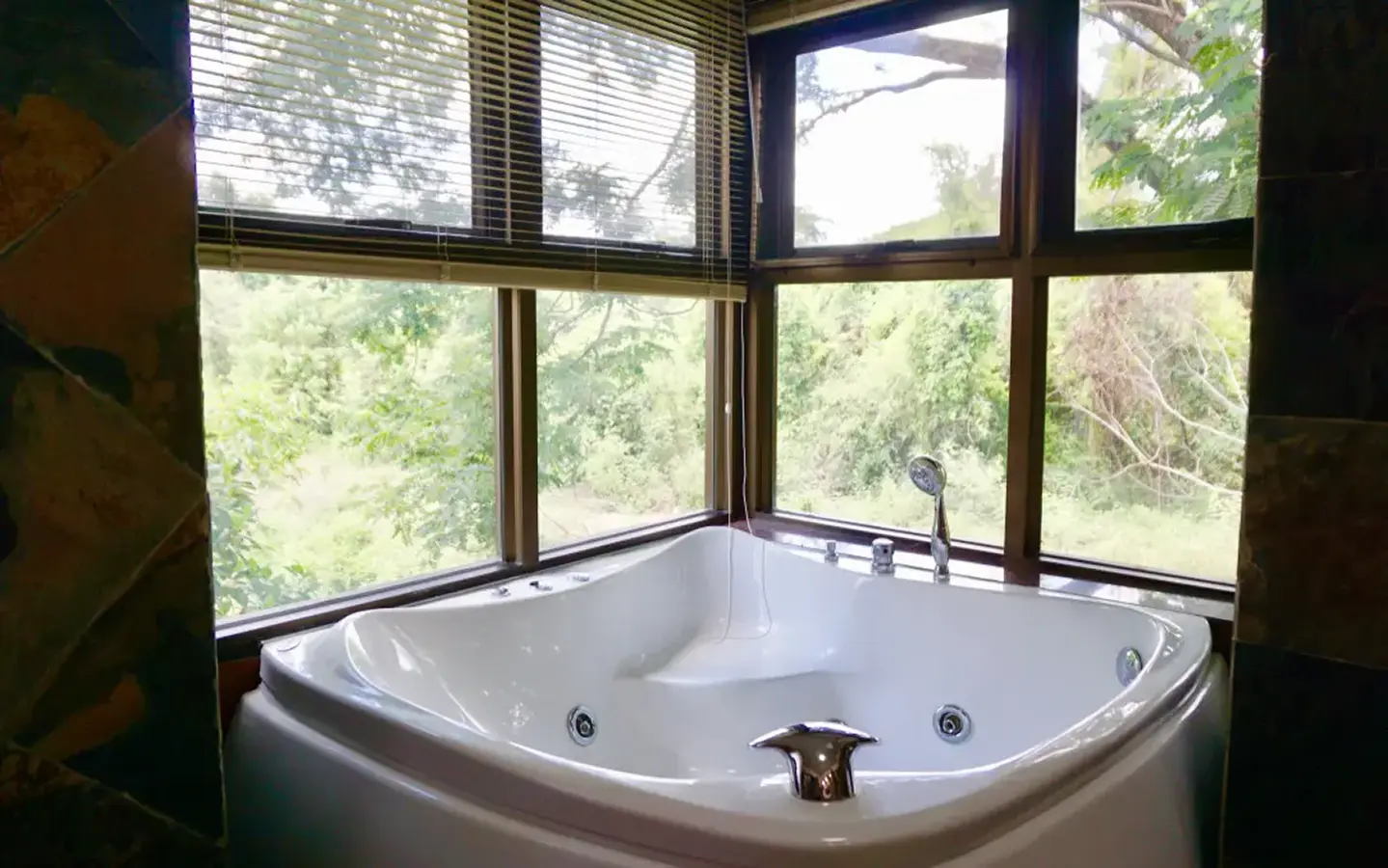 A standalone yoga building with its own bathroom and A/C can be converted into a home office or studio. The home also includes a large covered carport and a water feature garden at the front entrance, with additional space used for outdoor seating.