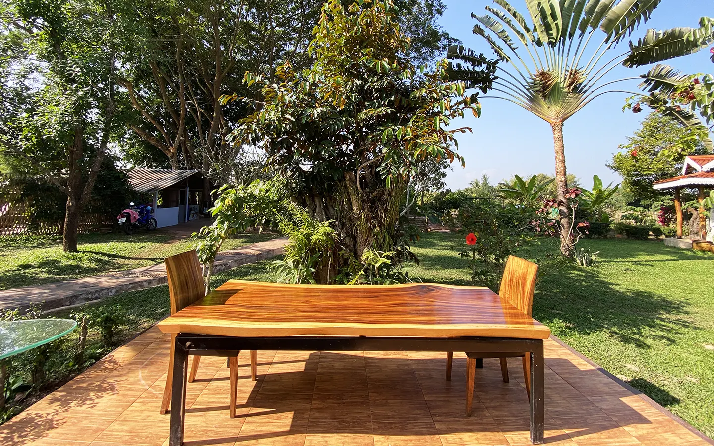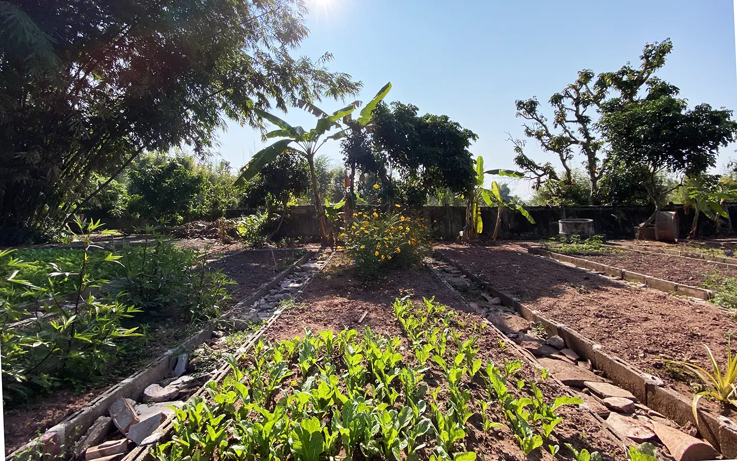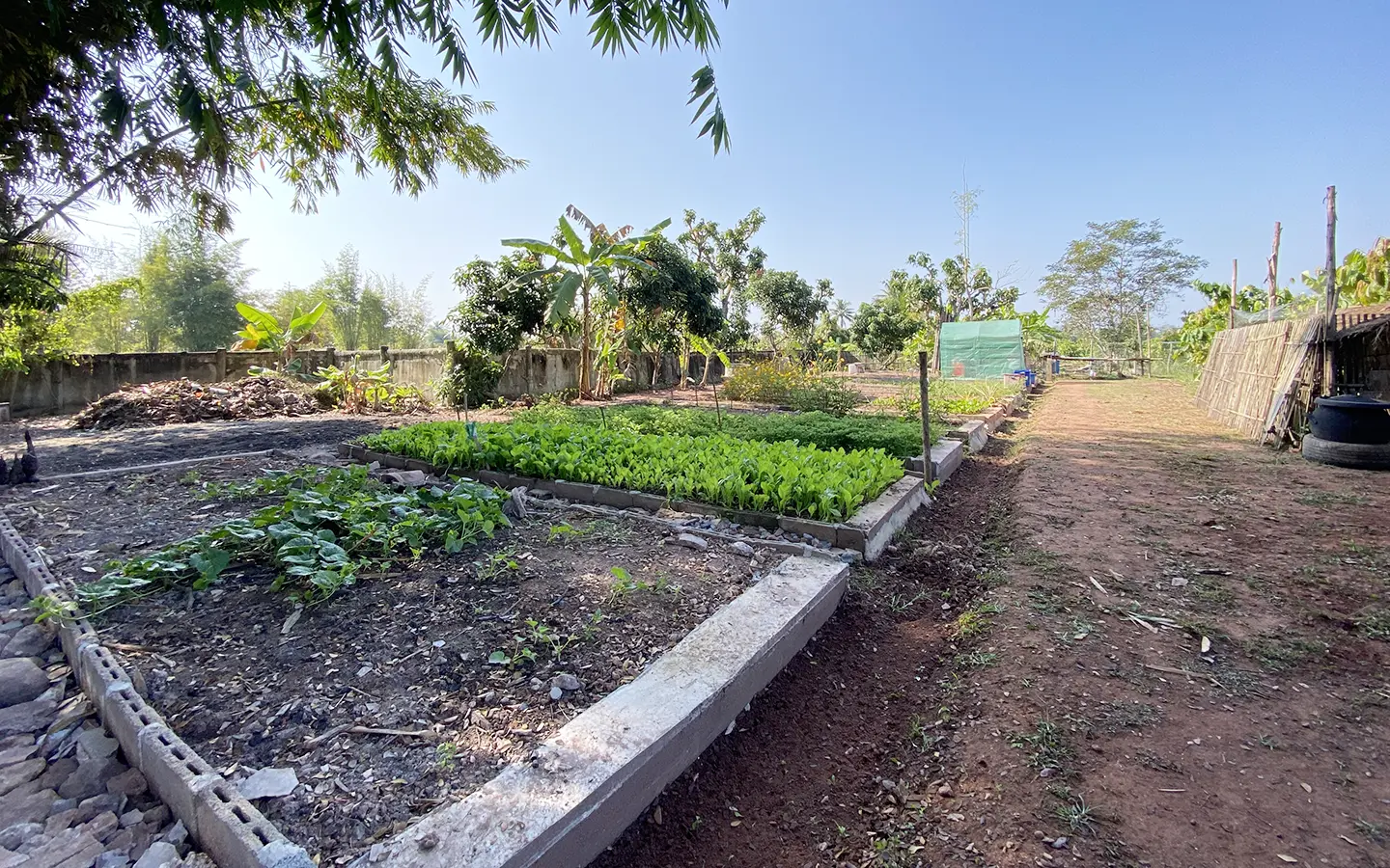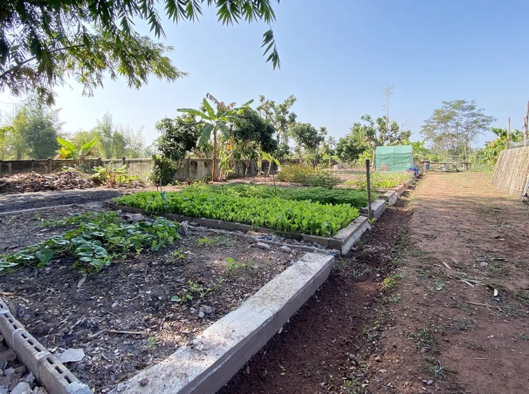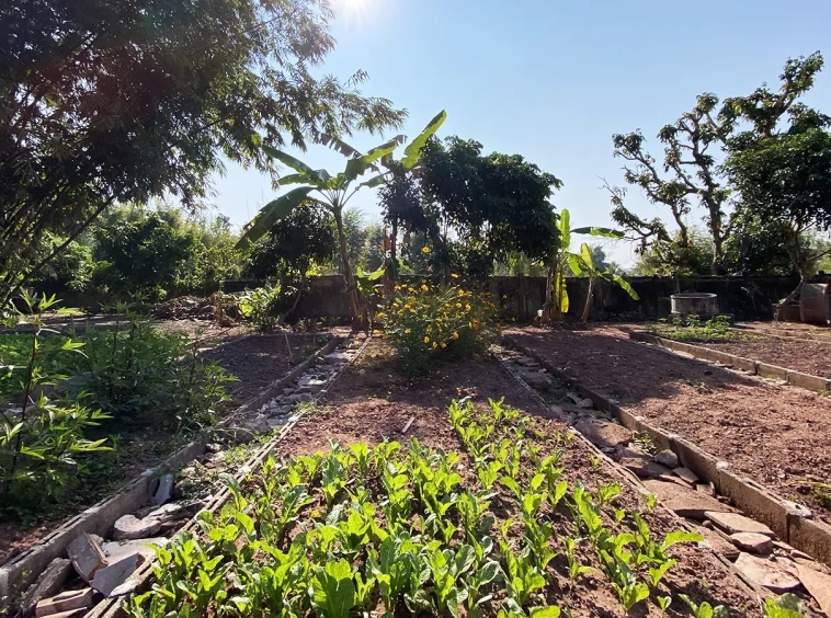 The workshop building houses all gardening tools and equipment. The vegetable garden consists of vegetables, bananas and cocoa plants.