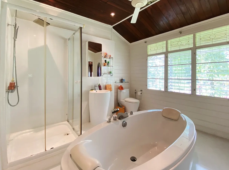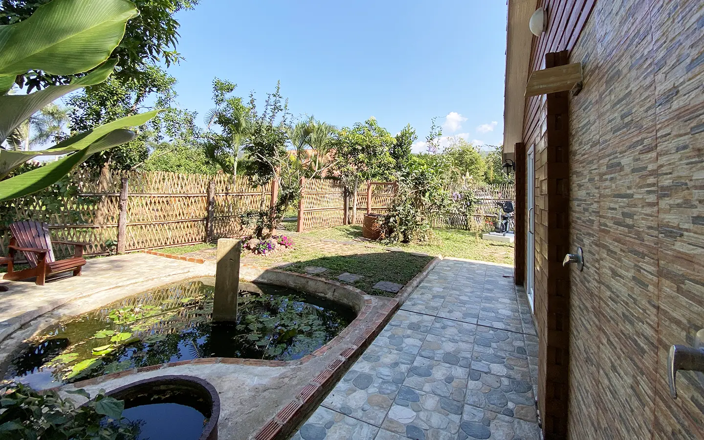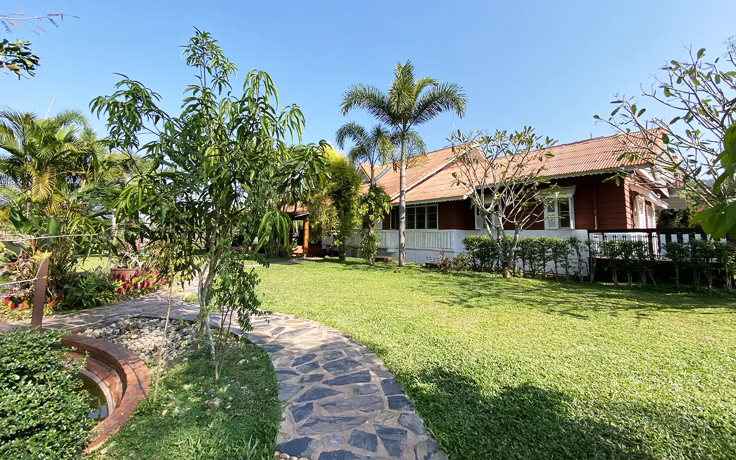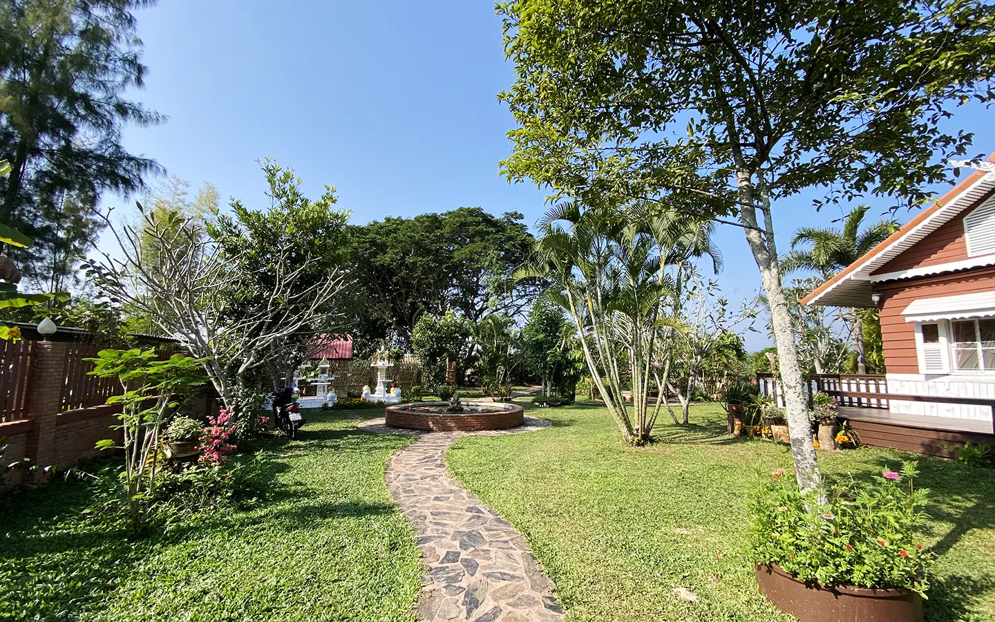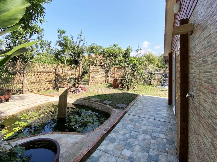 The spacious sitting area has a tall glass ceiling for natural light, on the right is the study, bedroom 1 and 2 share the guest bathroom and then it is the dining area. To the left of the sitting room is the master bedroom which comes with built-in wardrobes and ensuite with a jacuzzi and a separate shower. The bedrooms are nice and light with white wooden walls. A sliding door to the fully fitted Western kitchen has door access to the terrace. The large landscaped garden is well maintained with lawn, palm and other tropical trees and features a fish pond, a bridge and a cozy BBQ area. A small stream from the dam flows through the entire landscape.