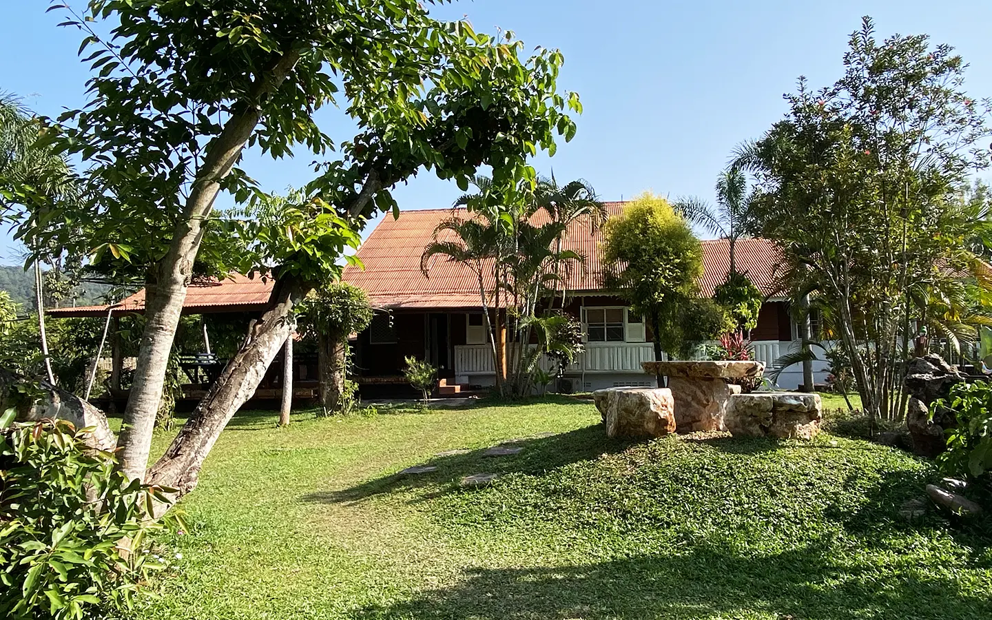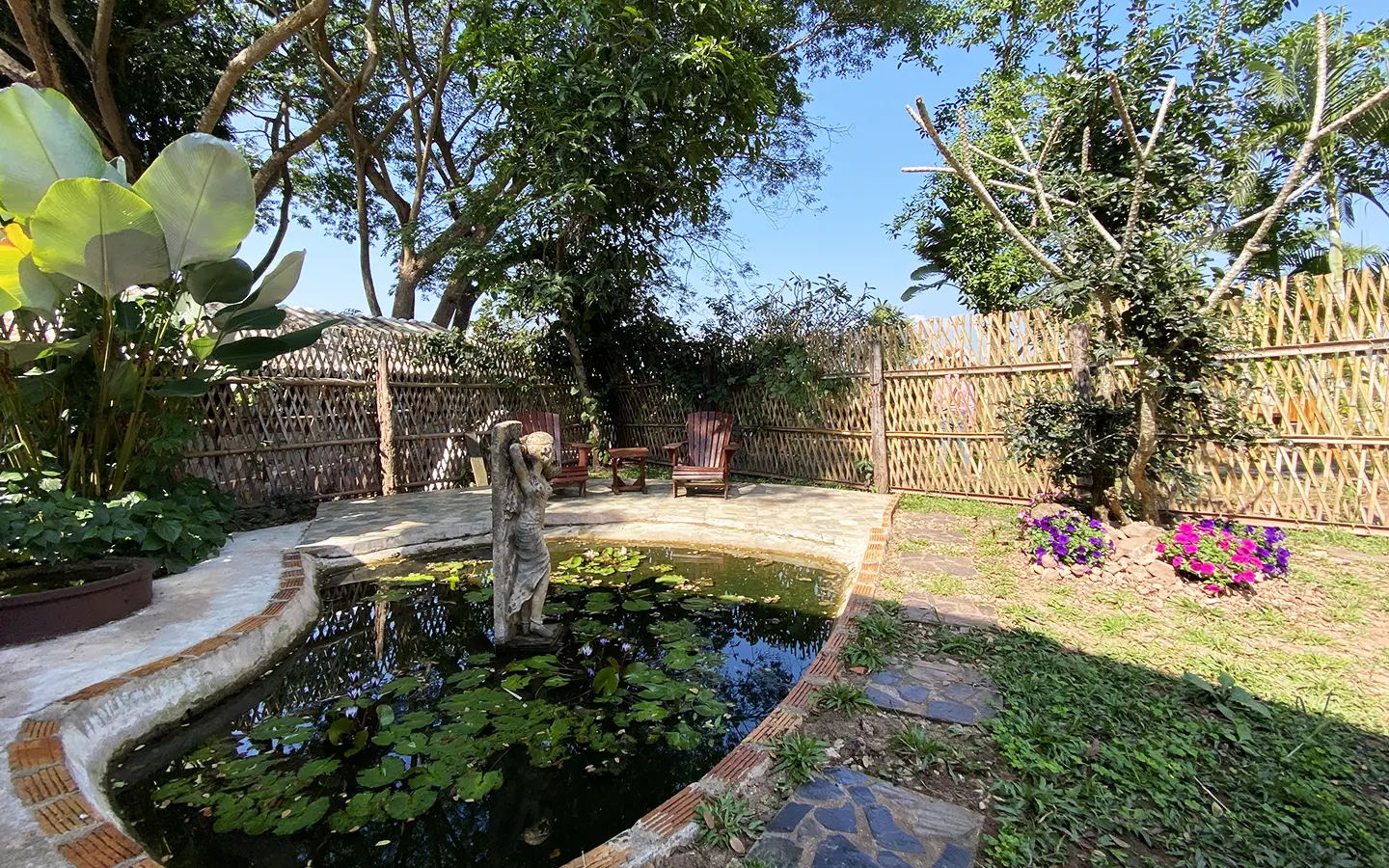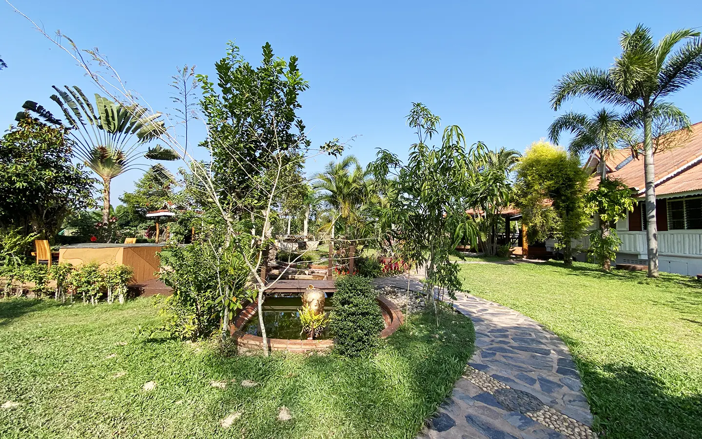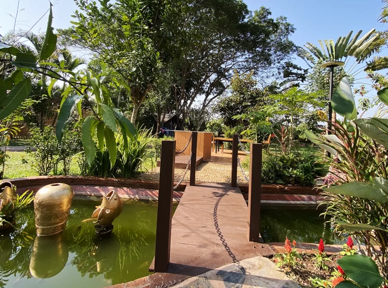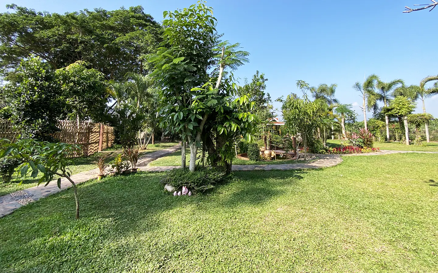 The spacious sitting area has a tall glass ceiling for natural light, on the right is the study, bedroom 1 and 2 share the guest bathroom and then it is the dining area. To the left of the sitting room is the master bedroom which comes with built-in wardrobes and ensuite with a jacuzzi and a separate shower. The bedrooms are nice and light with white wooden walls. A sliding door to the fully fitted Western kitchen has door access to the terrace. The large landscaped garden is well maintained with lawn, palm and other tropical trees and features a fish pond, a bridge and a cozy BBQ area. A small stream from the dam flows through the entire landscape.