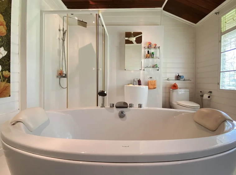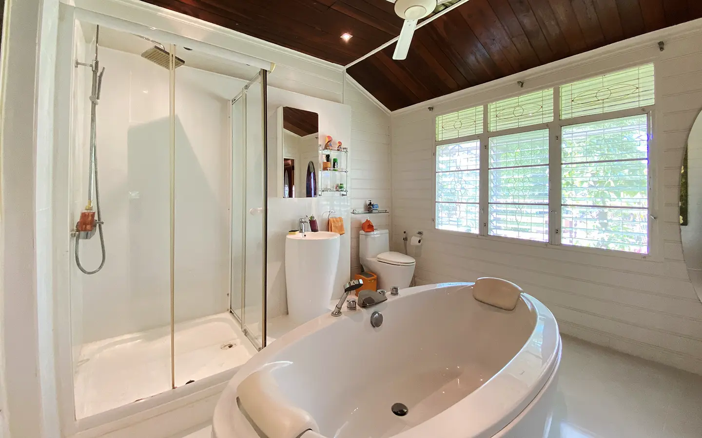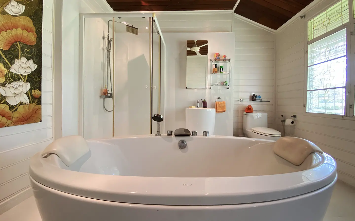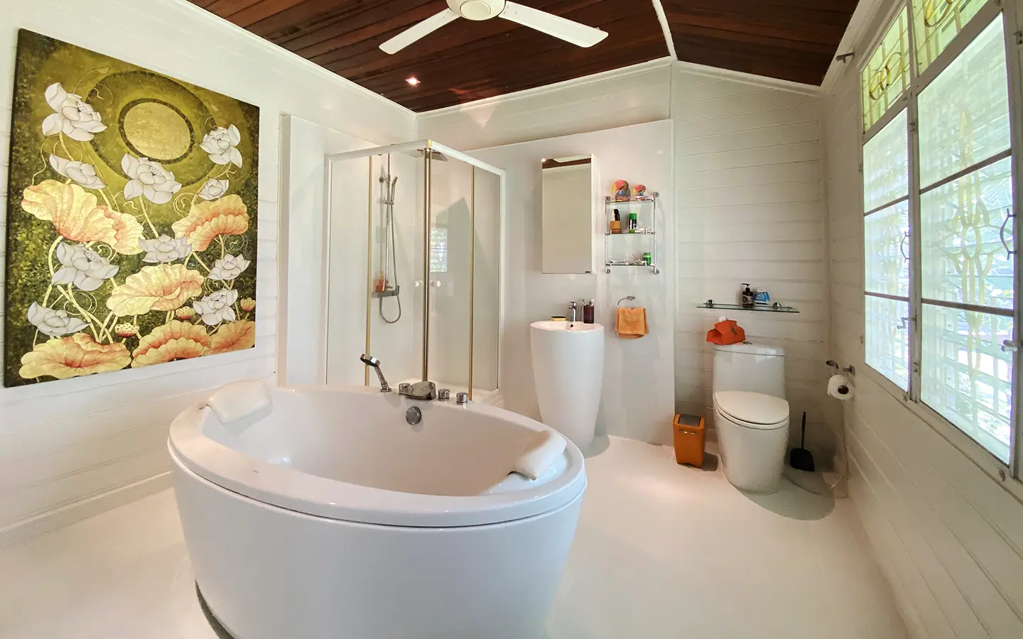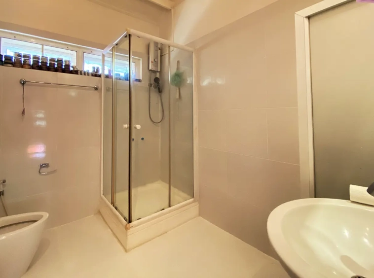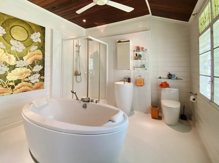 The spacious sitting area has a tall glass ceiling for natural light, on the right is the study, bedroom 1 and 2 share the guest bathroom and then it is the dining area. To the left of the sitting room is the master bedroom which comes with built-in wardrobes and ensuite with a jacuzzi and a separate shower. The bedrooms are nice and light with white wooden walls. A sliding door to the fully fitted Western kitchen has door access to the terrace. The large landscaped garden is well maintained with lawn, palm and other tropical trees and features a fish pond, a bridge and a cozy BBQ area. A small stream from the dam flows through the entire landscape.