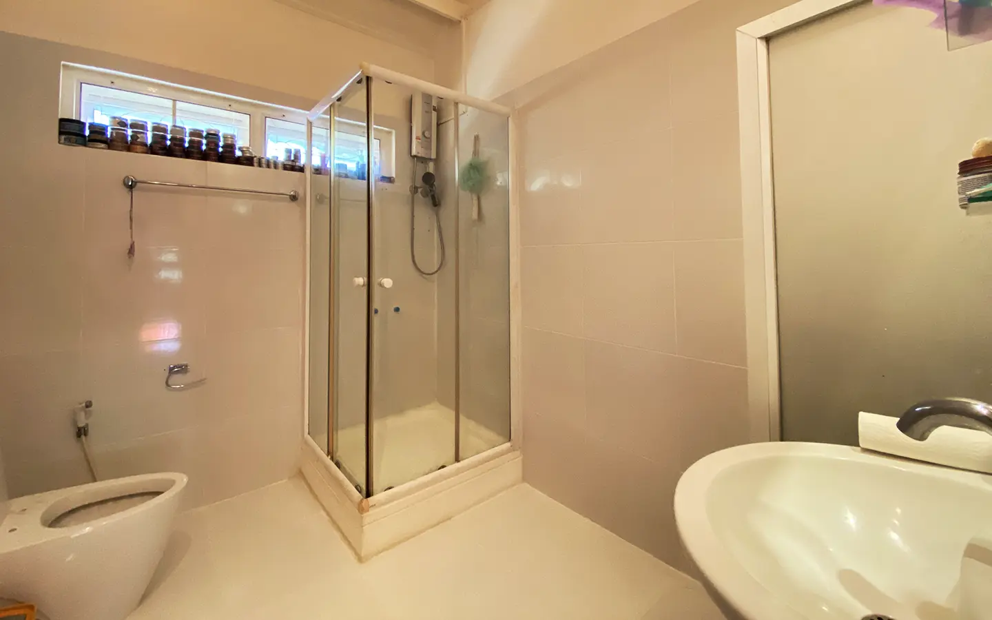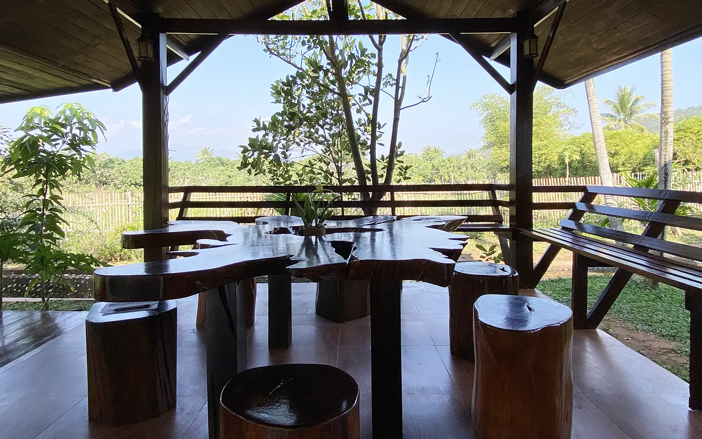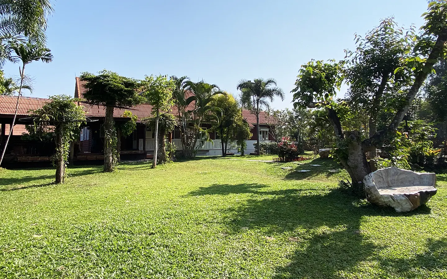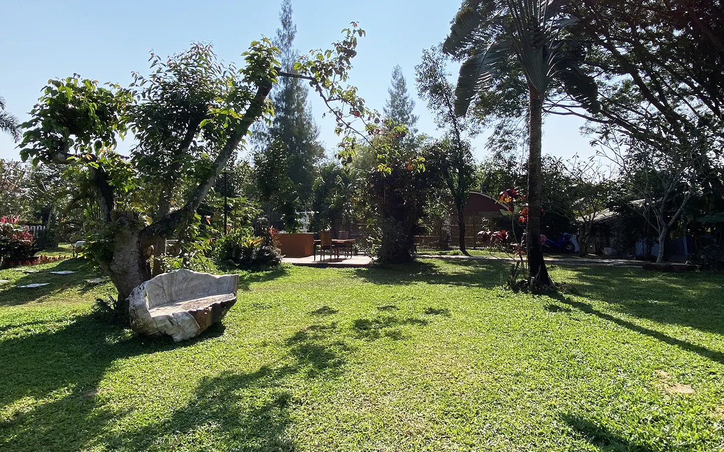 The spacious sitting area has a tall glass ceiling for natural light, on the right is the study, bedroom 1 and 2 share the guest bathroom and then it is the dining area. To the left of the sitting room is the master bedroom which comes with built-in wardrobes and ensuite with a jacuzzi and a separate shower. The bedrooms are nice and light with white wooden walls. A sliding door to the fully fitted Western kitchen has door access to the terrace. The large landscaped garden is well maintained with lawn, palm and other tropical trees and features a fish pond, a bridge and a cozy BBQ area. A small stream from the dam flows through the entire landscape.
